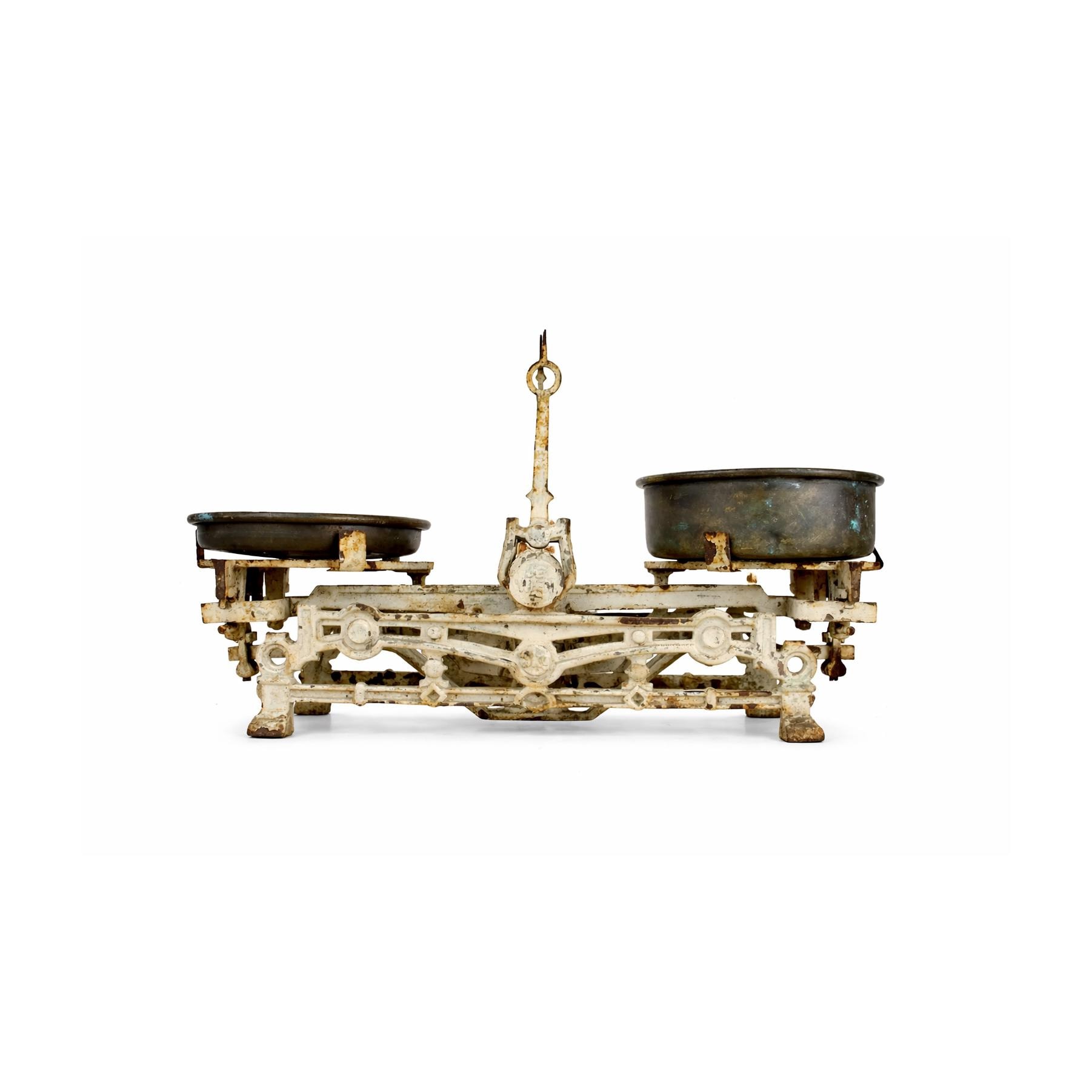 A beautiful antique cast iron grocery balance scale made in Vienna, Austria, featuring elegant Victorian-era industrial design and wonderful aged patina.