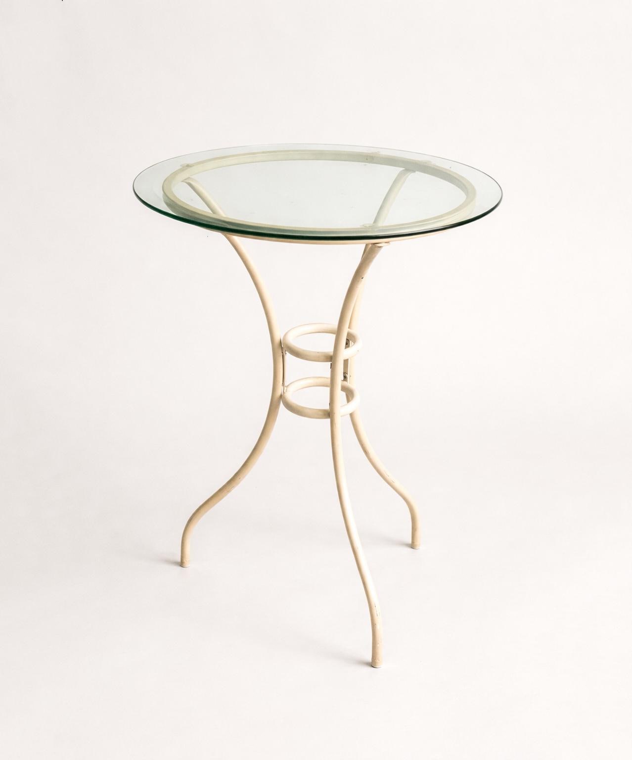Lovely authentic vintage round table from the 1960s, featuring a sculptural cream-painted metal base and a circular glass top.