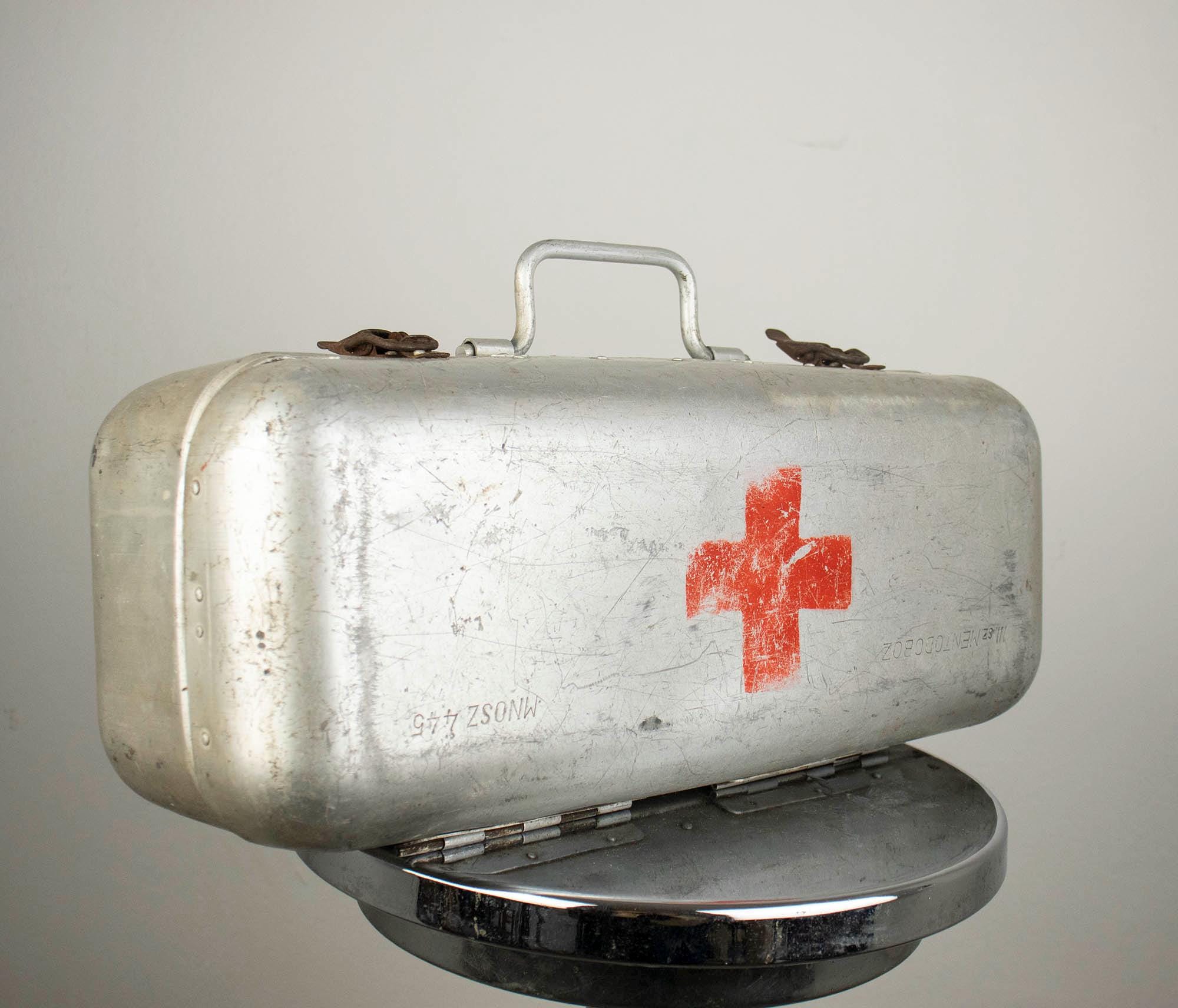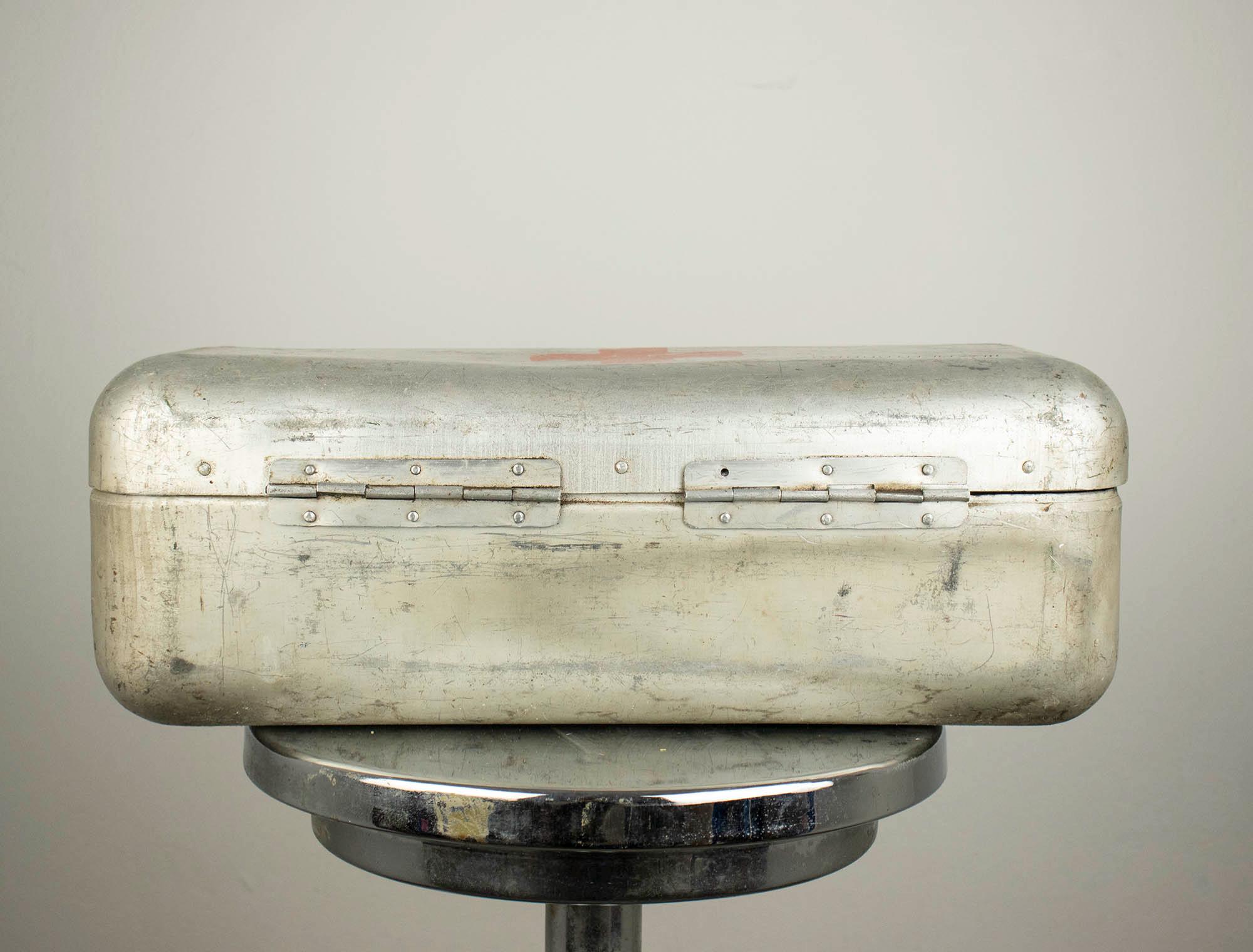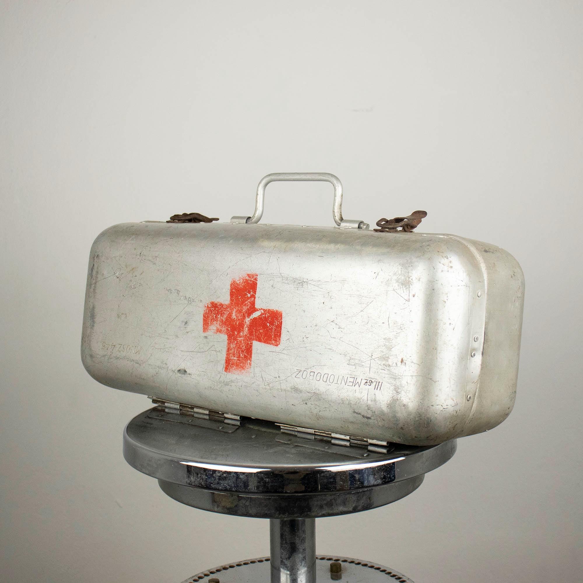This is a great-looking vintage first-aid metal box used in army trucks. It is in good condition with visible traces of usage. It is a classical aluminum box with a red cross and is a lovely vintage item that can be a lovely addition to a collection, a beautiful vintage decoration item, or even can be used again as a first aid box. The box is a genuine piece with great quality and is made to last.