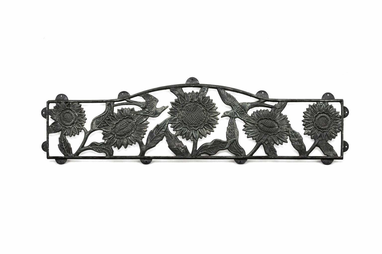 Once part of an outdoor bench, this solid cast iron panel is a stunning example of Eastern European design — featuring four large sunflowers and two birds in mid-flight, all surrounded by curling leaves and branches. The intricate detailing and aged patina give it a rustic, timeworn beauty perfect for lovers of vintage, farmhouse, or industrial decor.