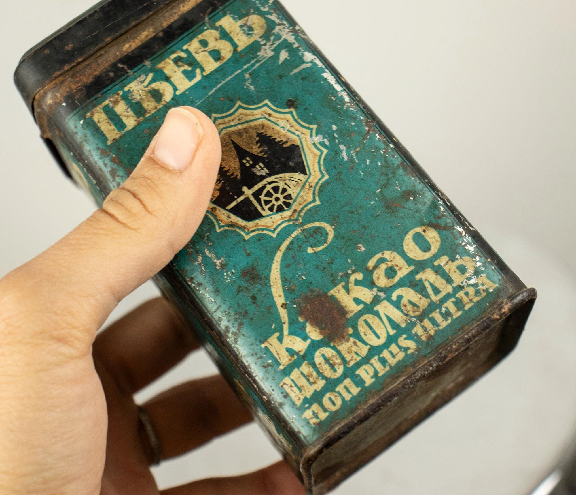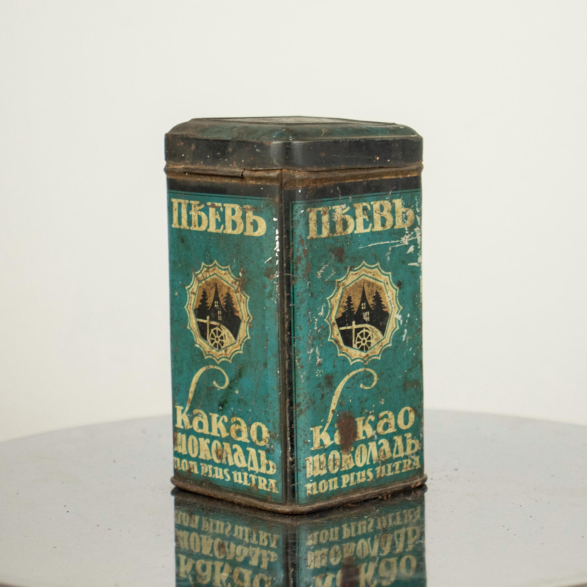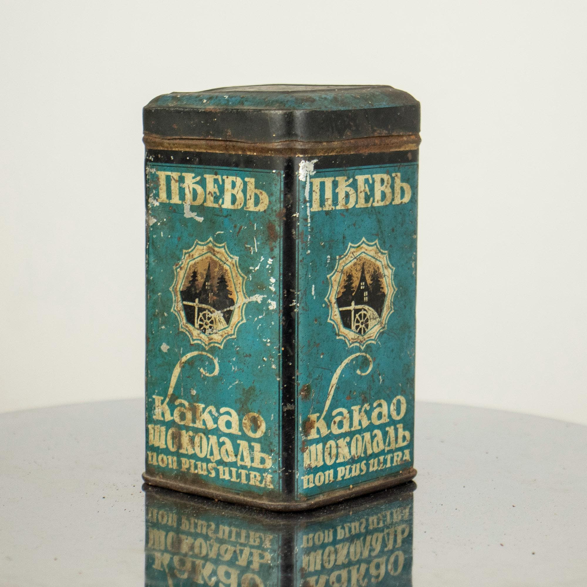This is a rare and beautifully preserved early 20th-century cacao tin box from the period of the Bulgarian Kingdom. The box is marked “Пъевъ” (Puev) and features Cyrillic lettering reading какао, шоколад, non plus ultra. It was used to store cacao or chocolate products and is an excellent example of Bulgarian advertising design from the pre-World War II era.
