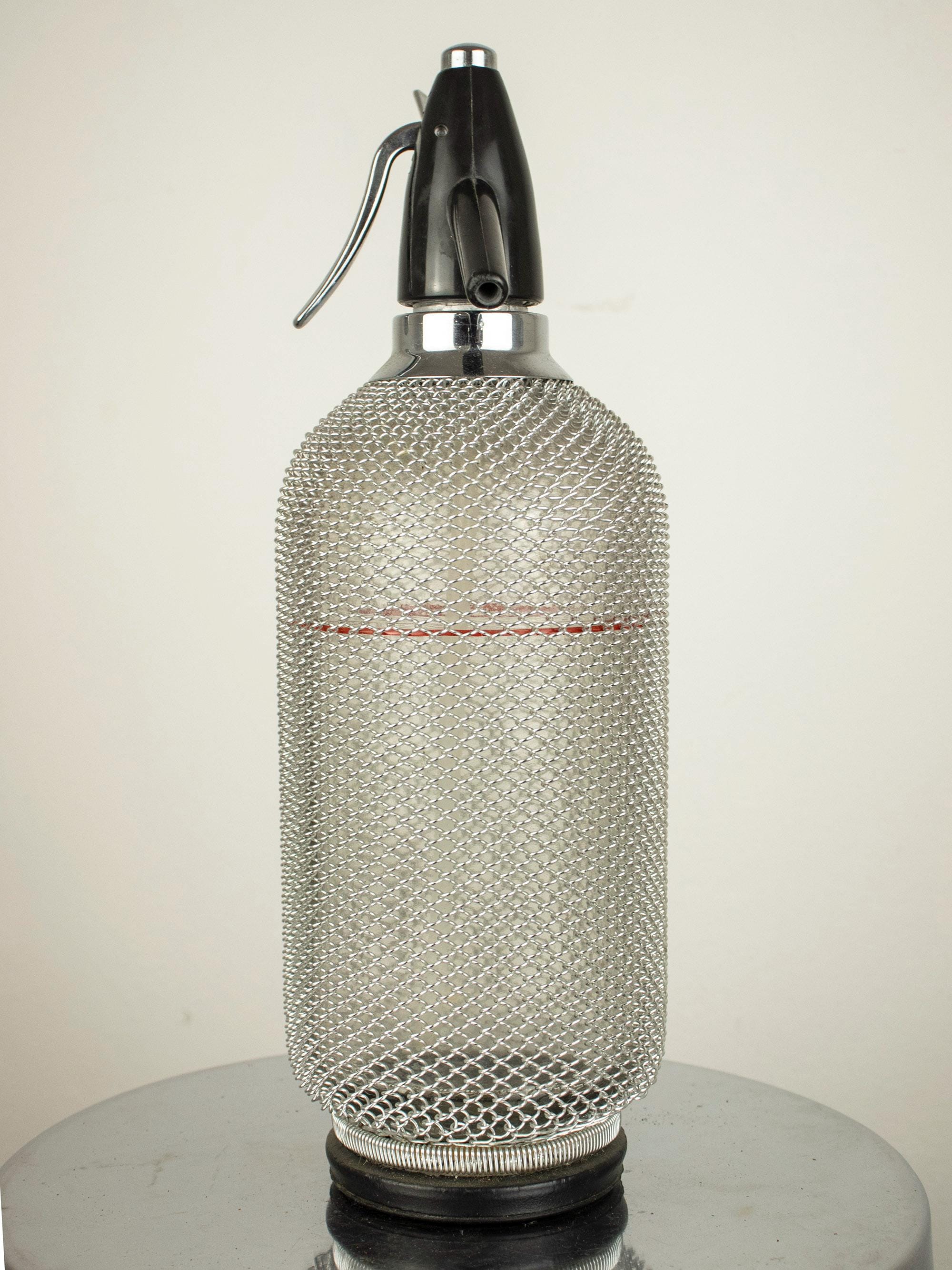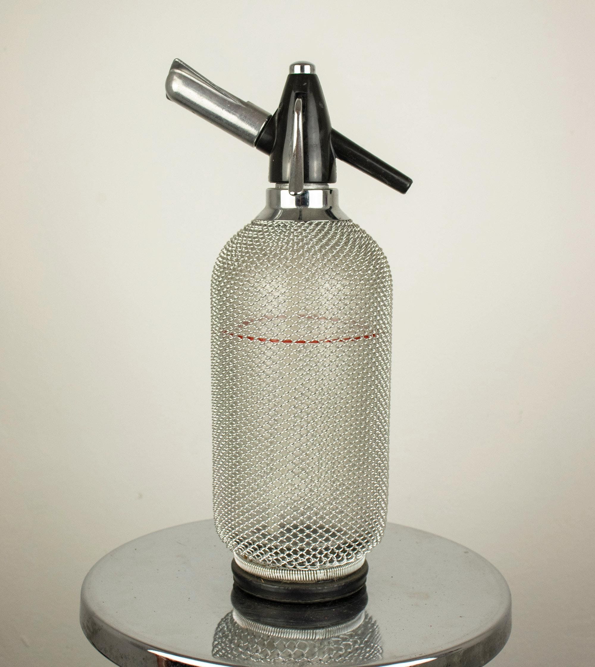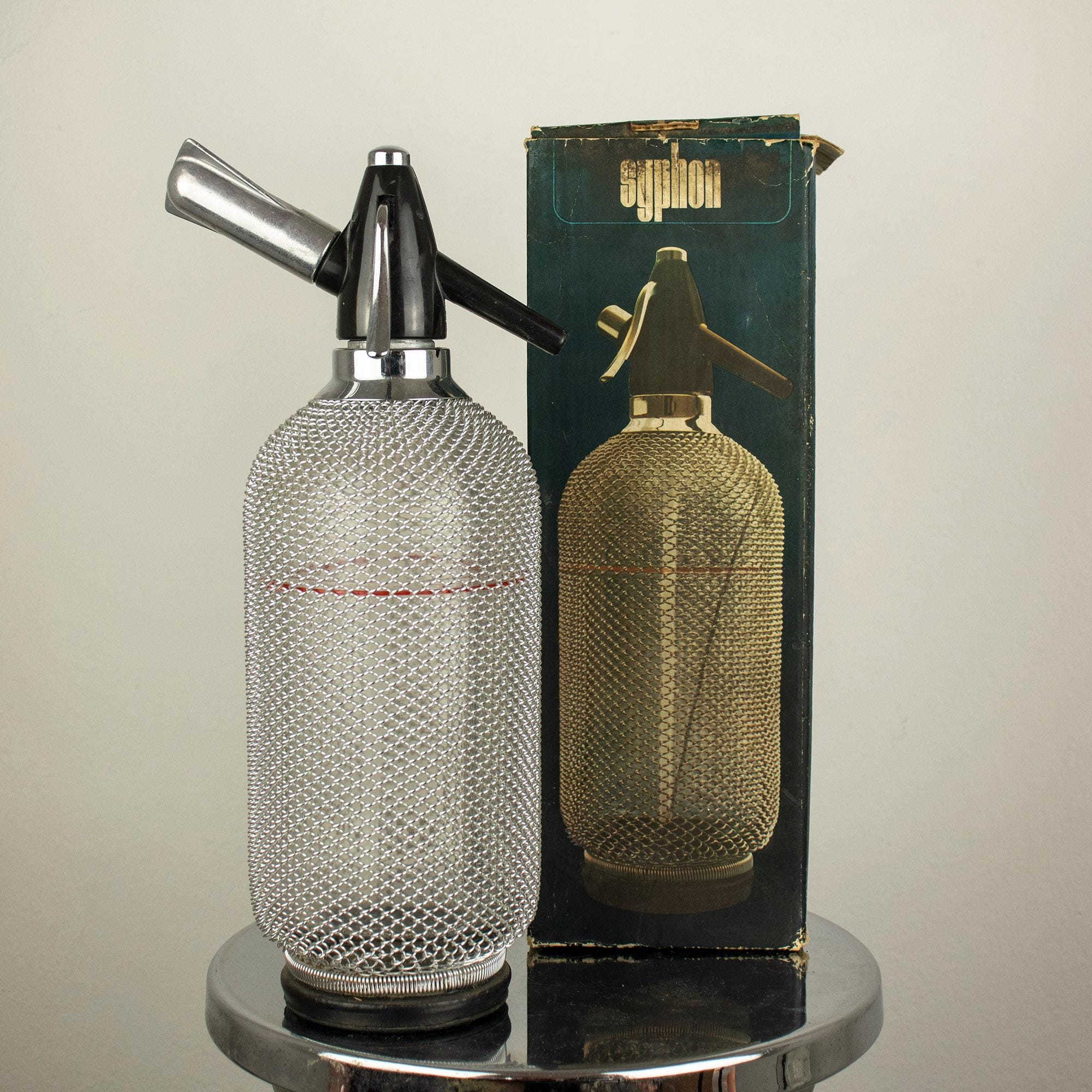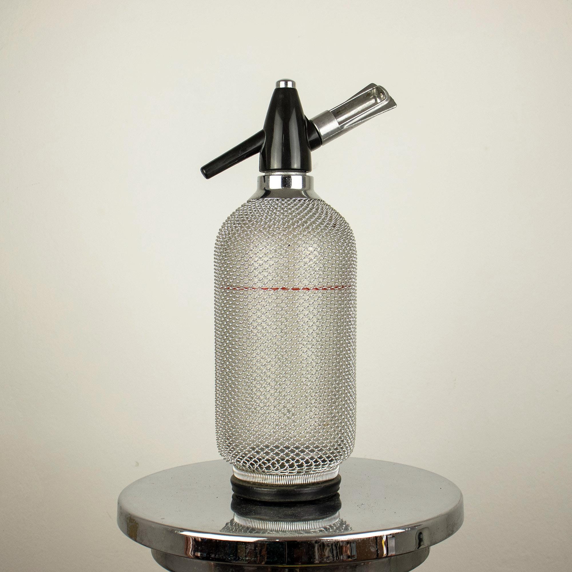 These bottles were commonly used to make carbonated water at home or in cafés, adding a touch of elegance to any bar or kitchen counter. The metal mesh wrapping protected the glass from pressure and breakage, while the chrome and black plastic head gives it that sleek 1960s look.