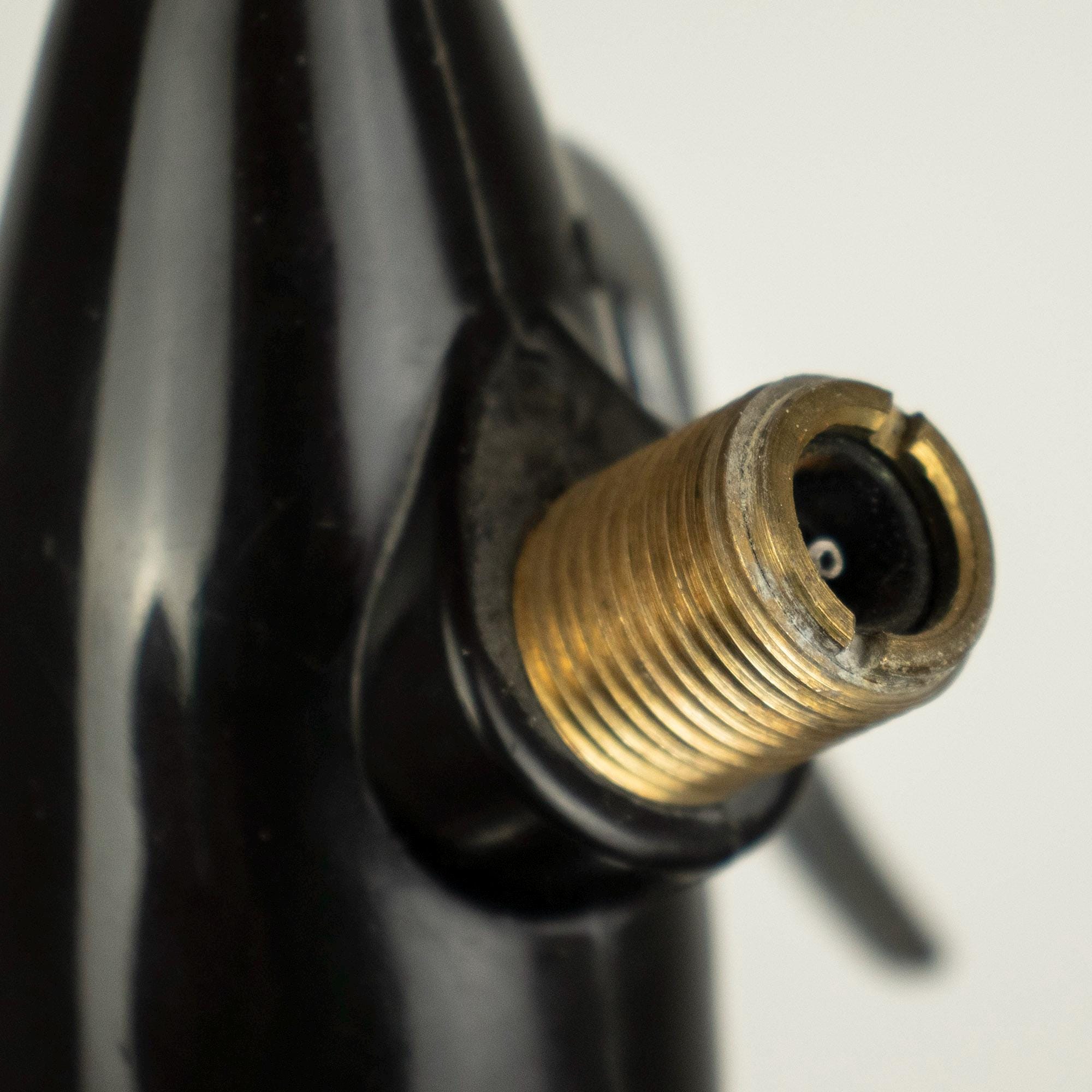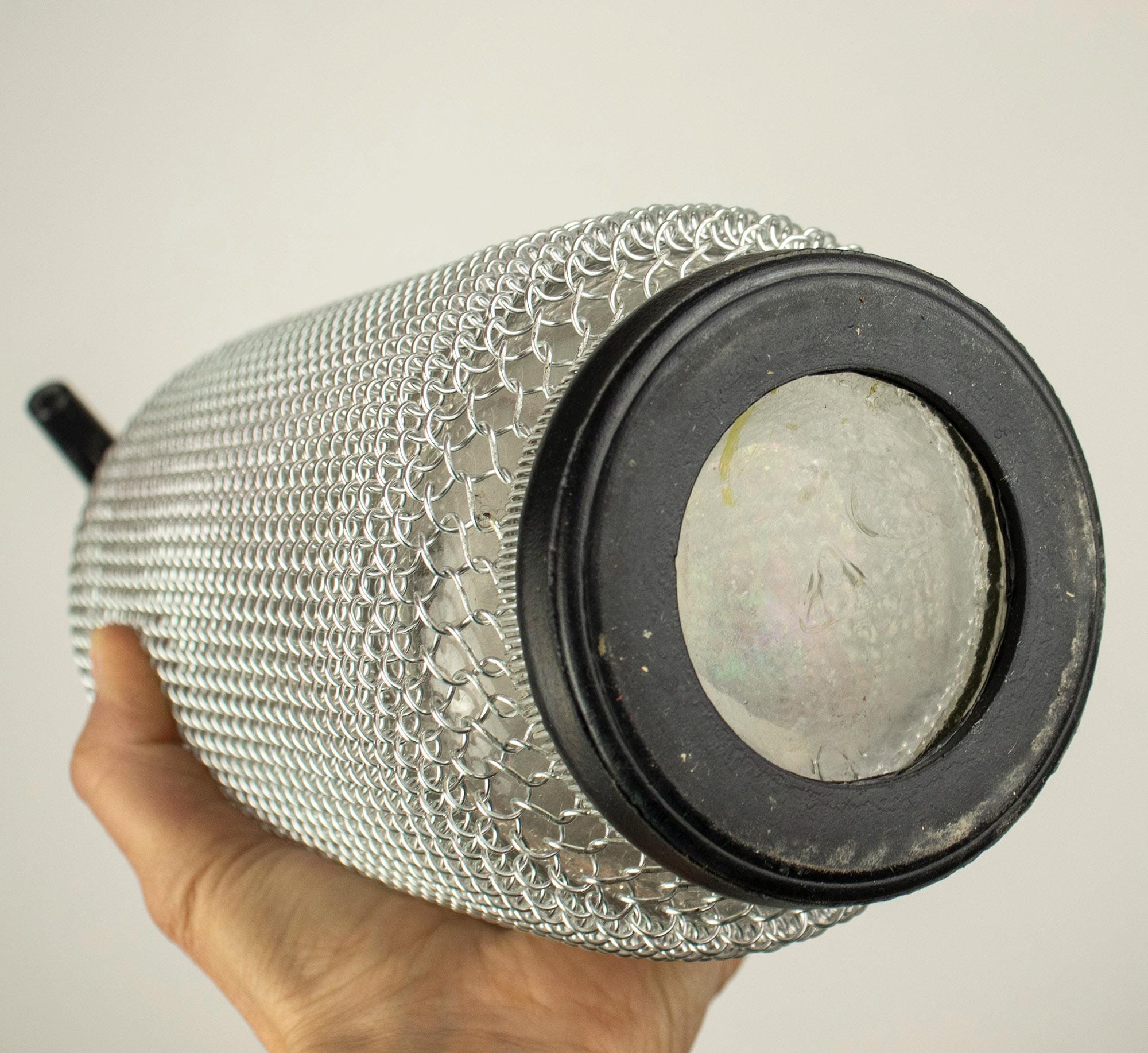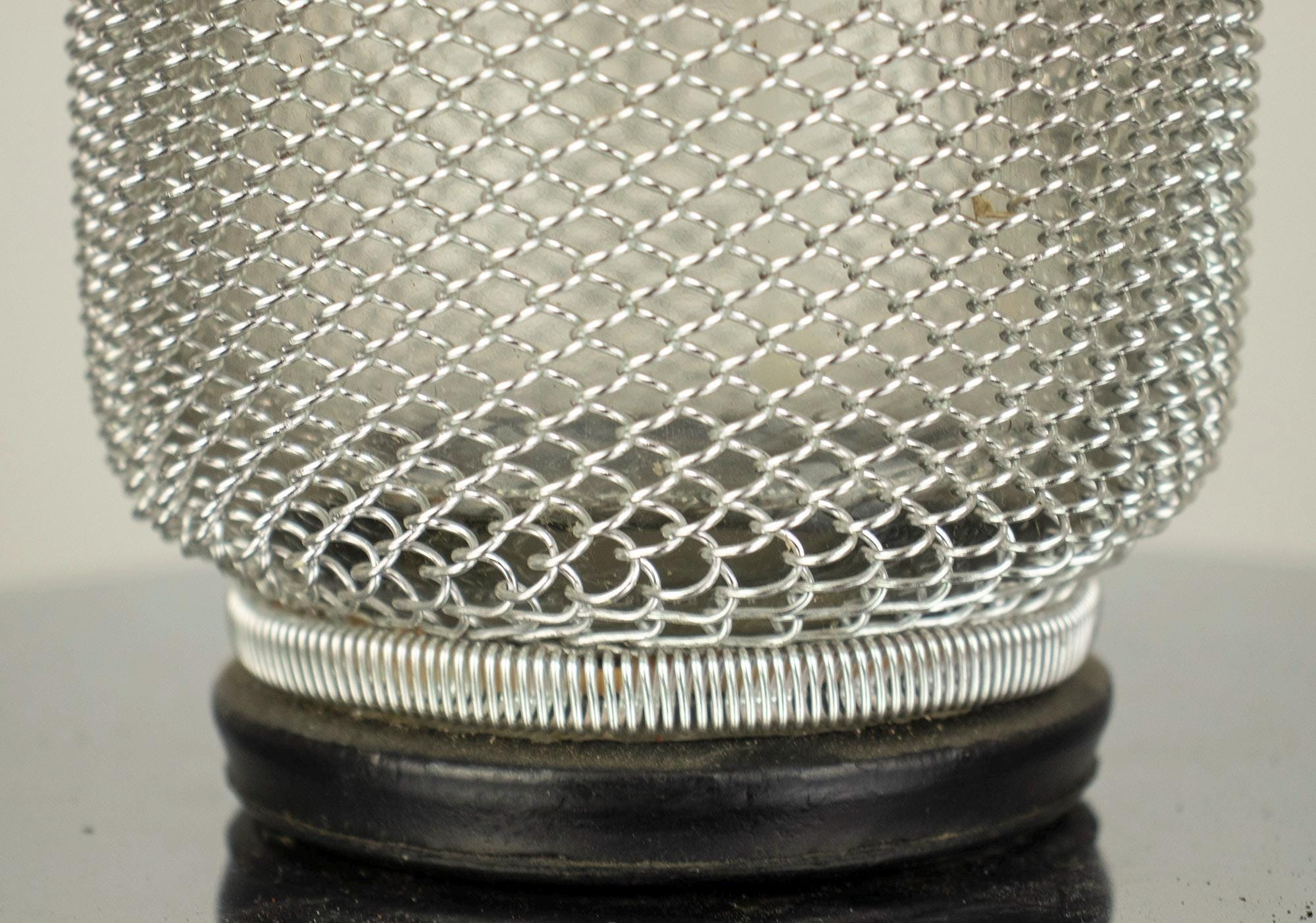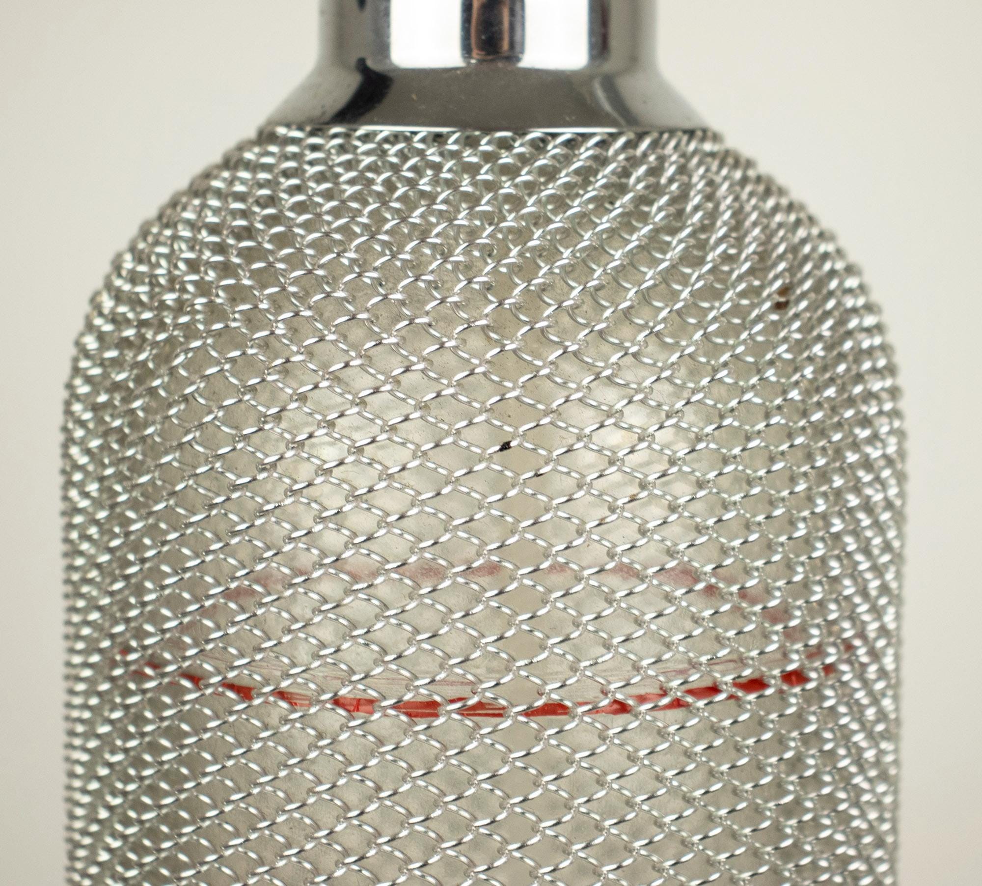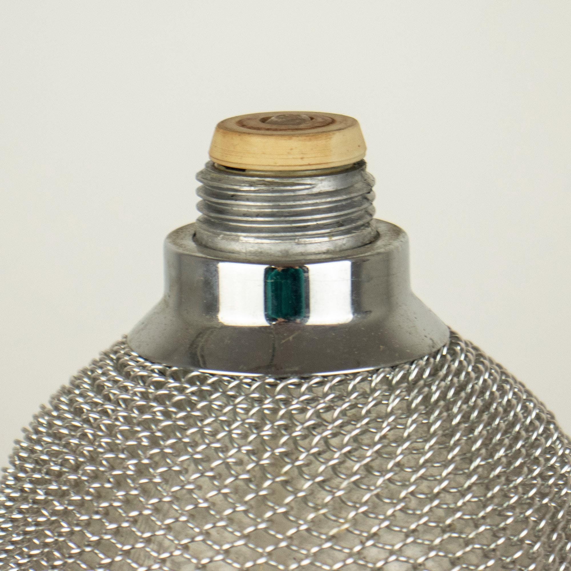 These bottles were commonly used to make carbonated water at home or in cafés, adding a touch of elegance to any bar or kitchen counter. The metal mesh wrapping protected the glass from pressure and breakage, while the chrome and black plastic head gives it that sleek 1960s look.