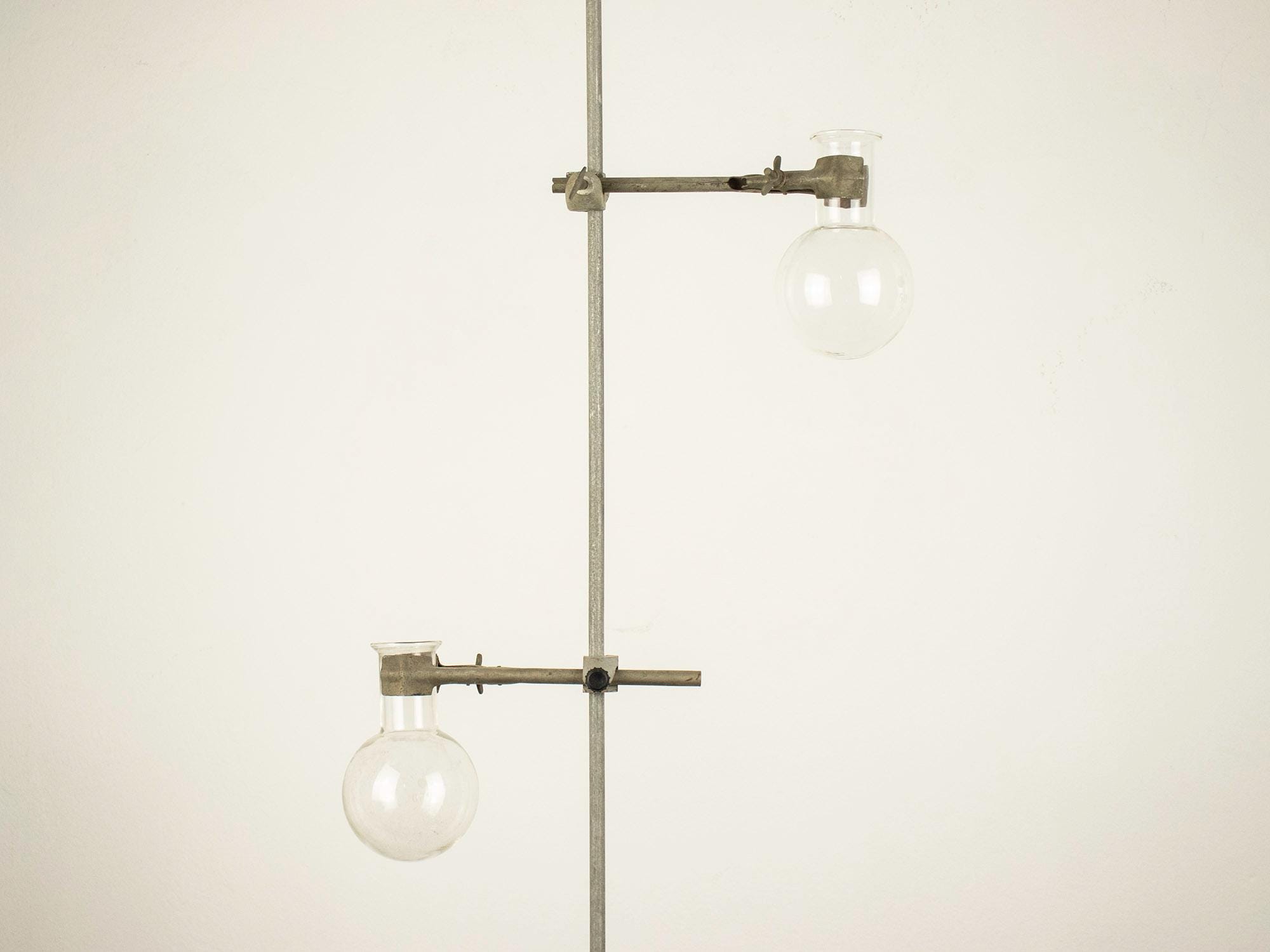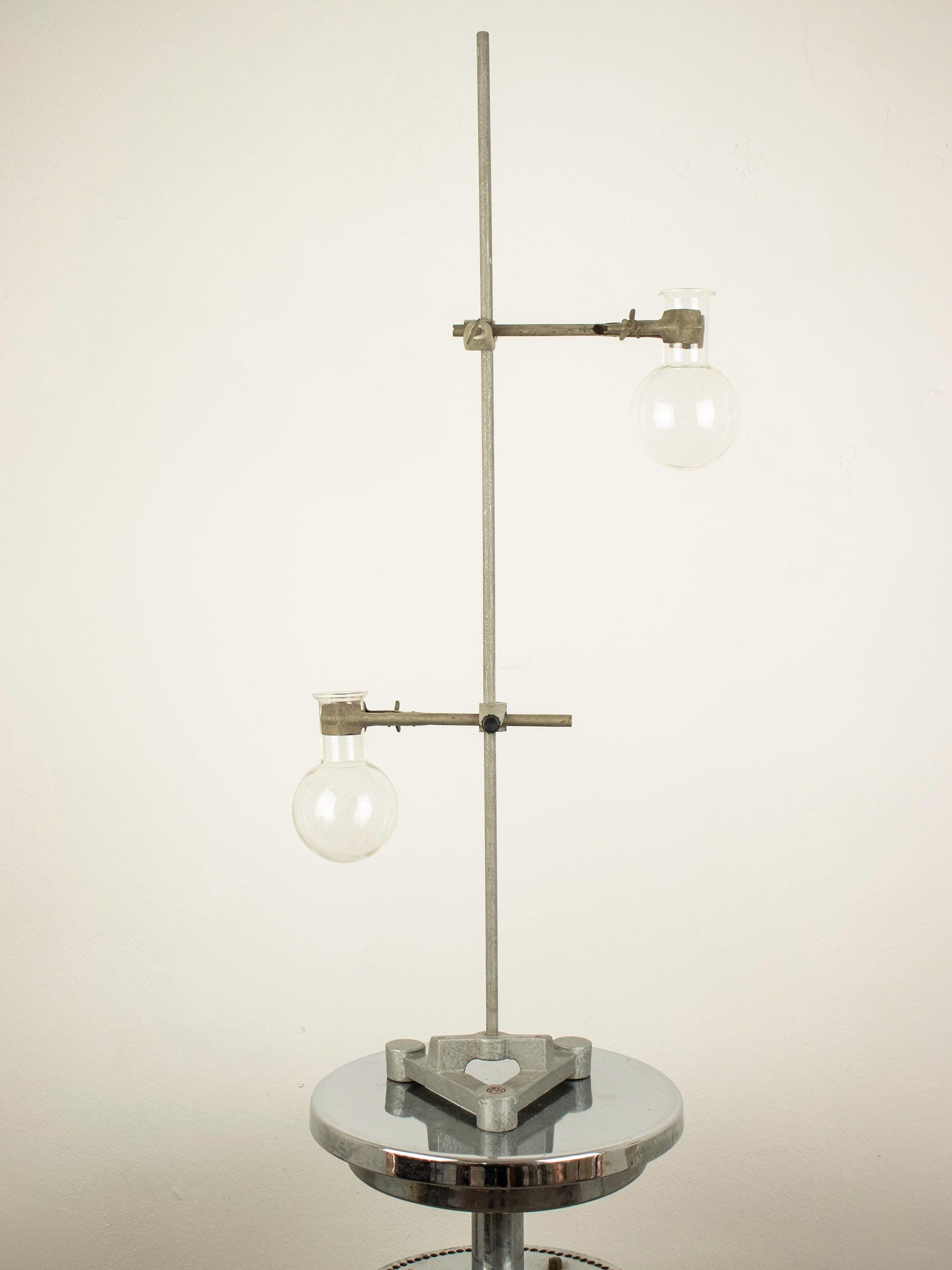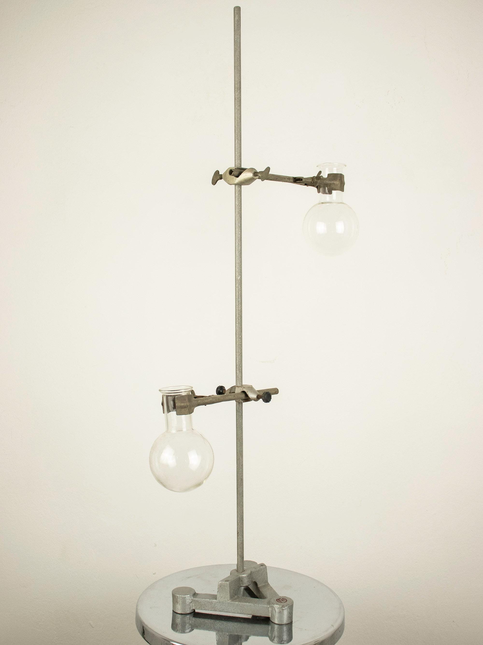 A unique and authentic vintage metal stand straight from a chemistry laboratory. This original lab equipment includes two adjustable clamps and two 250 ml glass flasks. The clamps can be moved along the pole and rotated in various directions, offering versatile positioning.