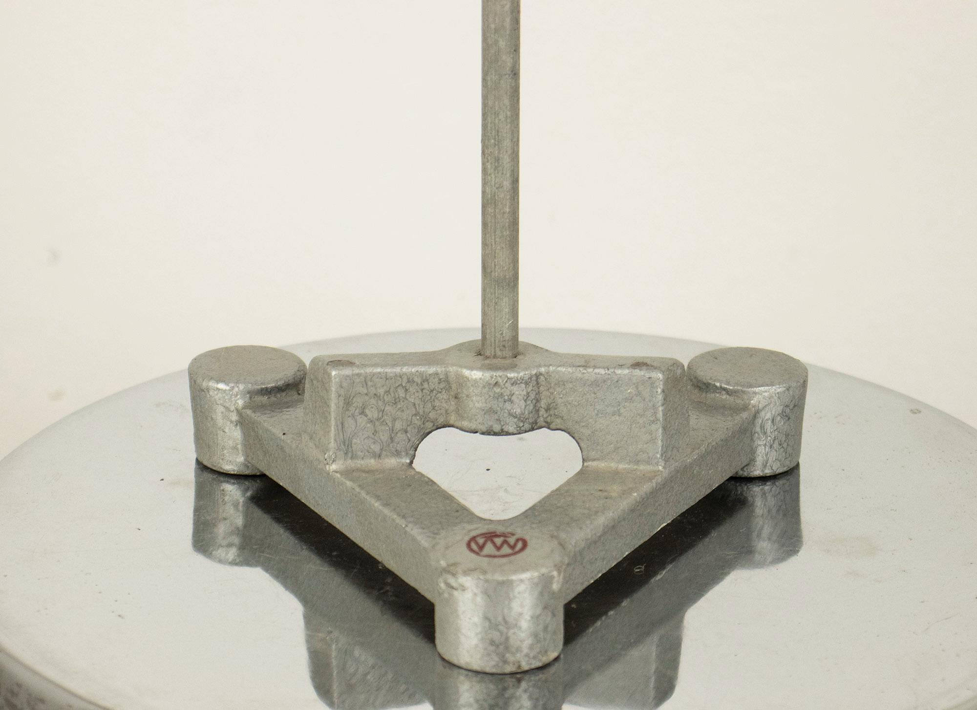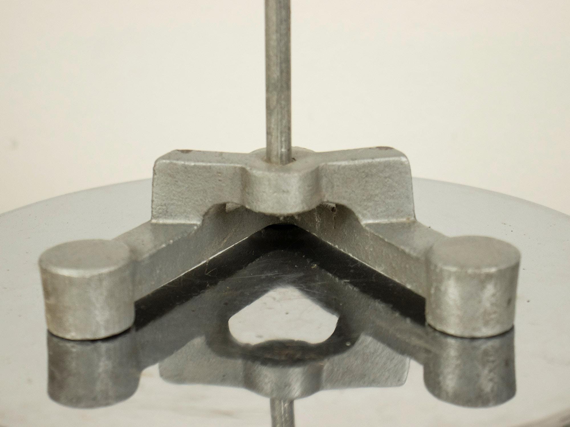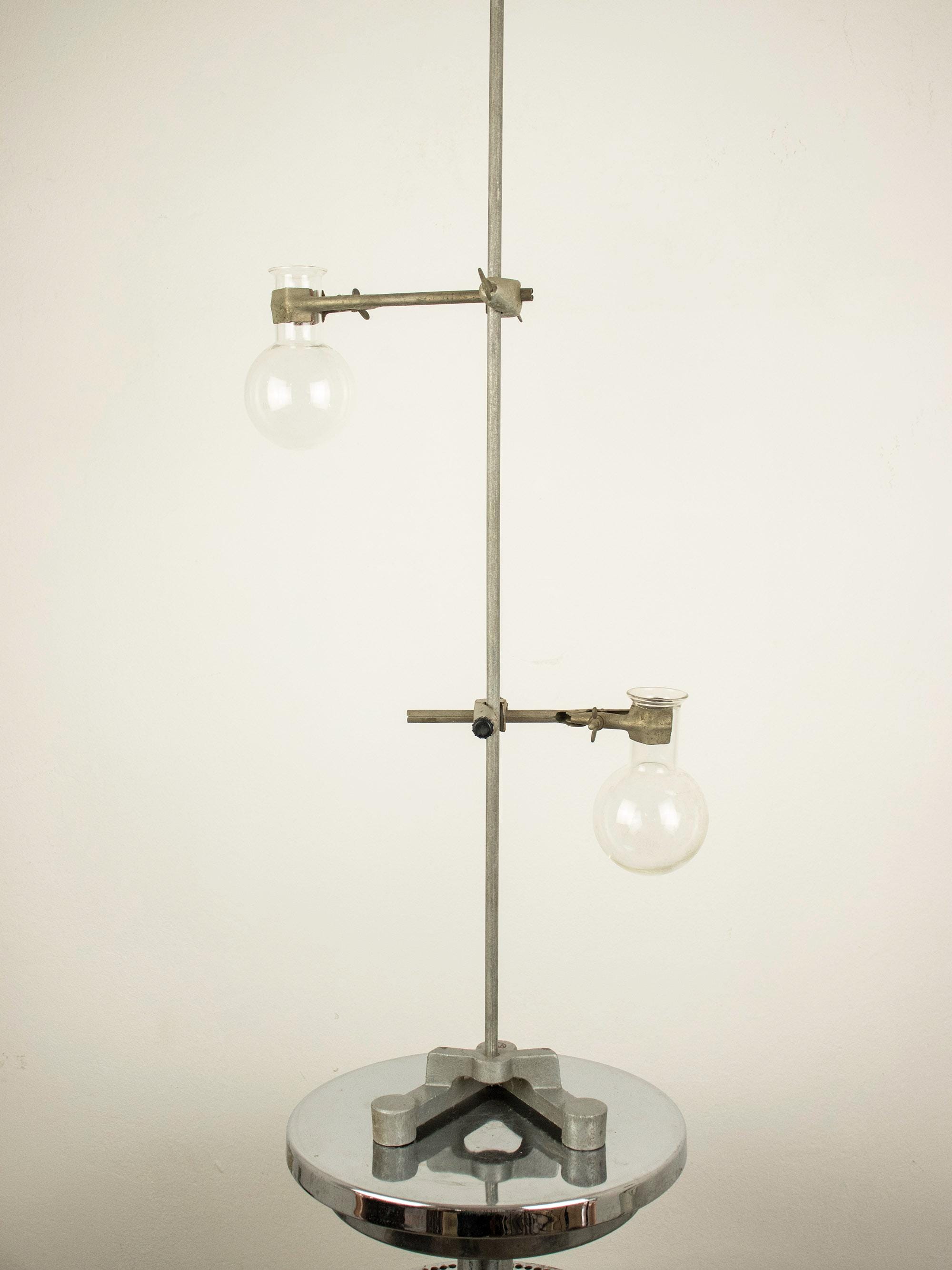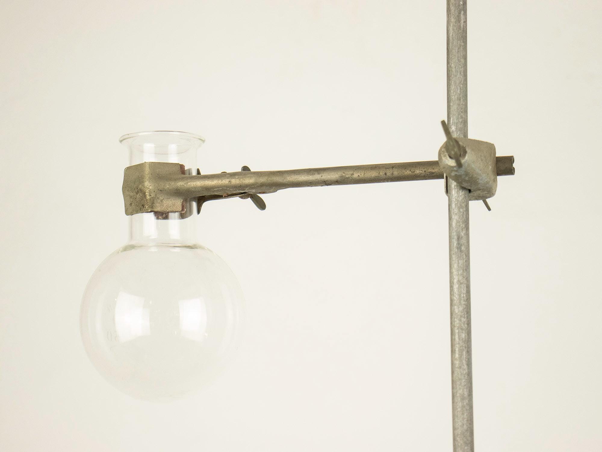 A unique and authentic vintage metal stand straight from a chemistry laboratory. This original lab equipment includes two adjustable clamps and two 250 ml glass flasks. The clamps can be moved along the pole and rotated in various directions, offering versatile positioning.