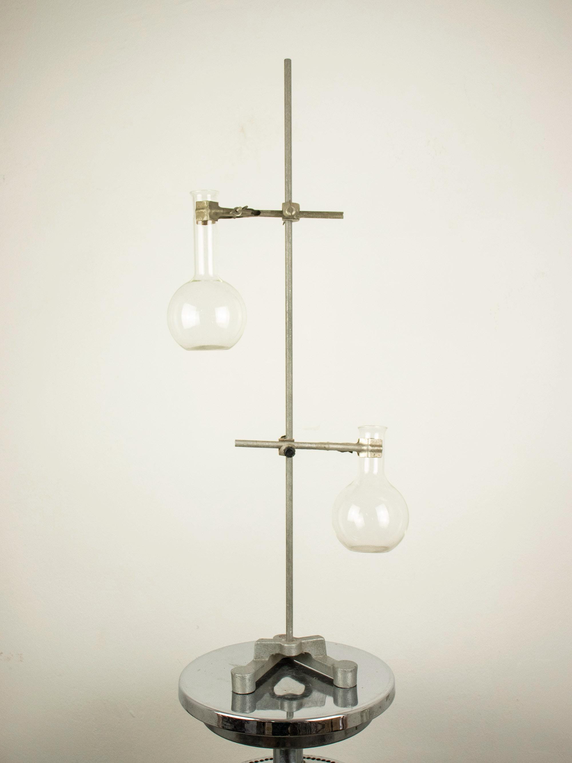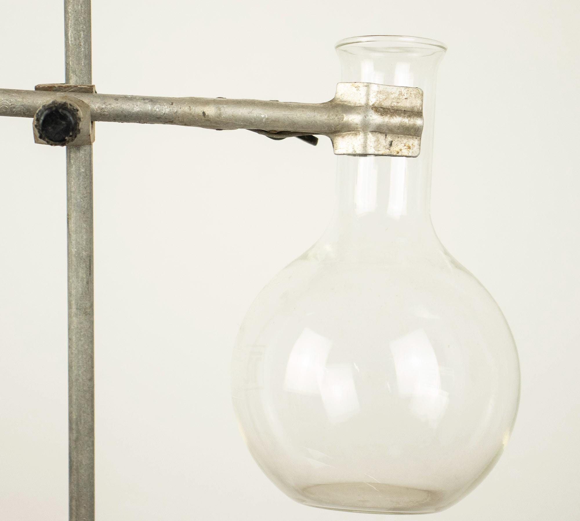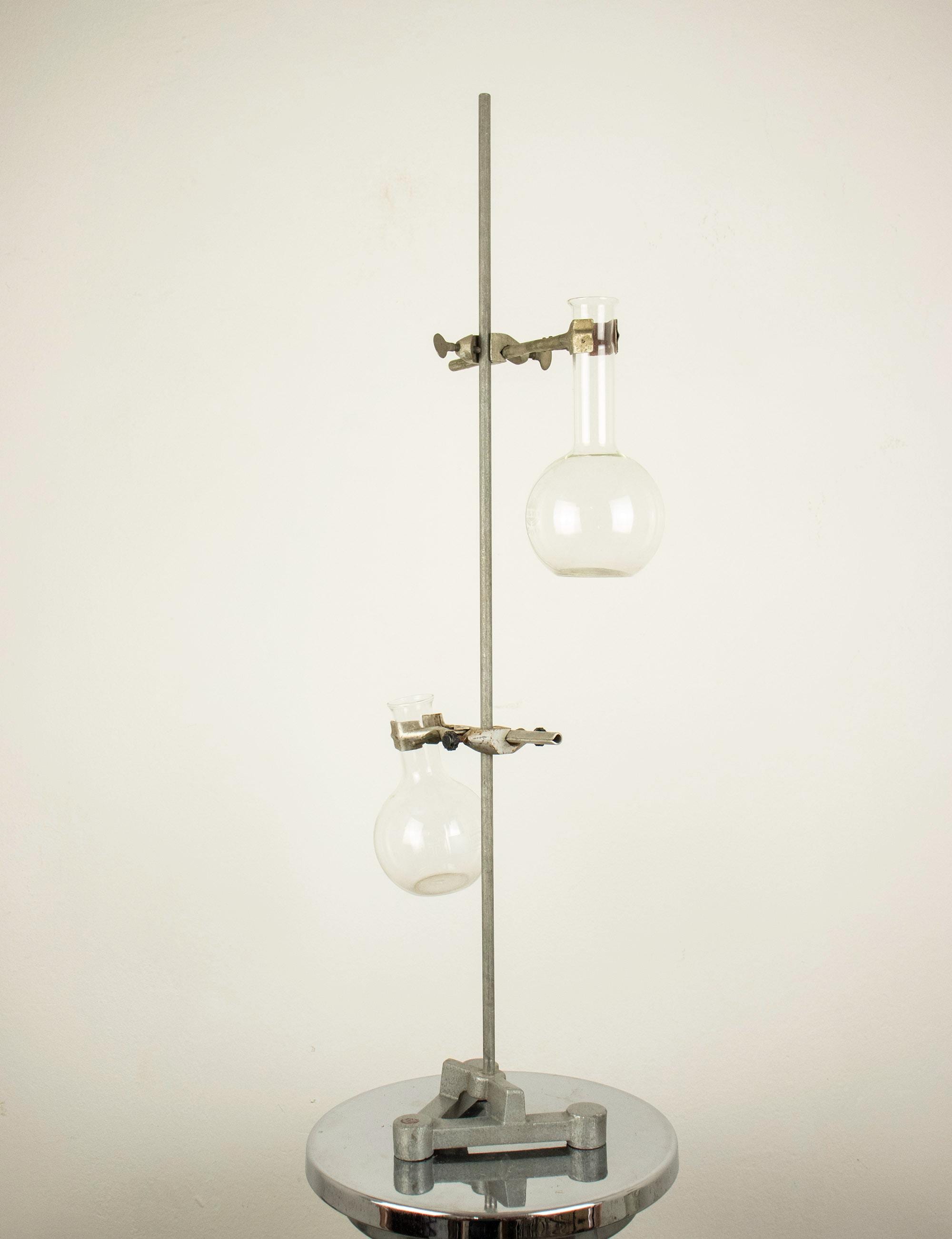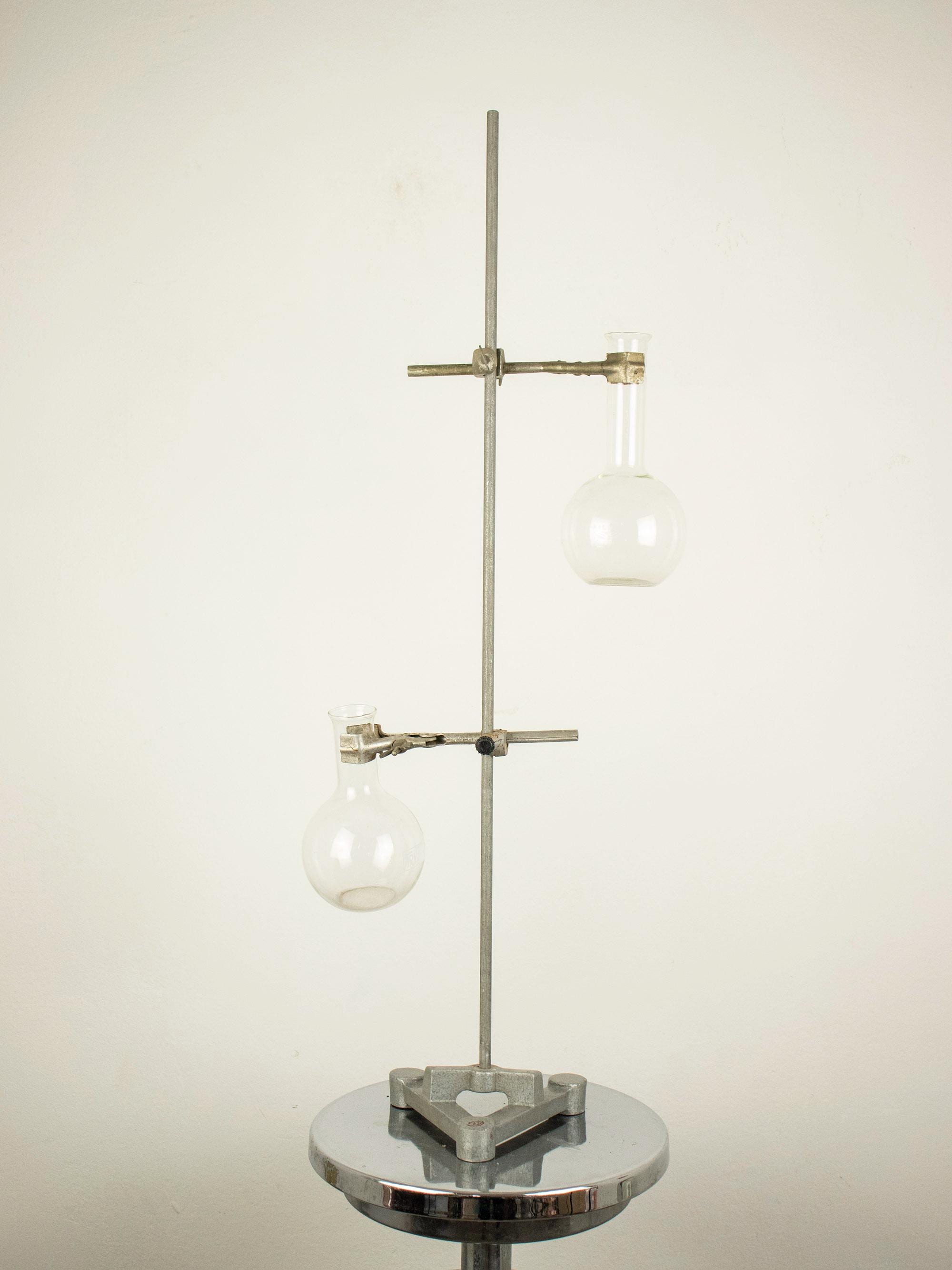 A unique and authentic vintage metal stand straight from a chemistry laboratory. This original lab equipment includes two adjustable clamps and two 500 ml glass flasks. The clamps can be moved along the pole and rotated in various directions, offering versatile positioning.
