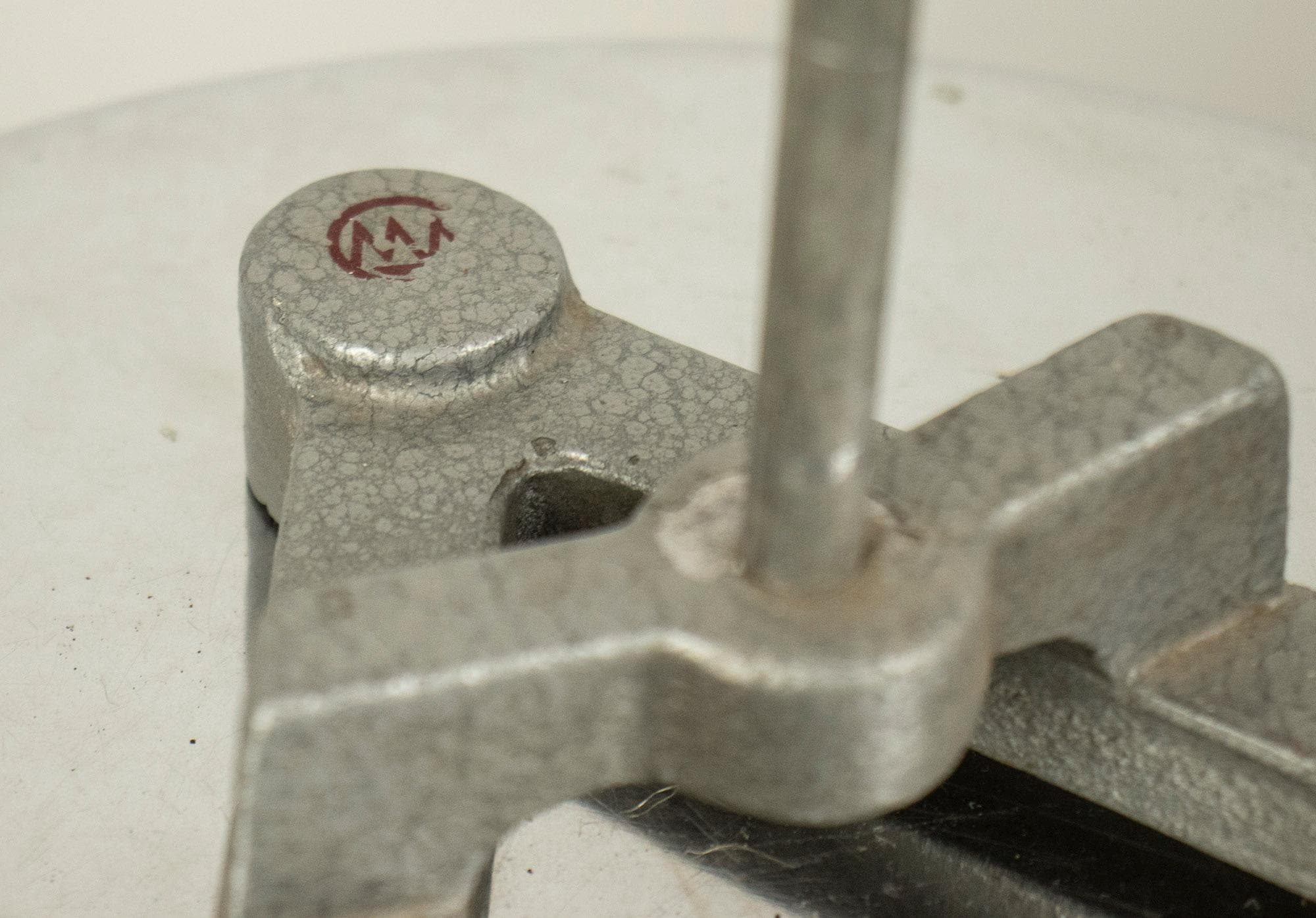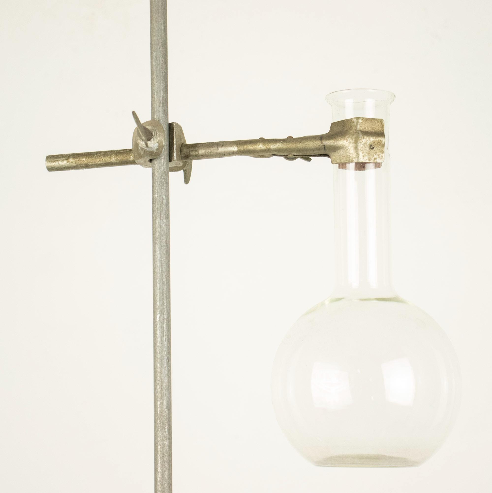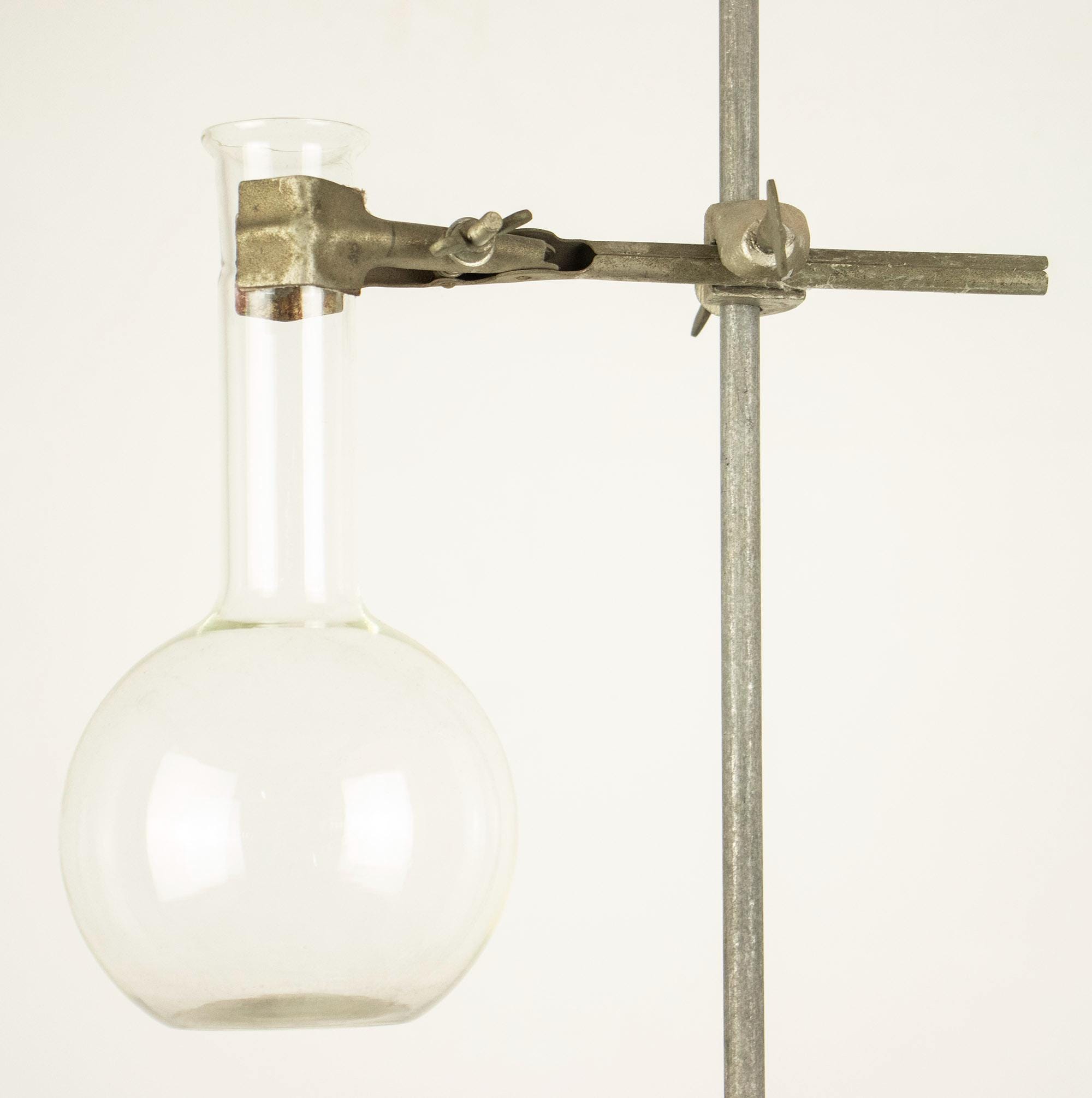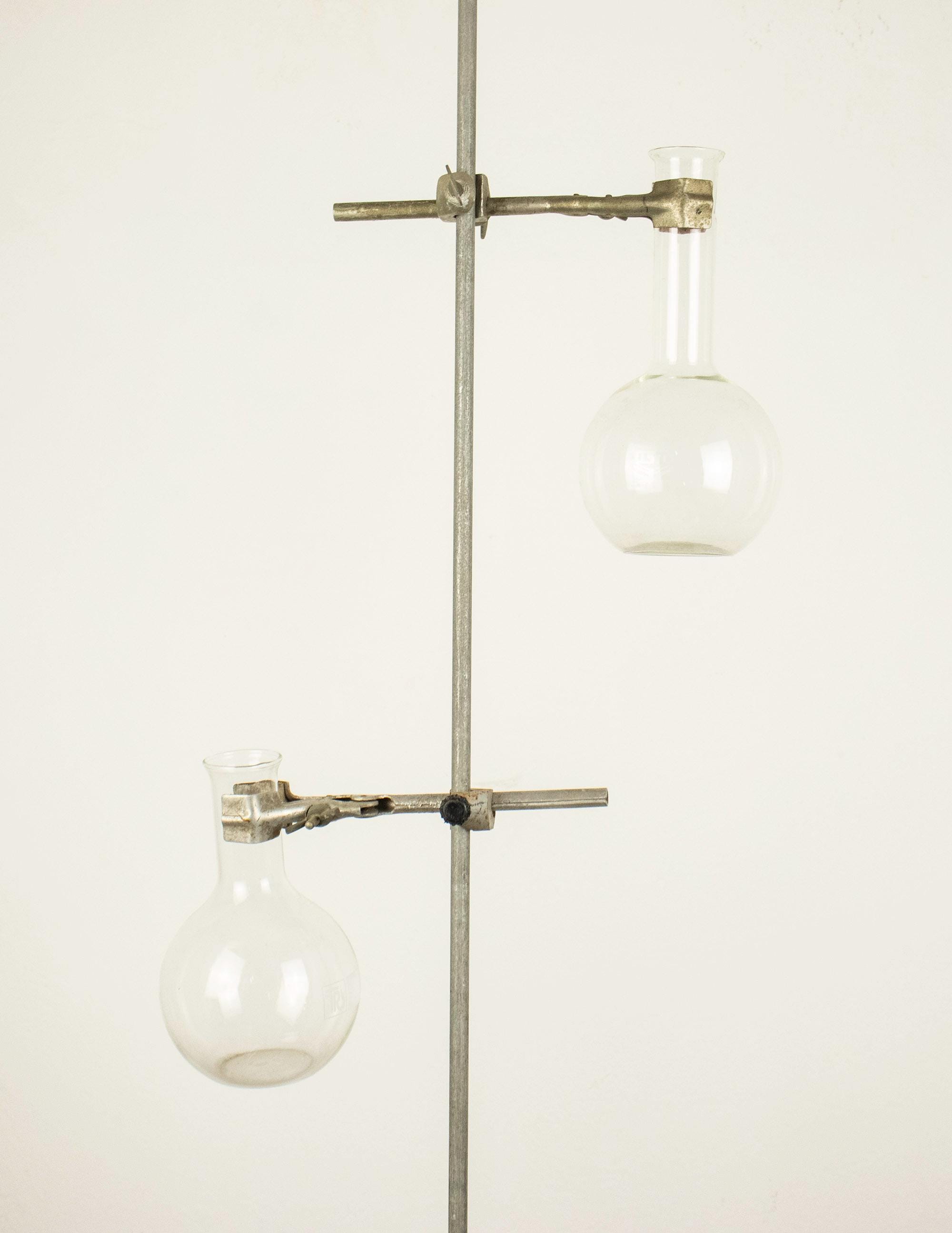 A unique and authentic vintage metal stand straight from a chemistry laboratory. This original lab equipment includes two adjustable clamps and two 500 ml glass flasks. The clamps can be moved along the pole and rotated in various directions, offering versatile positioning.