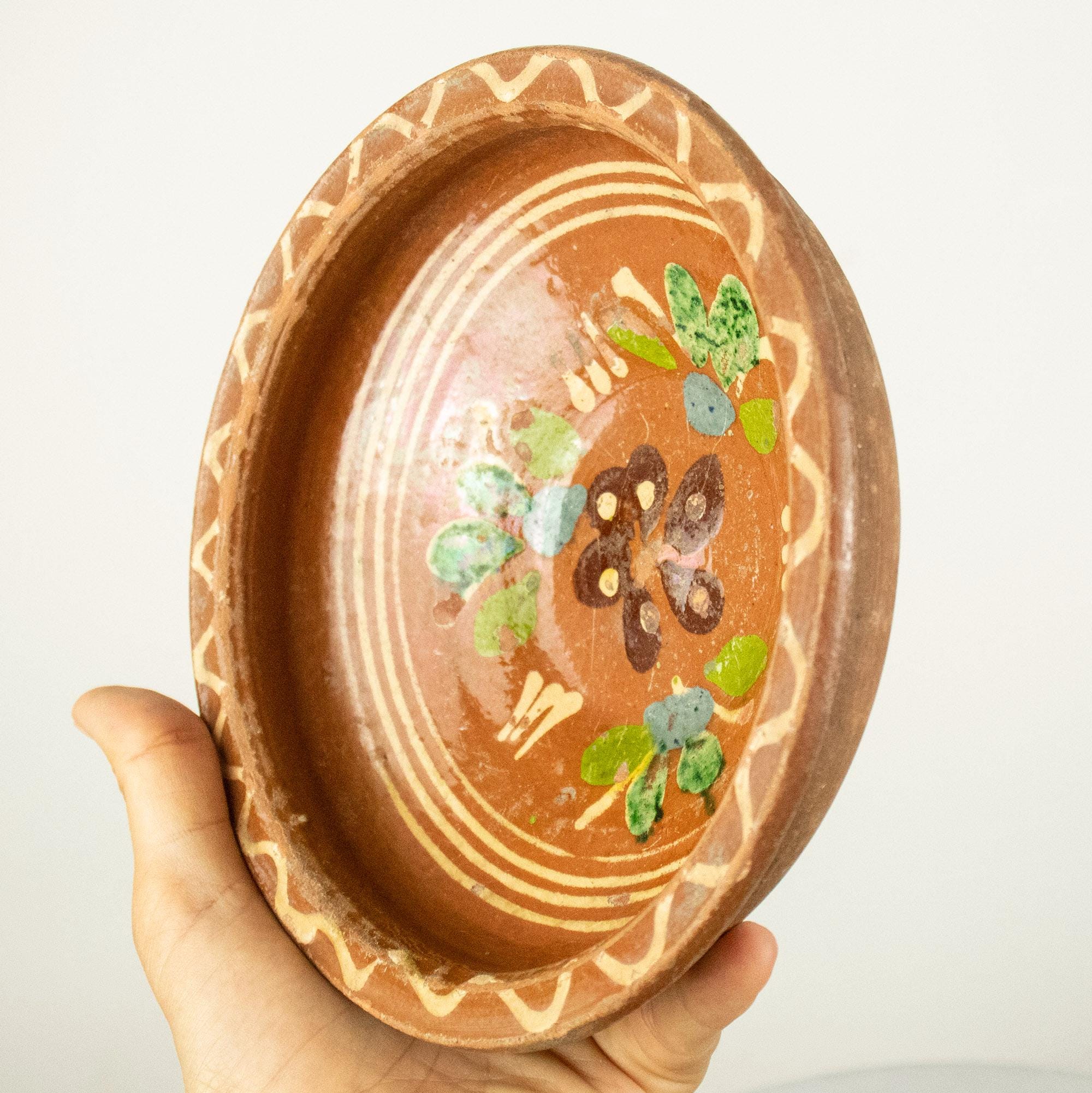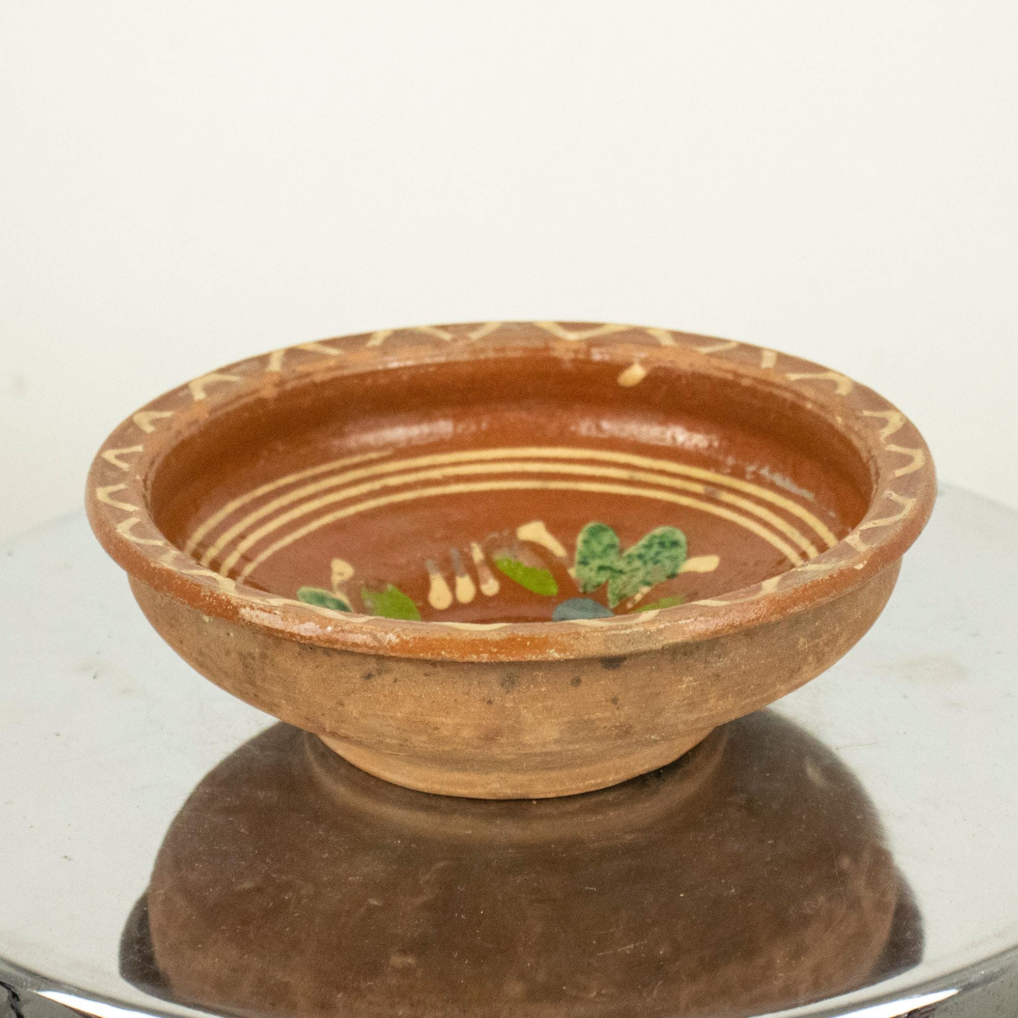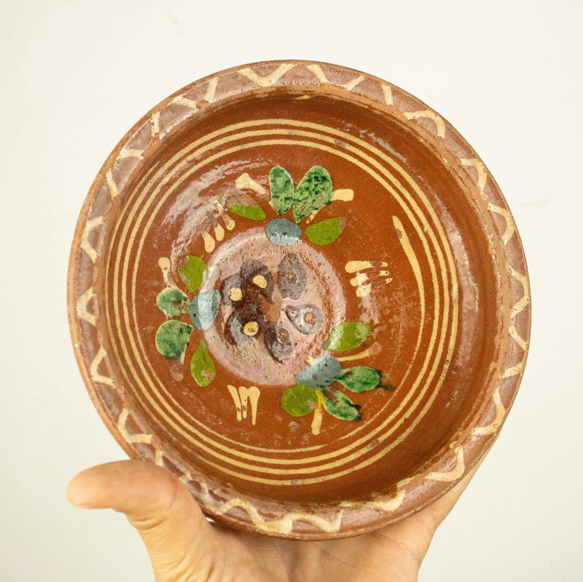 This beautiful handmade pottery bowl is a genuine example of traditional Balkan folk ceramics, dating from the 1930s–1960s. Crafted from red clay and glazed in warm earthy tones, it features a lovely hand-painted floral decoration in green, brown, and blue on a terracotta base.
