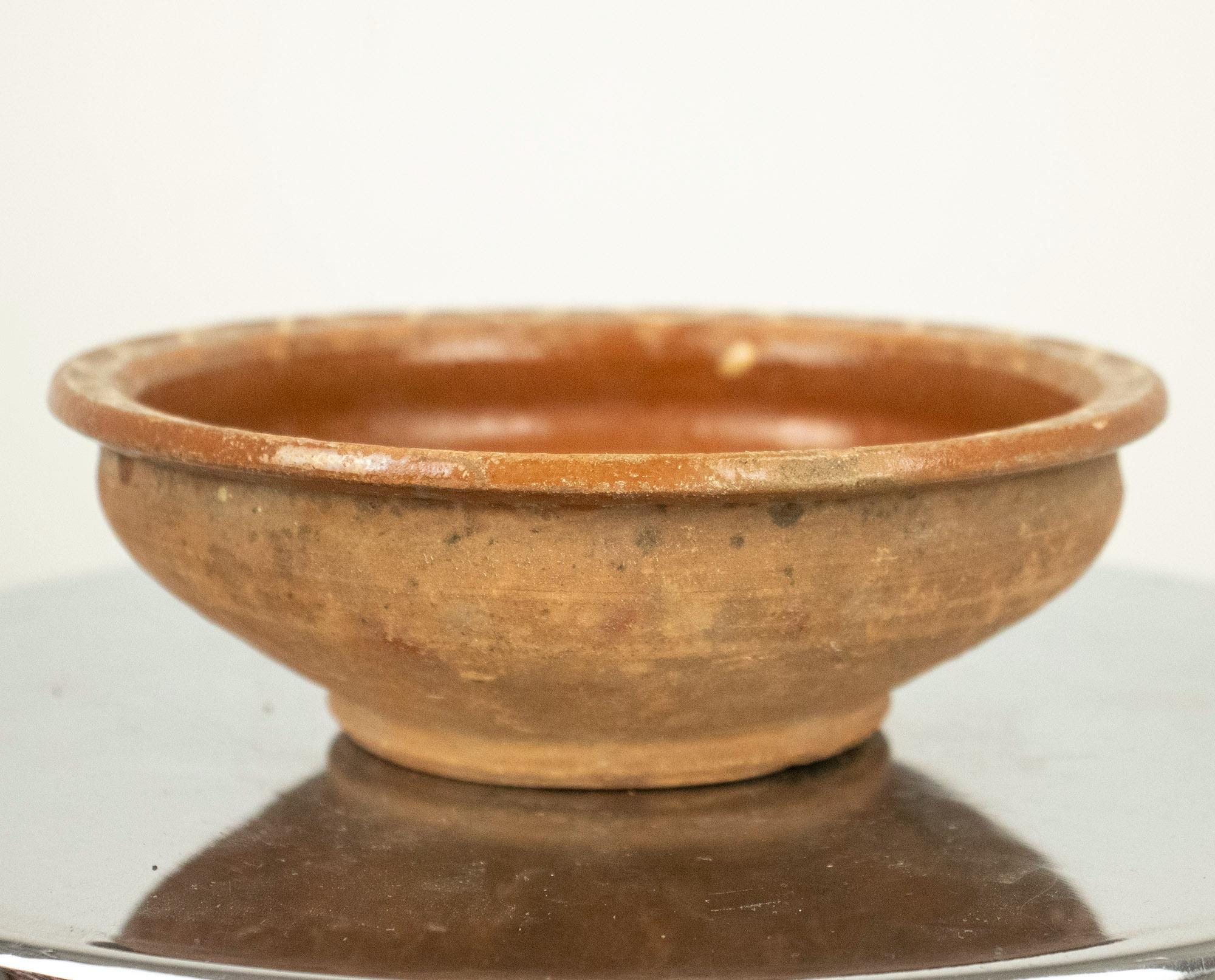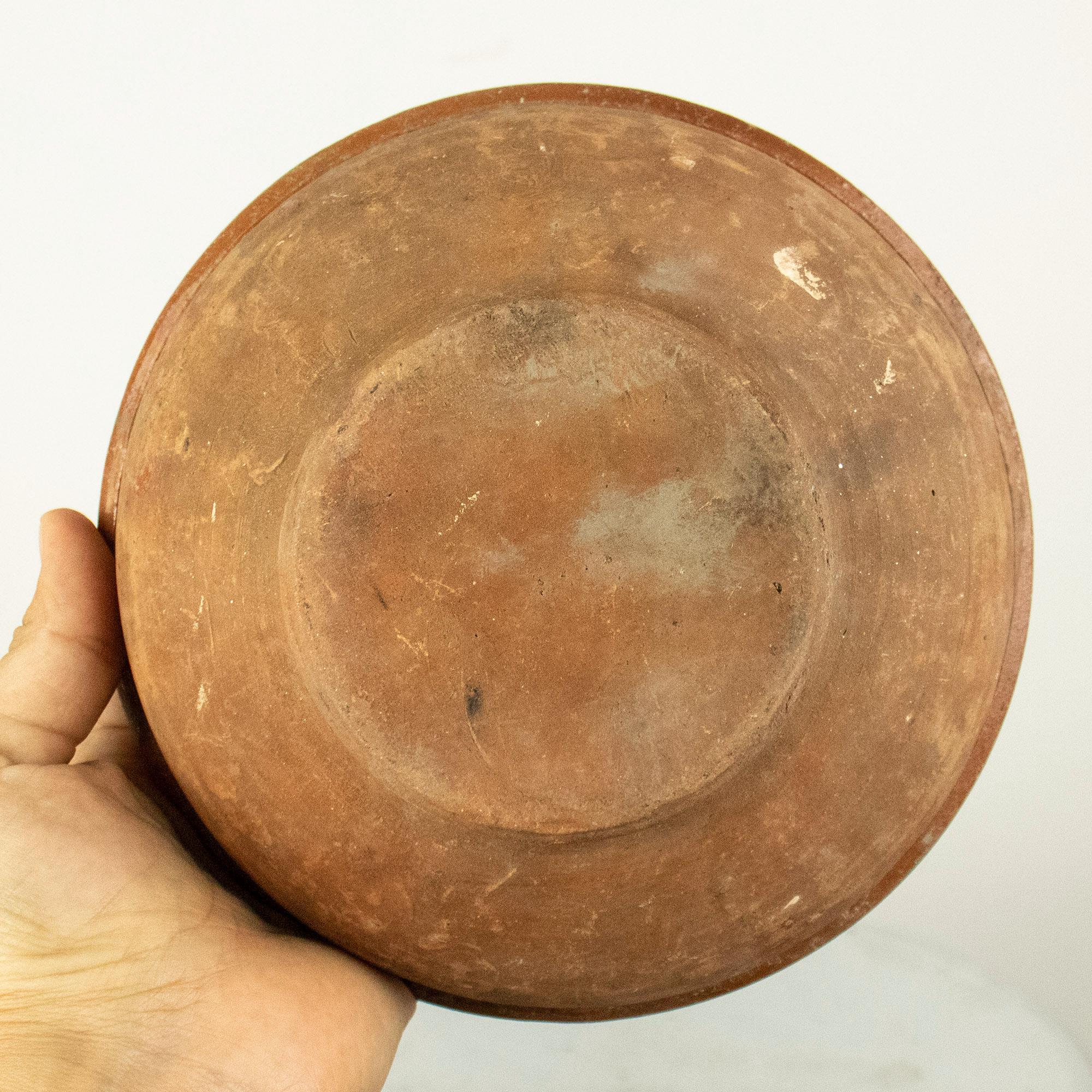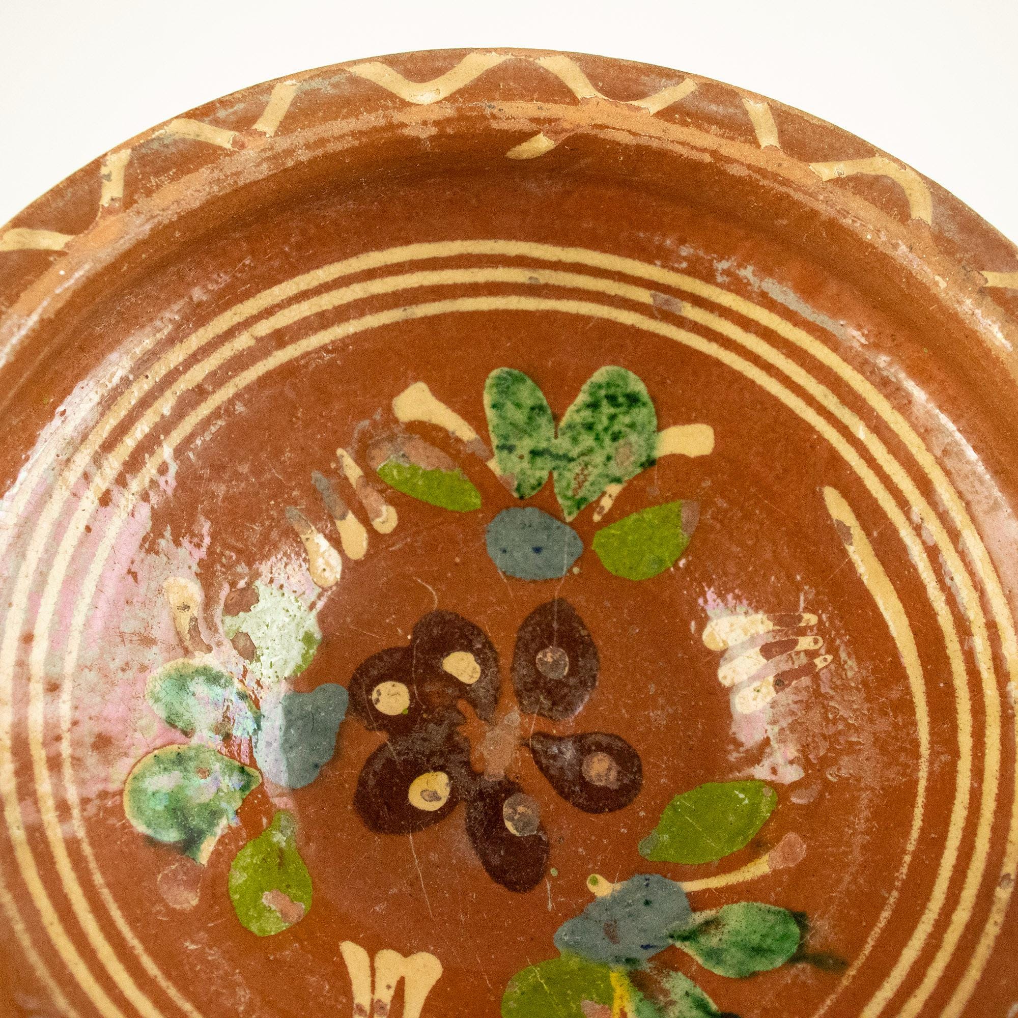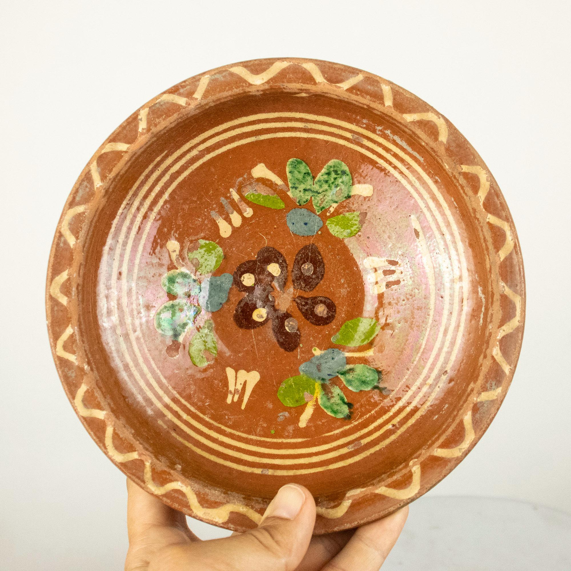 This beautiful handmade pottery bowl is a genuine example of traditional Balkan folk ceramics, dating from the 1930s–1960s. Crafted from red clay and glazed in warm earthy tones, it features a lovely hand-painted floral decoration in green, brown, and blue on a terracotta base.