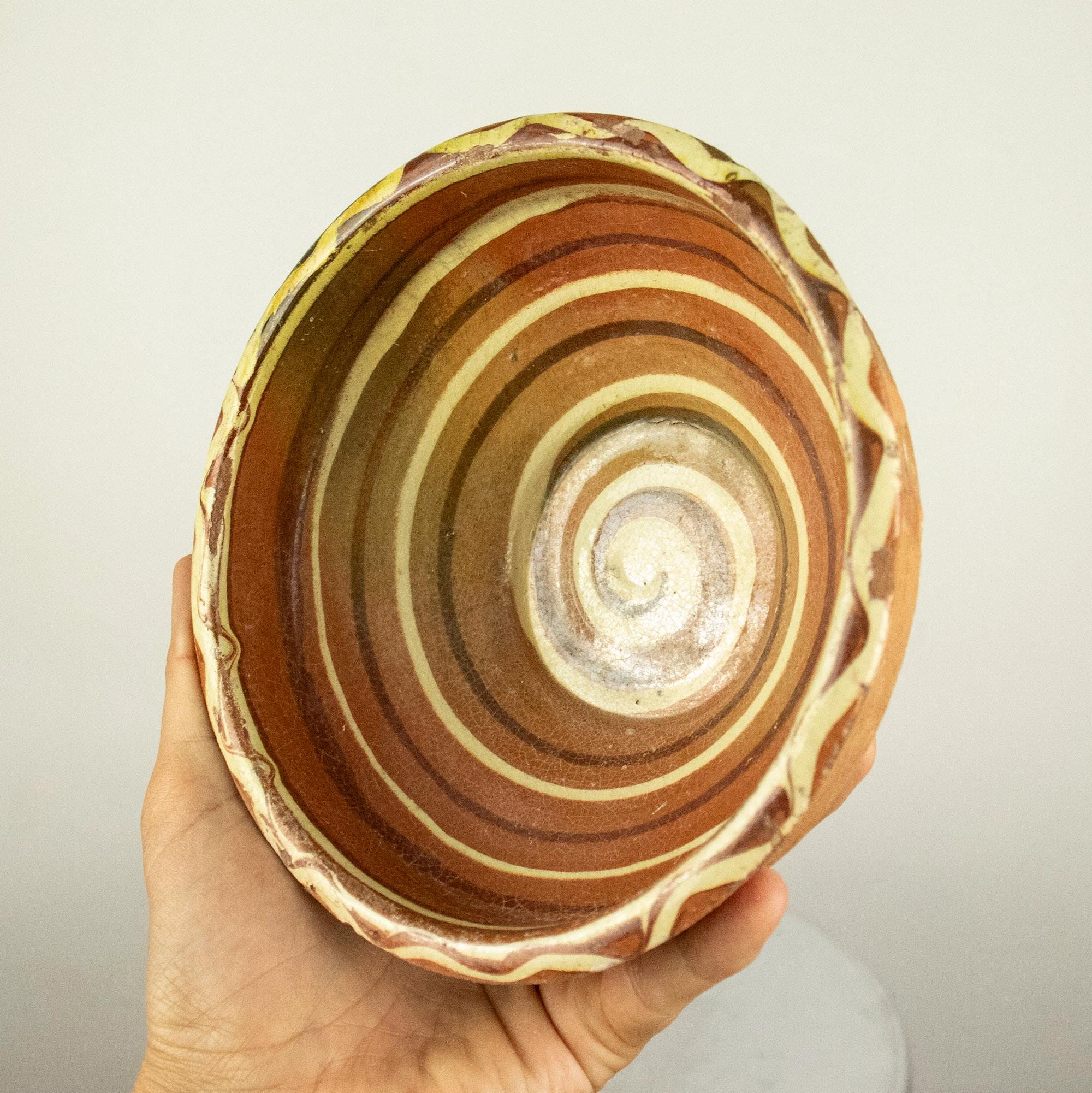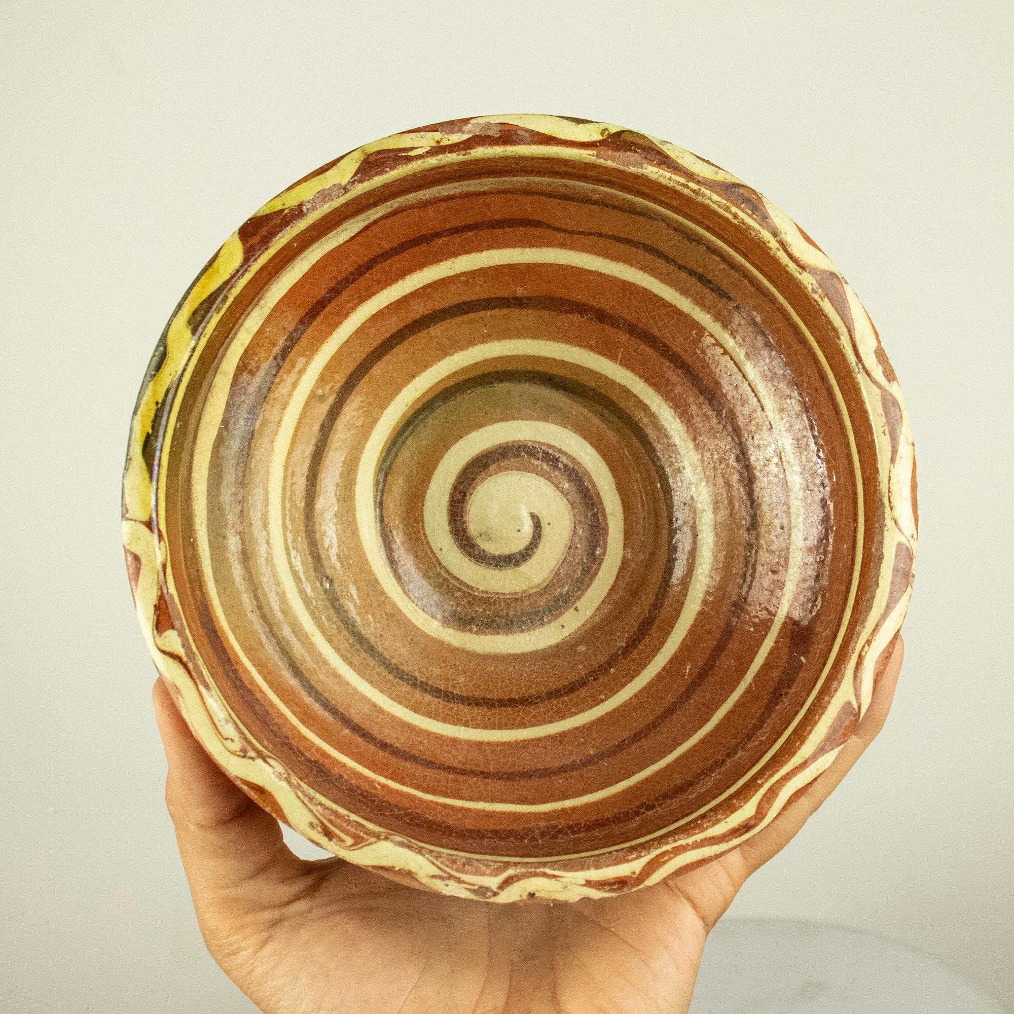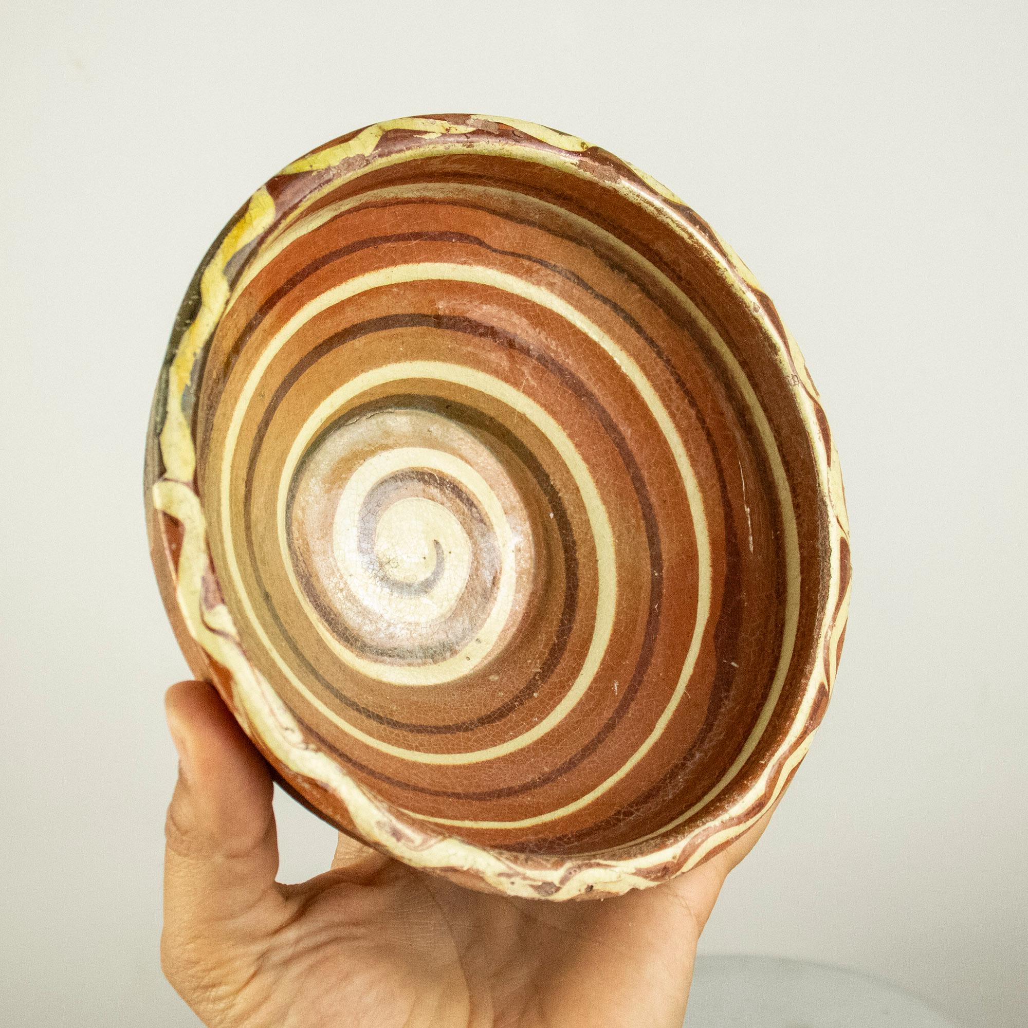 This beautiful handmade vintage clay bowl is a lovely example of traditional Romanian pottery. Featuring an eye-catching swirl pattern in earthy green and brown tones, it reflects the unique craftsmanship and folk art style typical of the region.