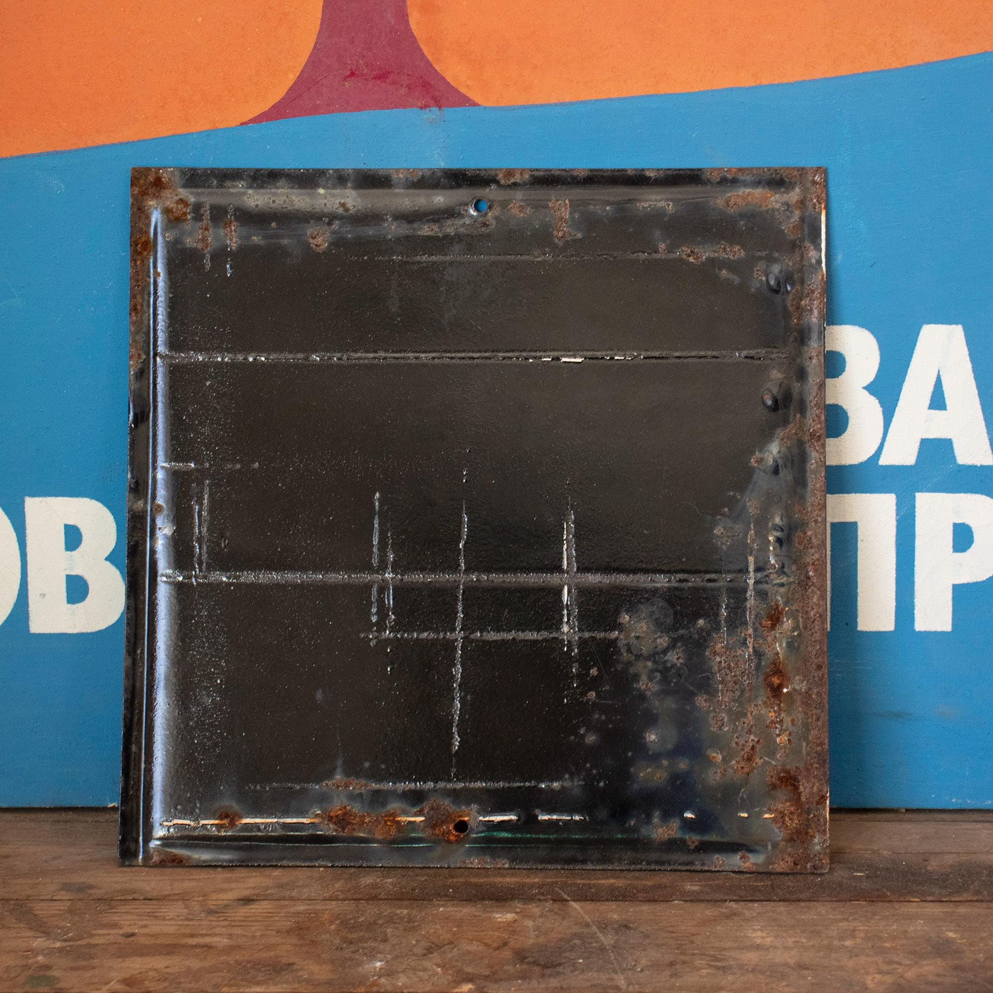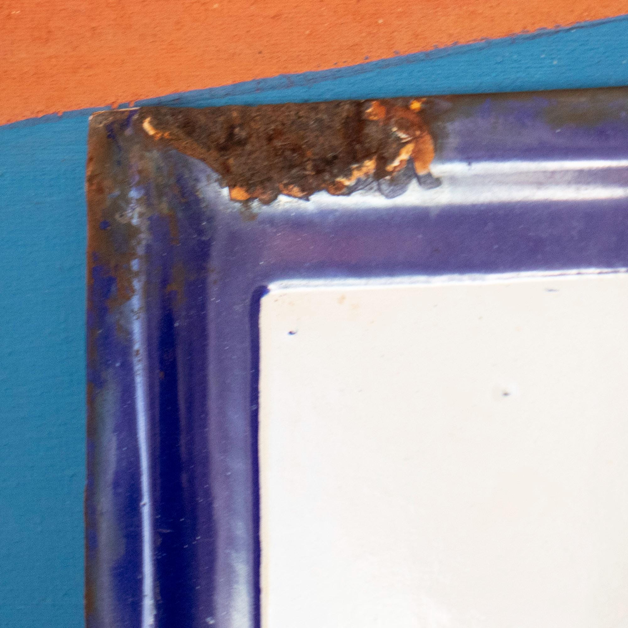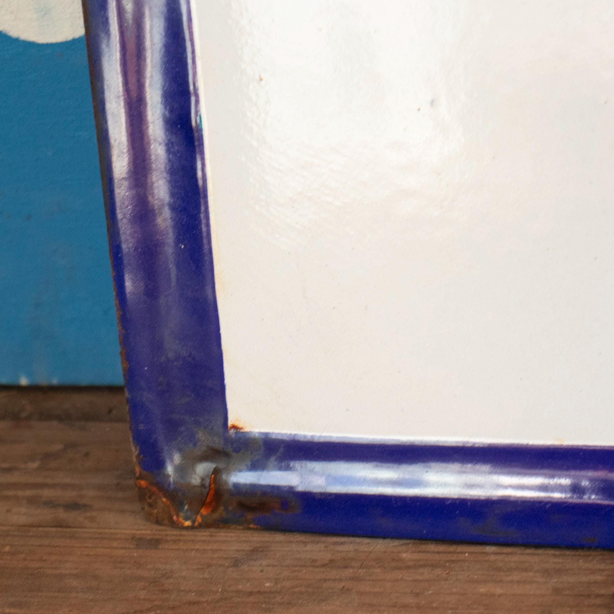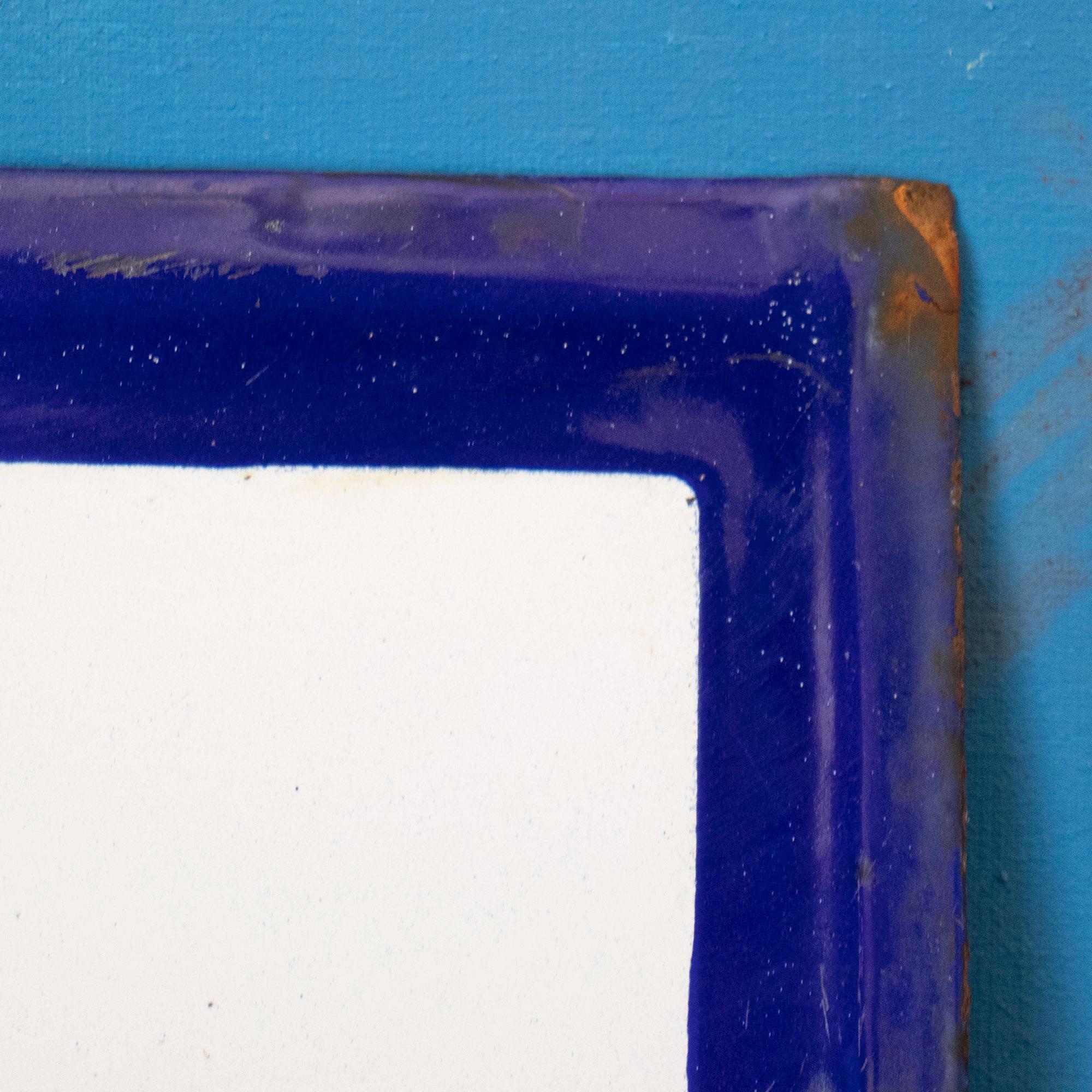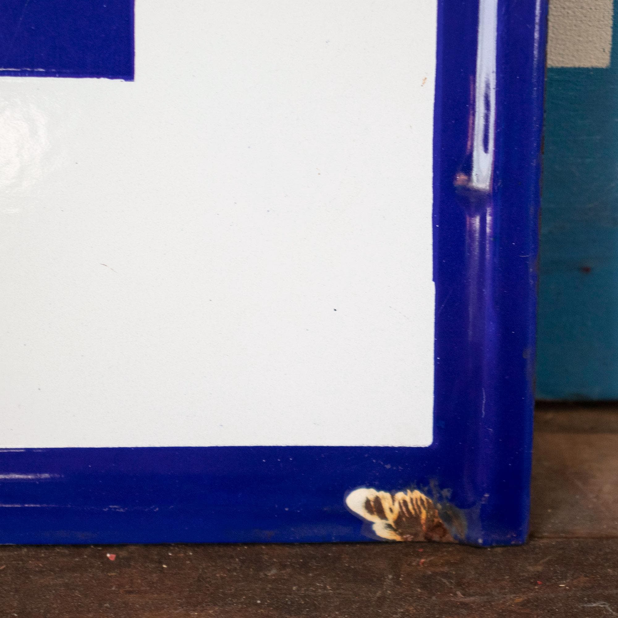 Made of heavy metal with glossy enamel coating, the sign is bordered in deep cobalt blue and shows light rust and patina, typical for its age. Its clean, minimalist design is characteristic of Eastern Bloc industrial aesthetics, making it both a collectible piece of design history and a great industrial-style decoration.