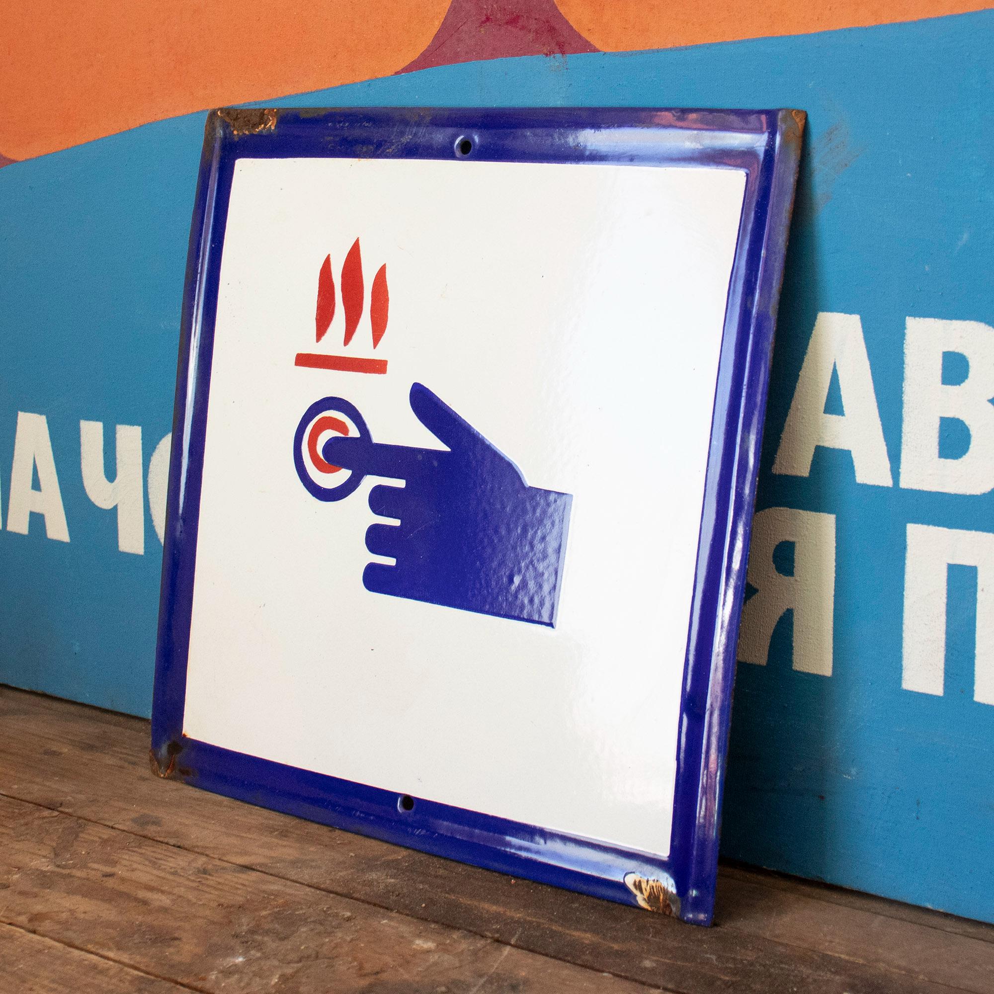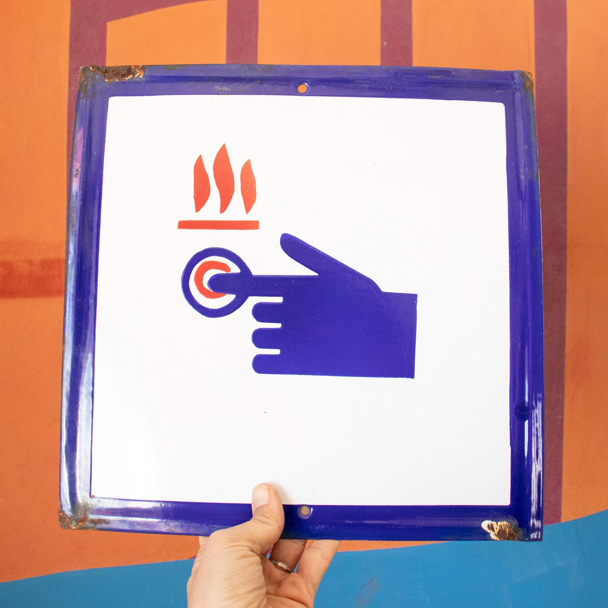 This original industrial enamel sign was made in Communist Bulgaria during the 1970s–1980s. It features a striking graphic of a hand touching a hot surface with red heat waves above it — an instructional warning used in factories and workshops to indicate danger from hot machinery or surfaces.