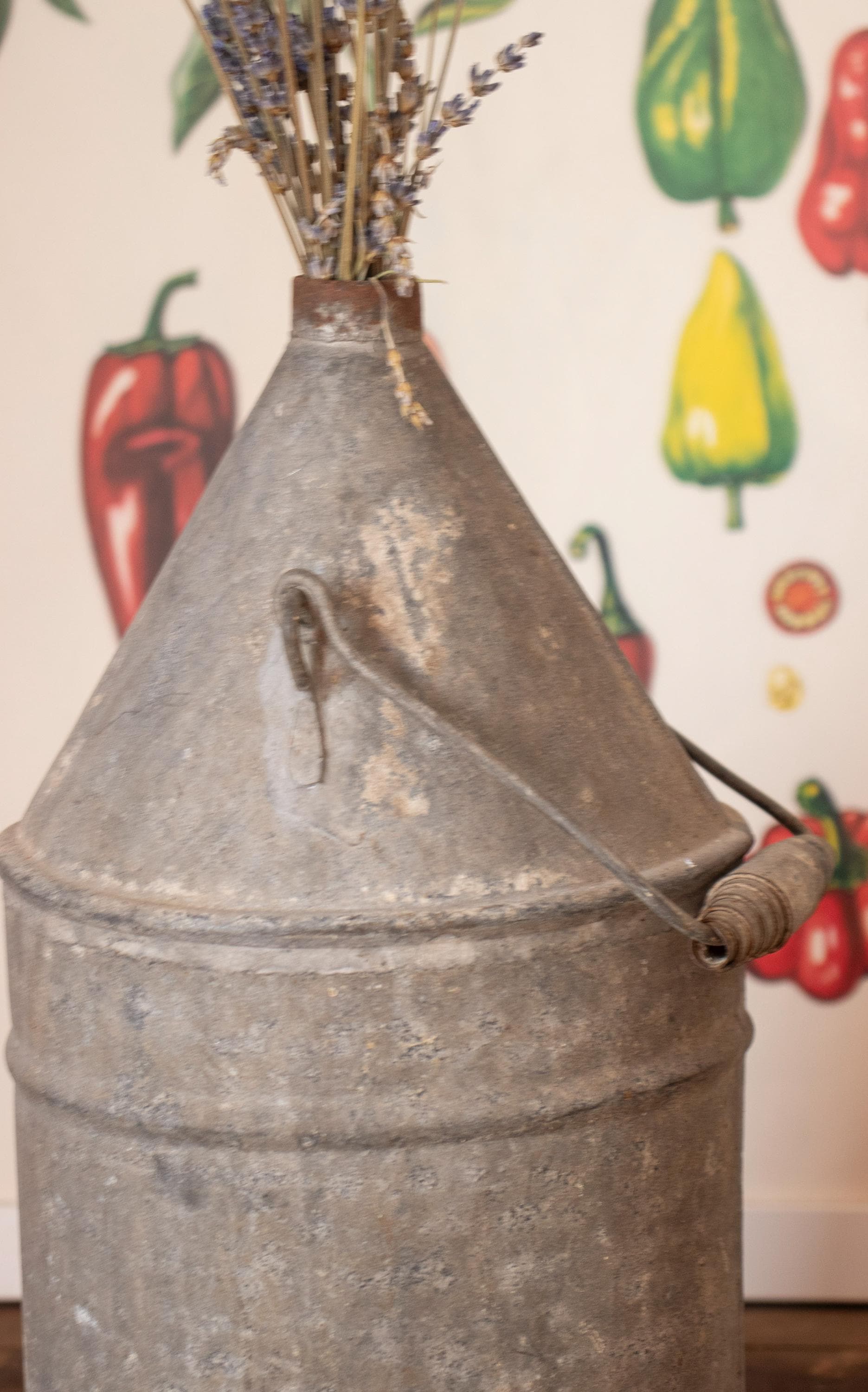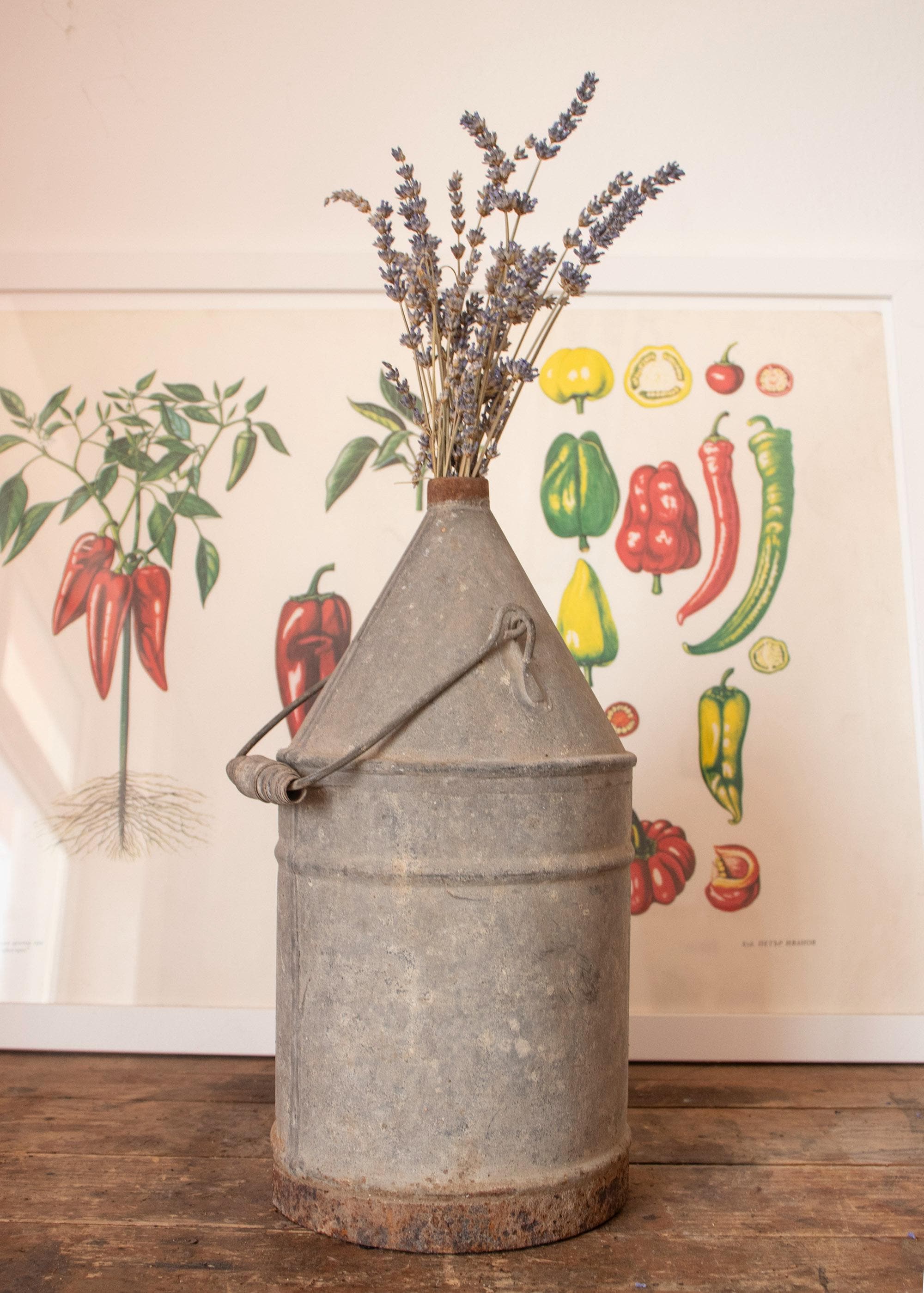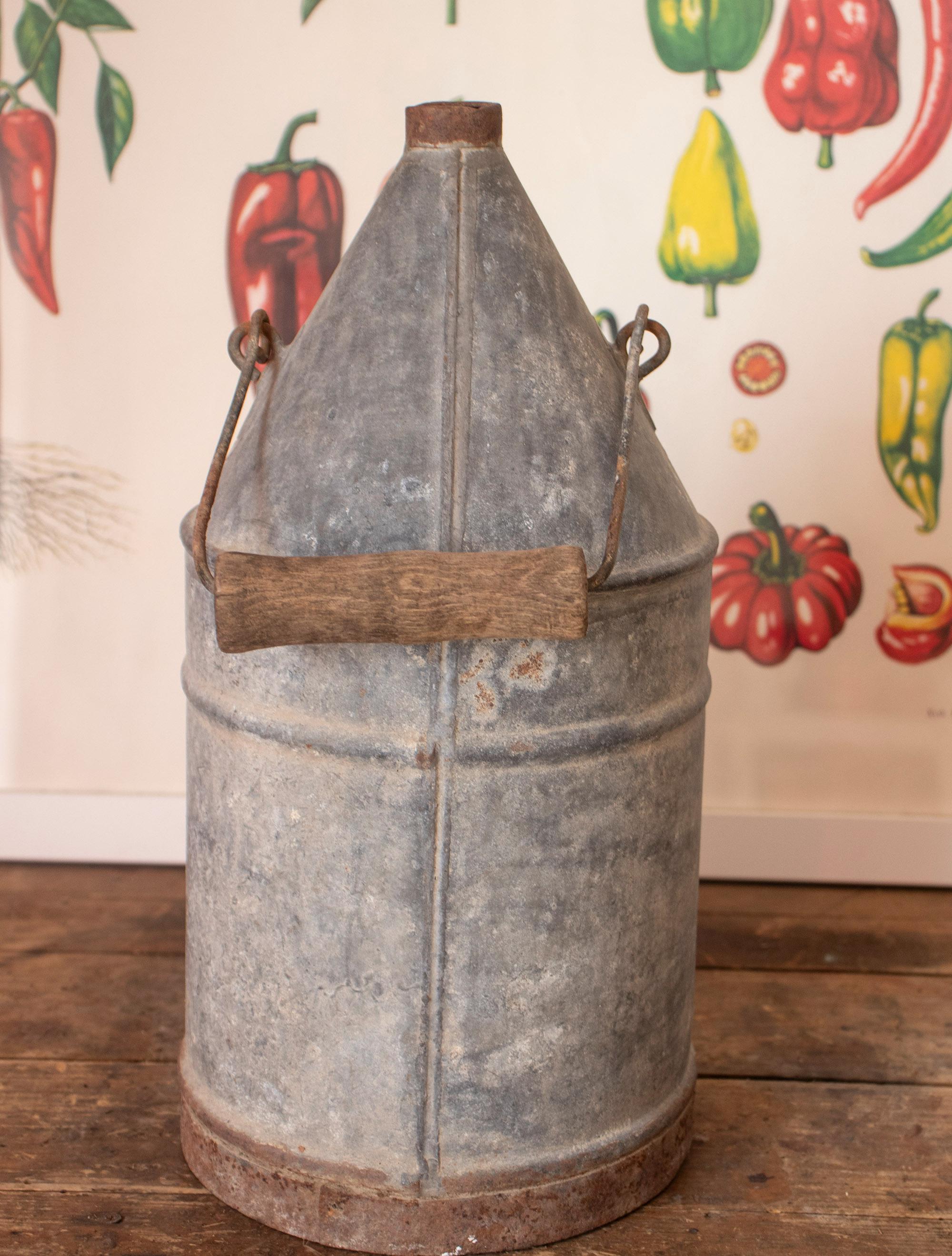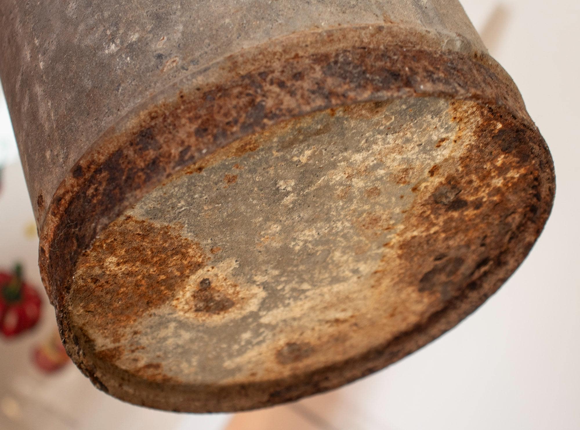 Made of galvanized metal with a handle and a conical top, each can shows its own patina and traces of use — rust, wear, and dents that only add to its character. Perfect as a vase for dried flowers, a kitchen or garden accent, or simply as a display piece with timeless industrial beauty.