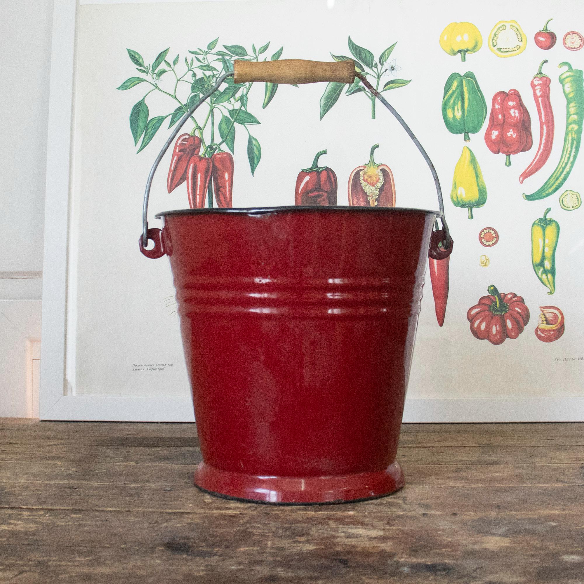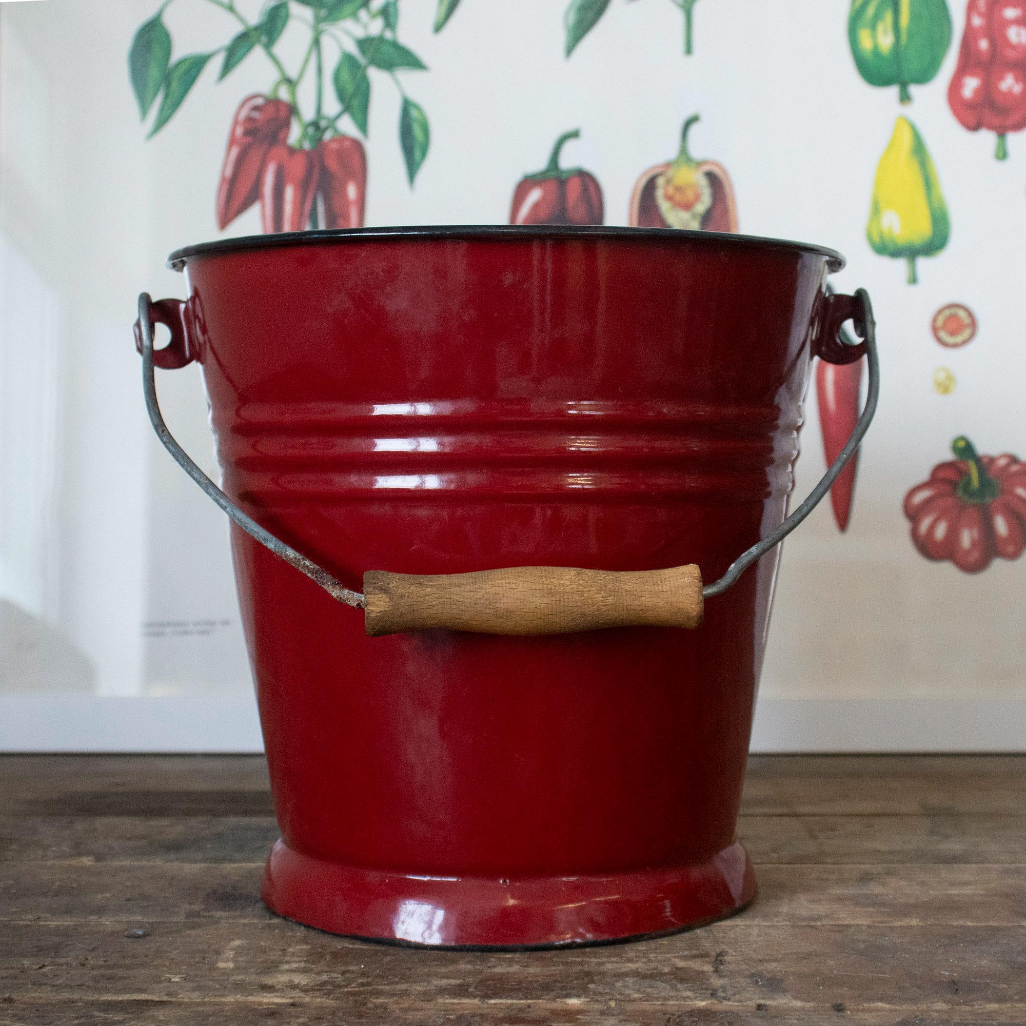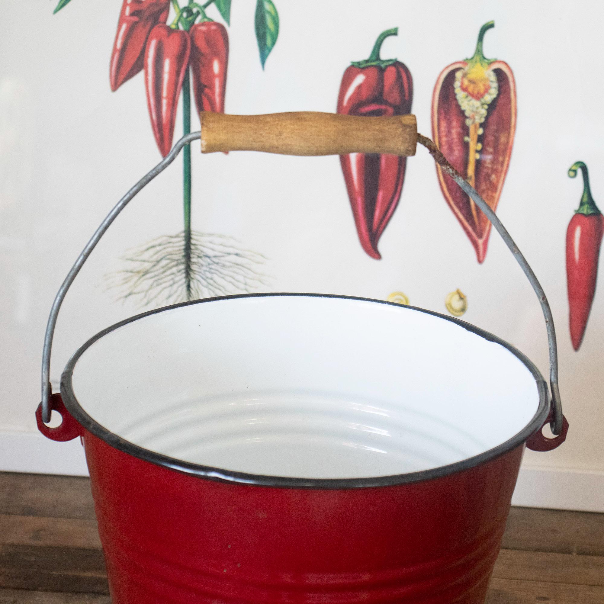 This lovely small enamel bucket was made by Ibili in Spain and features a vibrant red exterior, white interior, and a sturdy wooden handle. A perfect blend of charm and functionality, it’s ideal for use as a flower pot, storage container, or decorative accent in your farmhouse-style kitchen or garden.