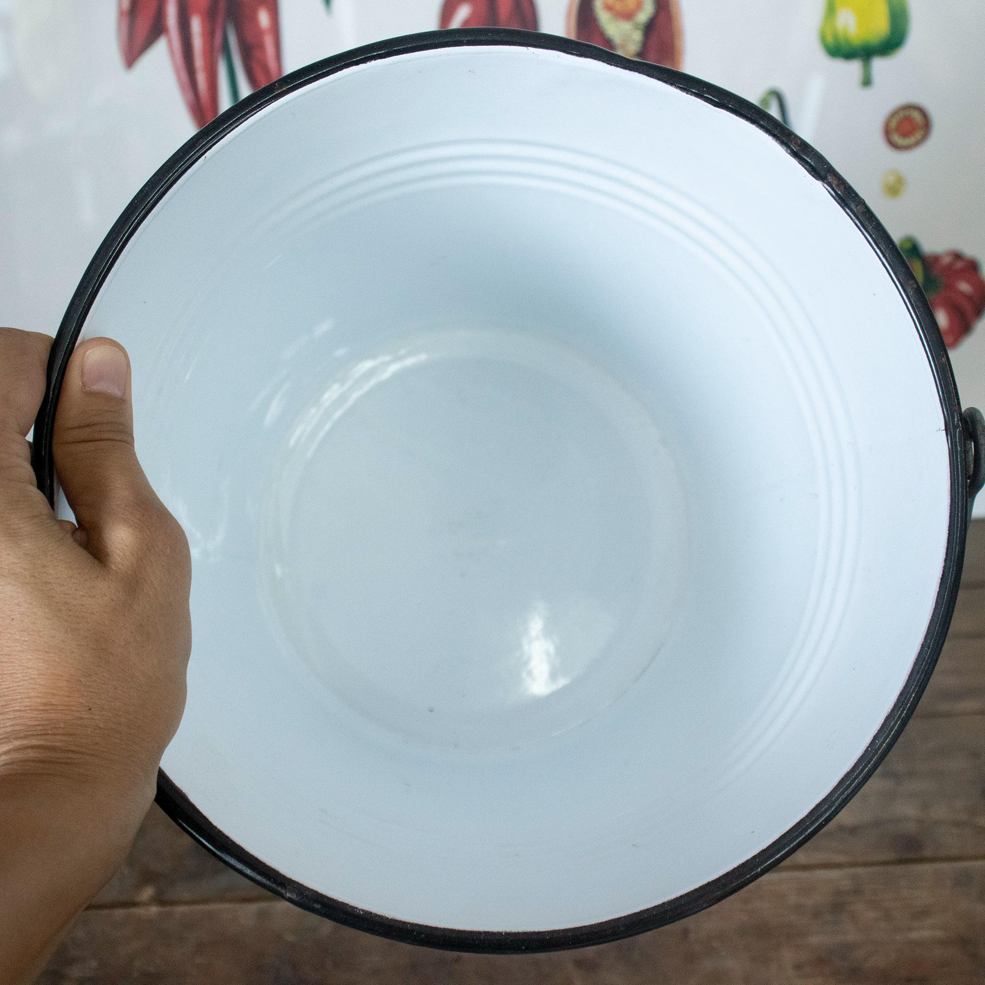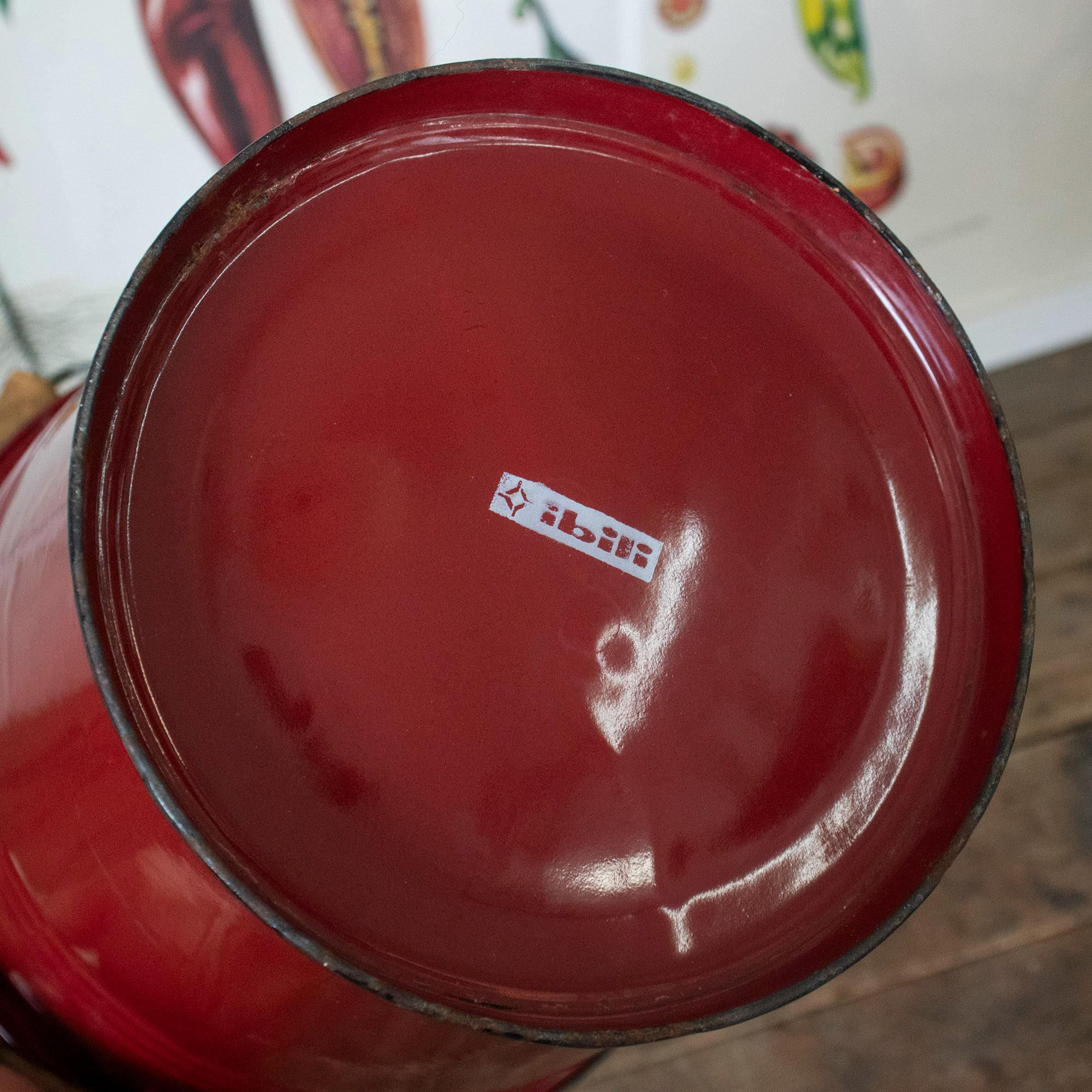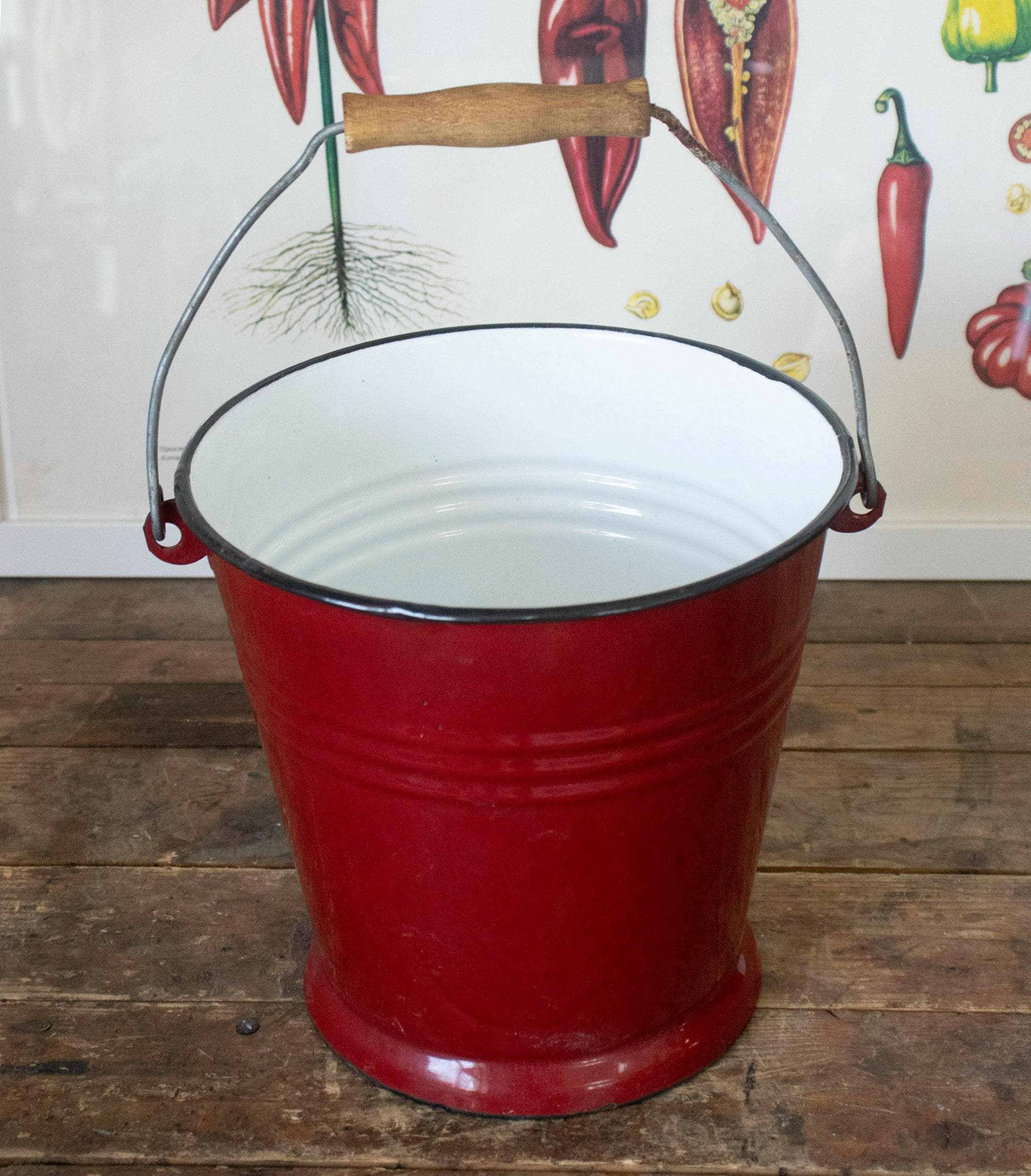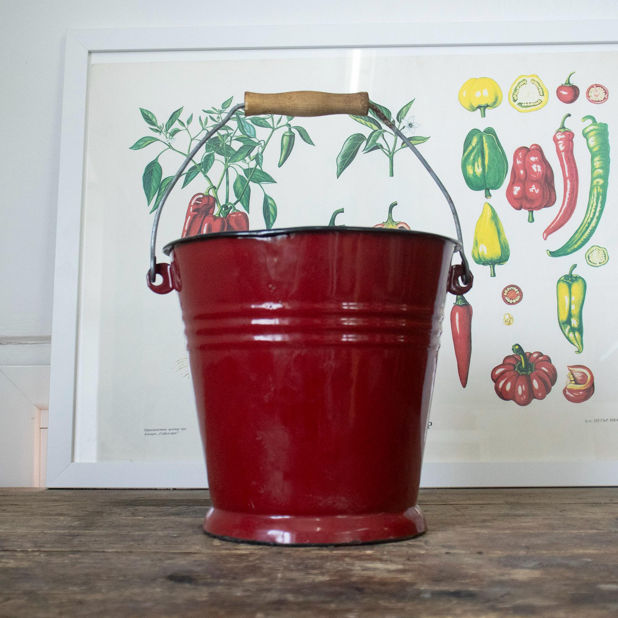 This lovely small enamel bucket was made by Ibili in Spain and features a vibrant red exterior, white interior, and a sturdy wooden handle. A perfect blend of charm and functionality, it’s ideal for use as a flower pot, storage container, or decorative accent in your farmhouse-style kitchen or garden.