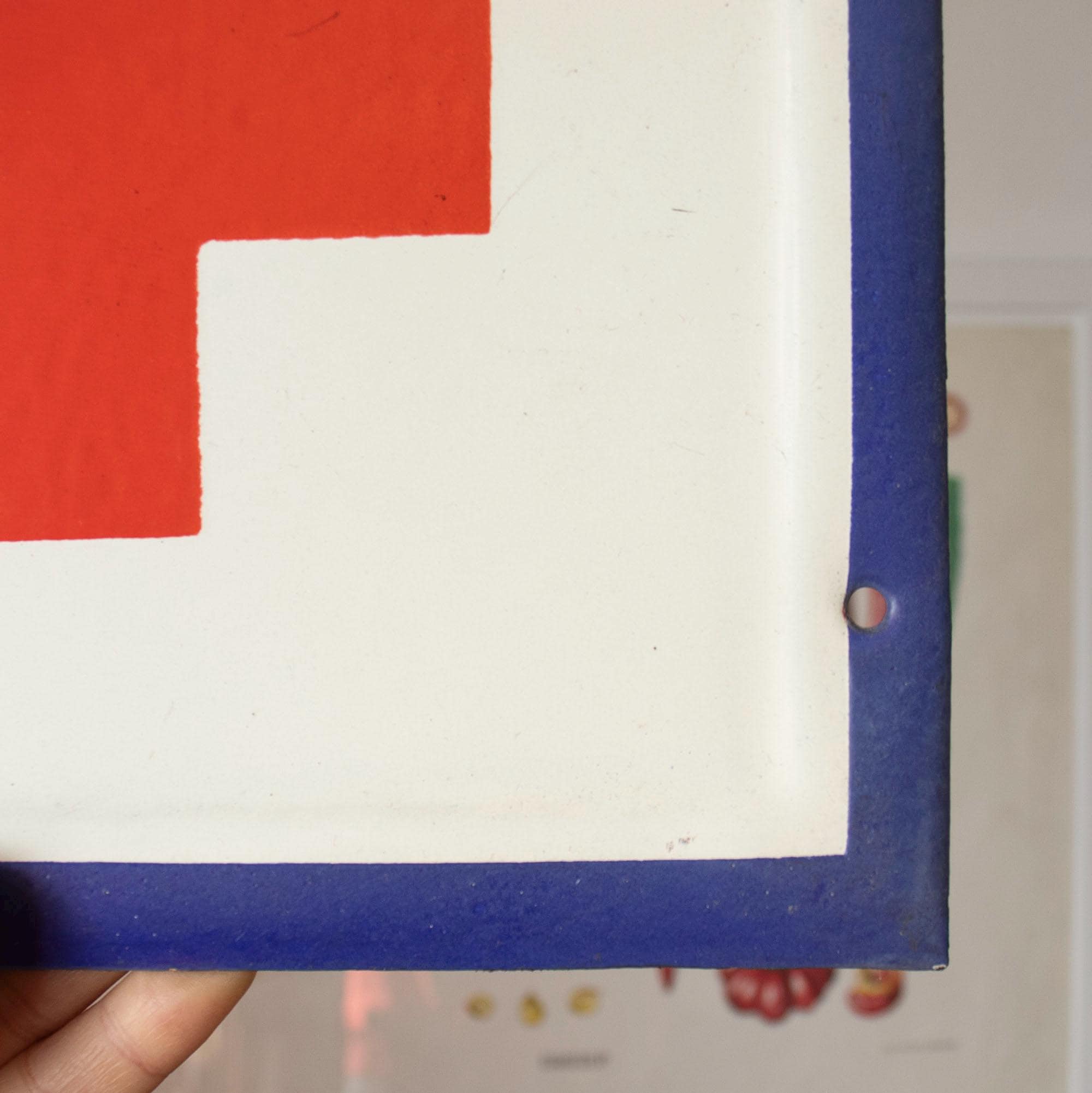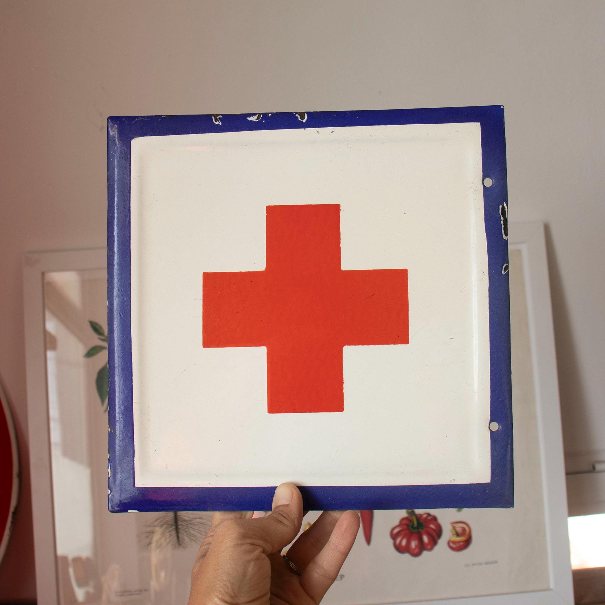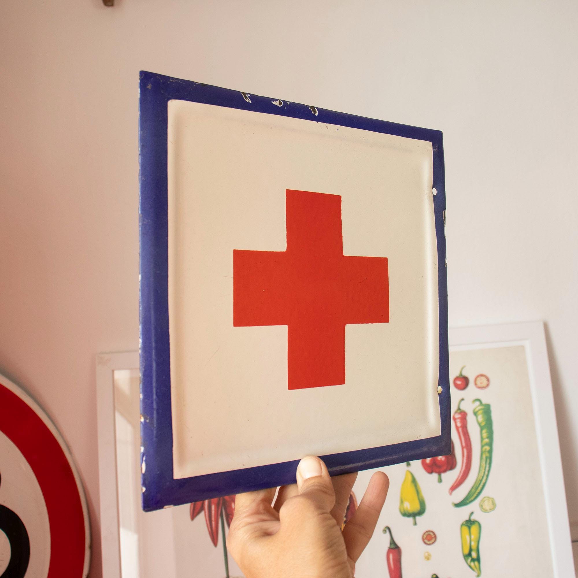 A lovely vintage porcelain enamel sign featuring the timeless red cross symbol. Originally used in public buildings and factories, it marked the entrance to the nurse’s or doctor’s office — a small but powerful icon of care and safety.