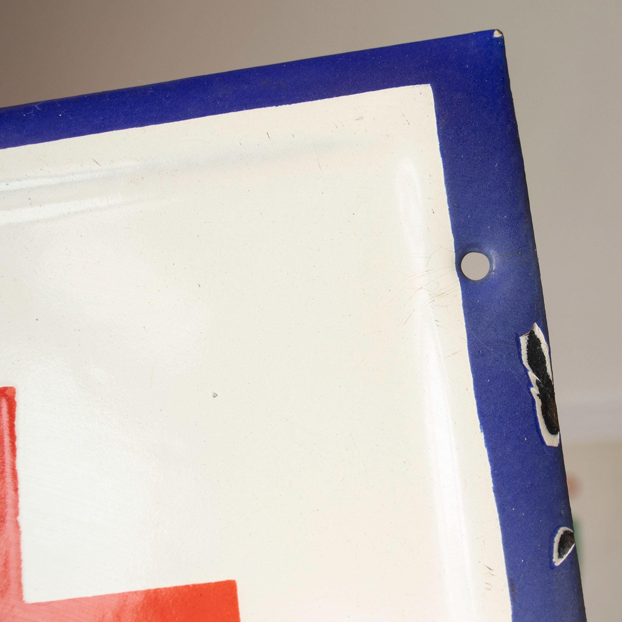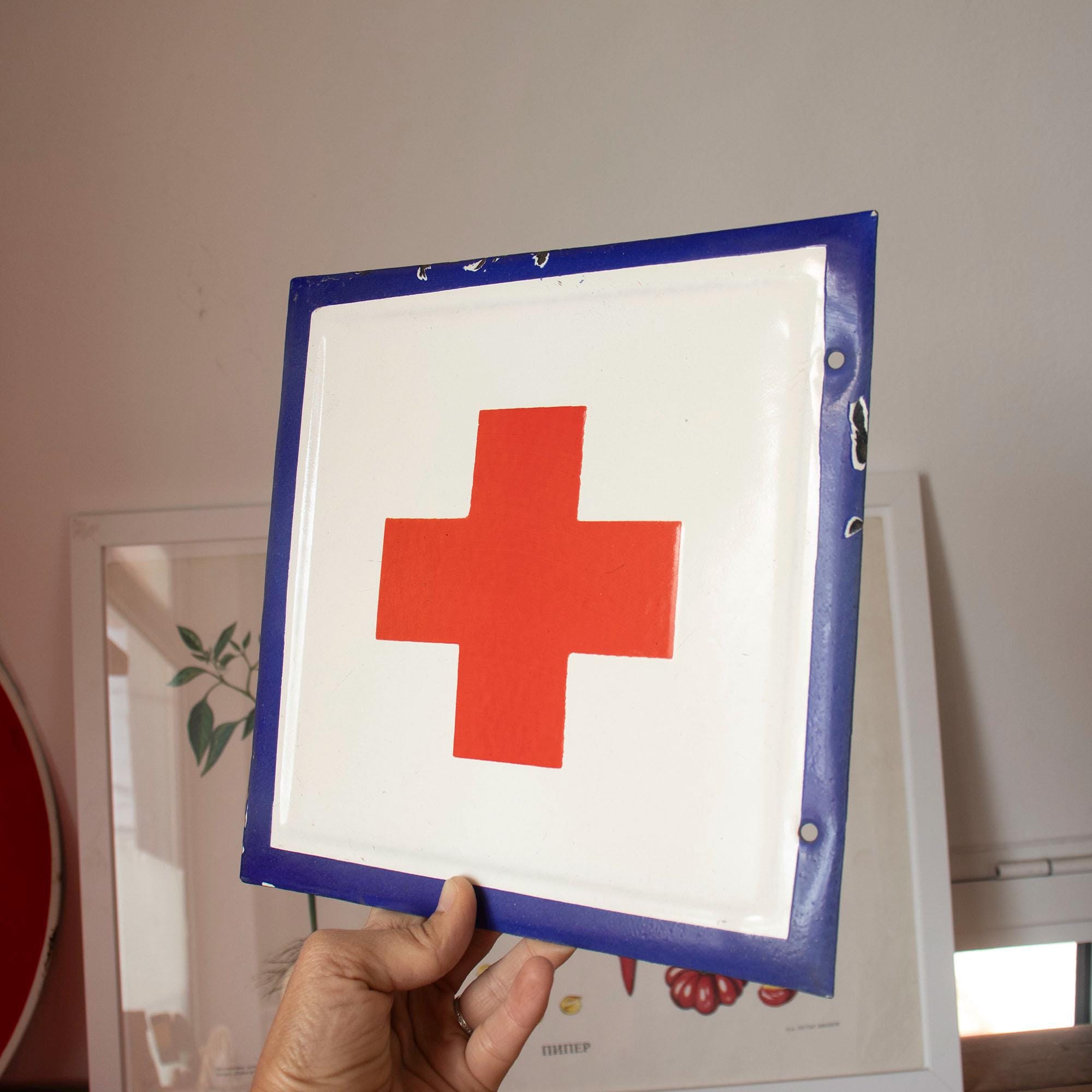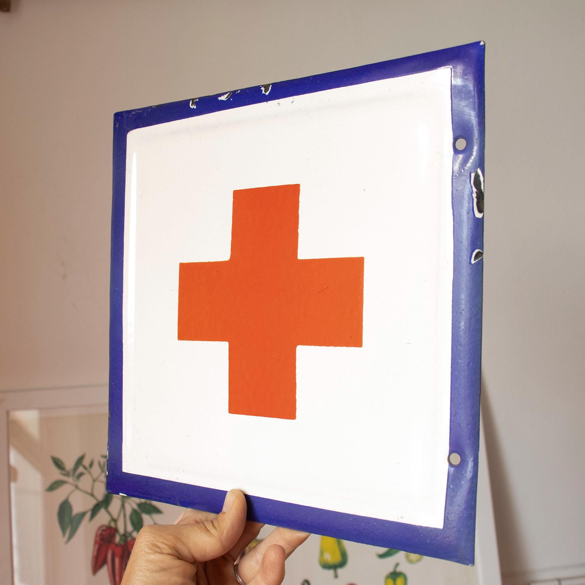 A lovely vintage porcelain enamel sign featuring the timeless red cross symbol. Originally used in public buildings and factories, it marked the entrance to the nurse’s or doctor’s office — a small but powerful icon of care and safety.
