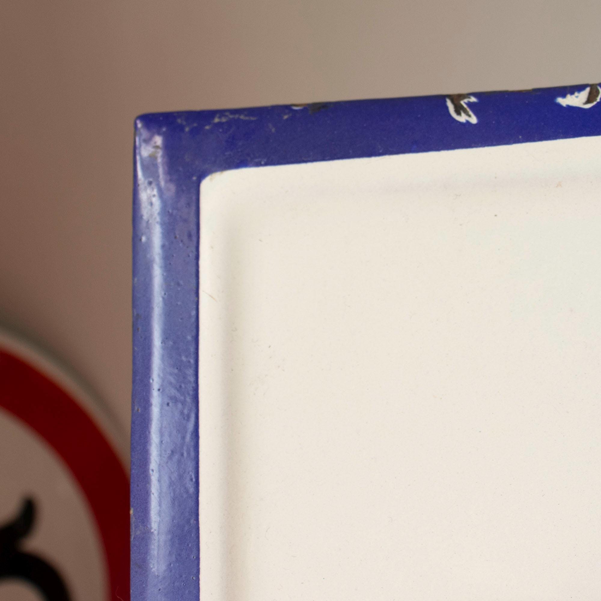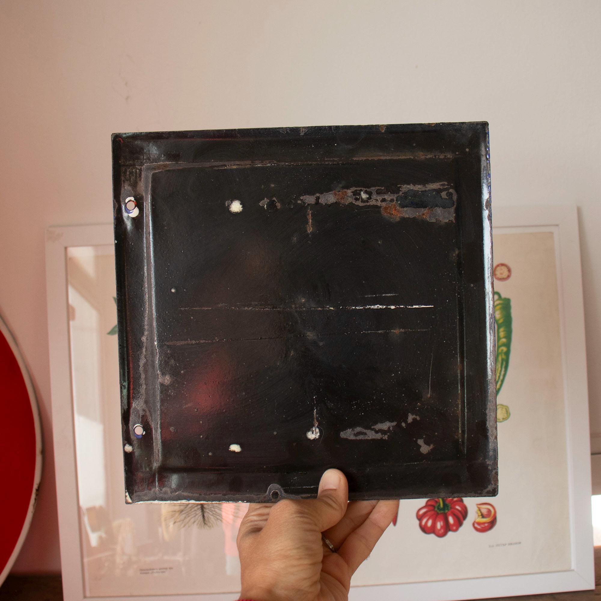 Crafted from metal and coated with a glossy layer of enamel, this piece has survived beautifully through the years. The colors remain vivid, with just the right amount of wear to tell their story.