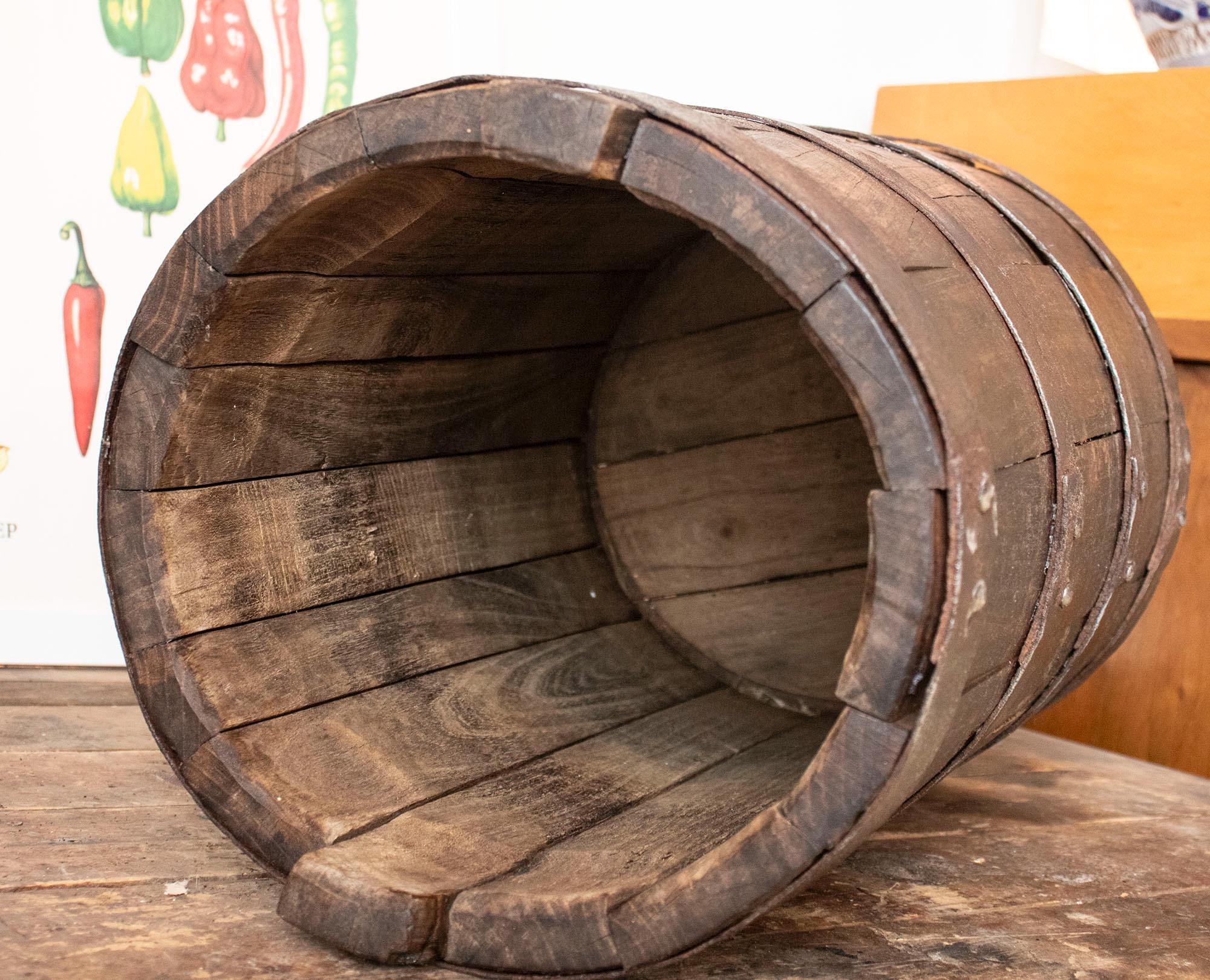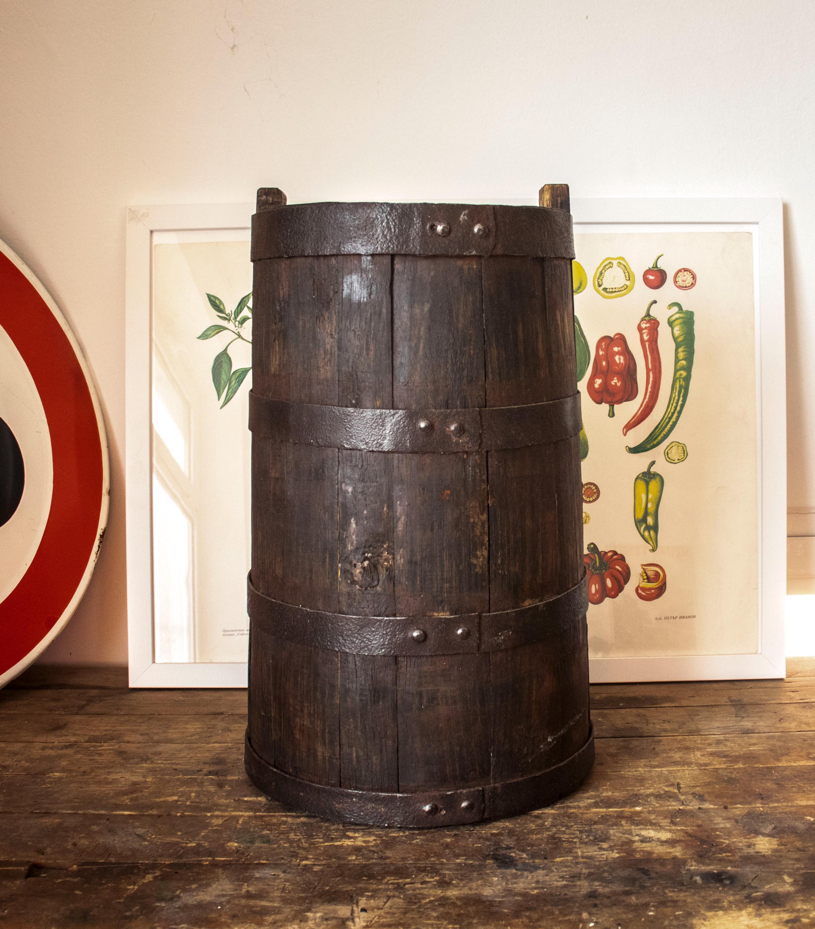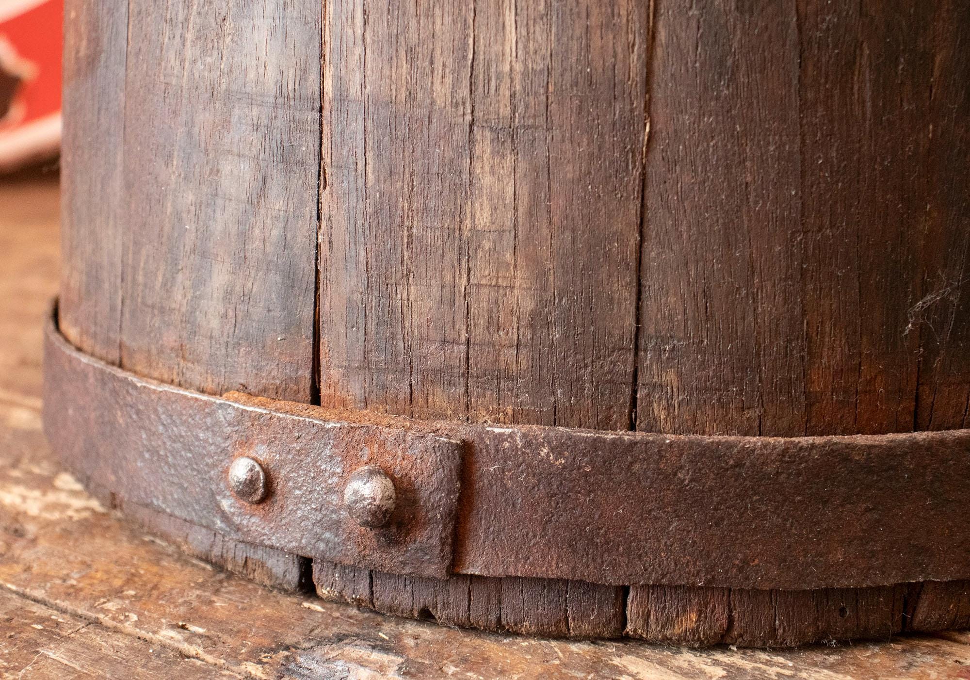 Its dark aged patina, visible wooden texture, and hand-forged metal hoops give it an authentic rustic character.