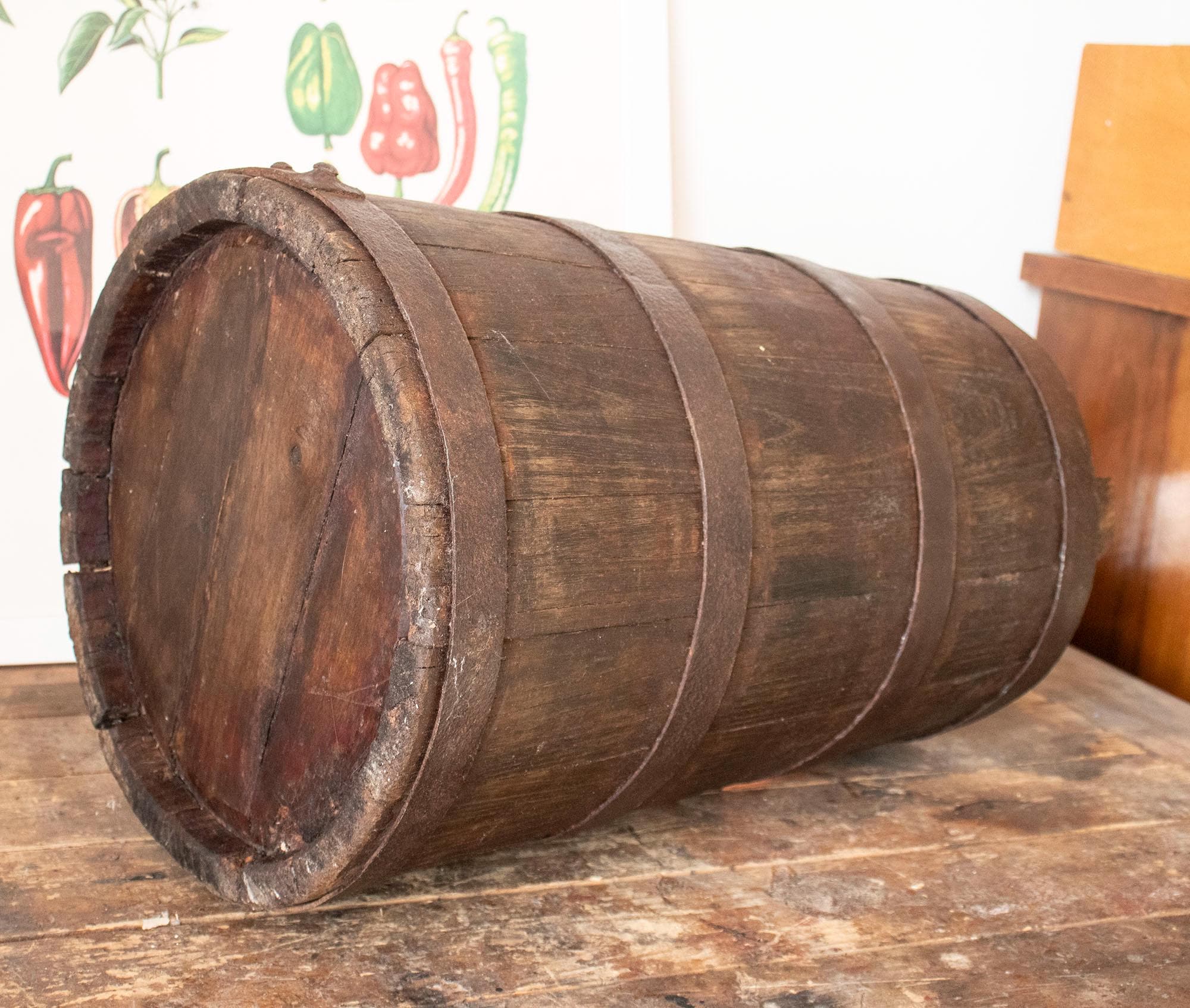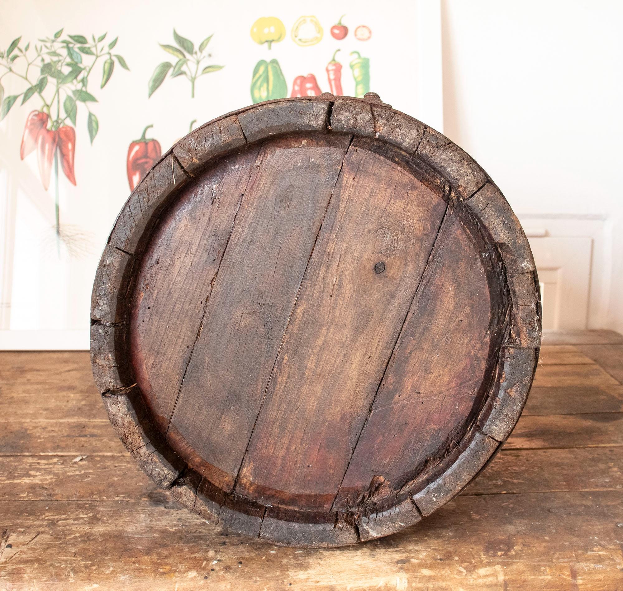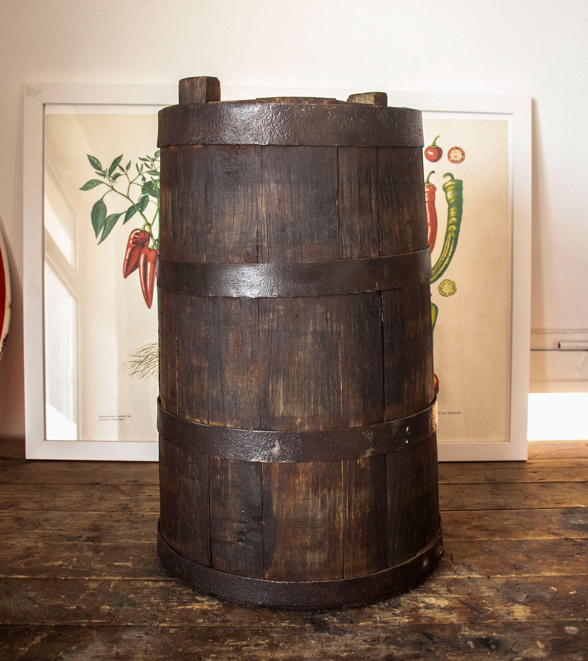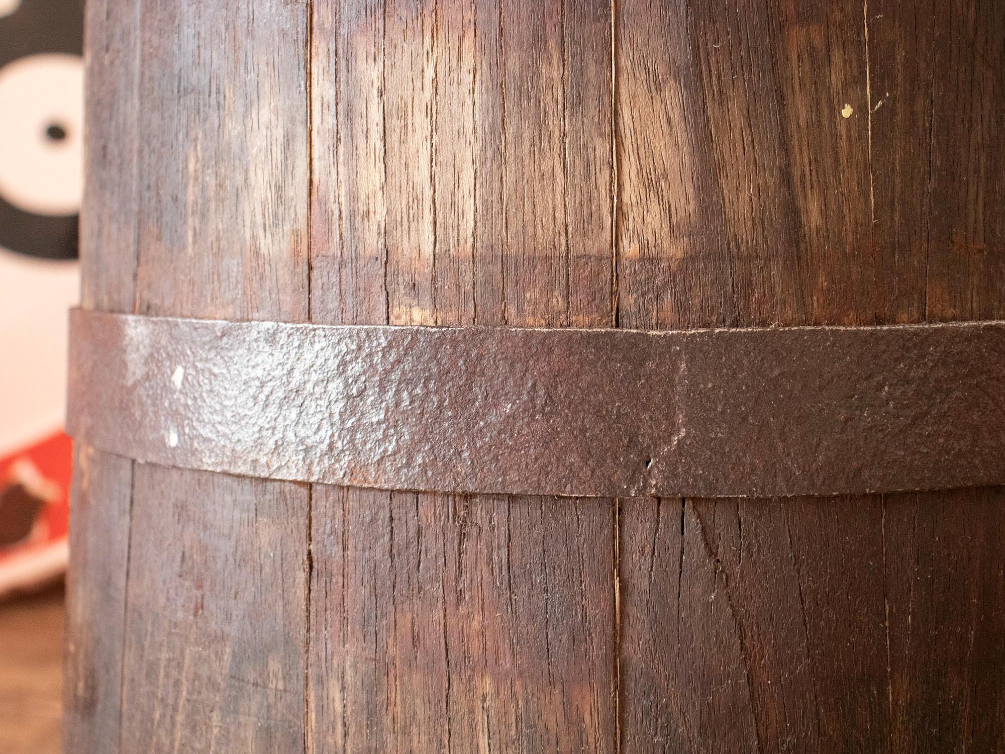 Its dark aged patina, visible wooden texture, and hand-forged metal hoops give it an authentic rustic character.