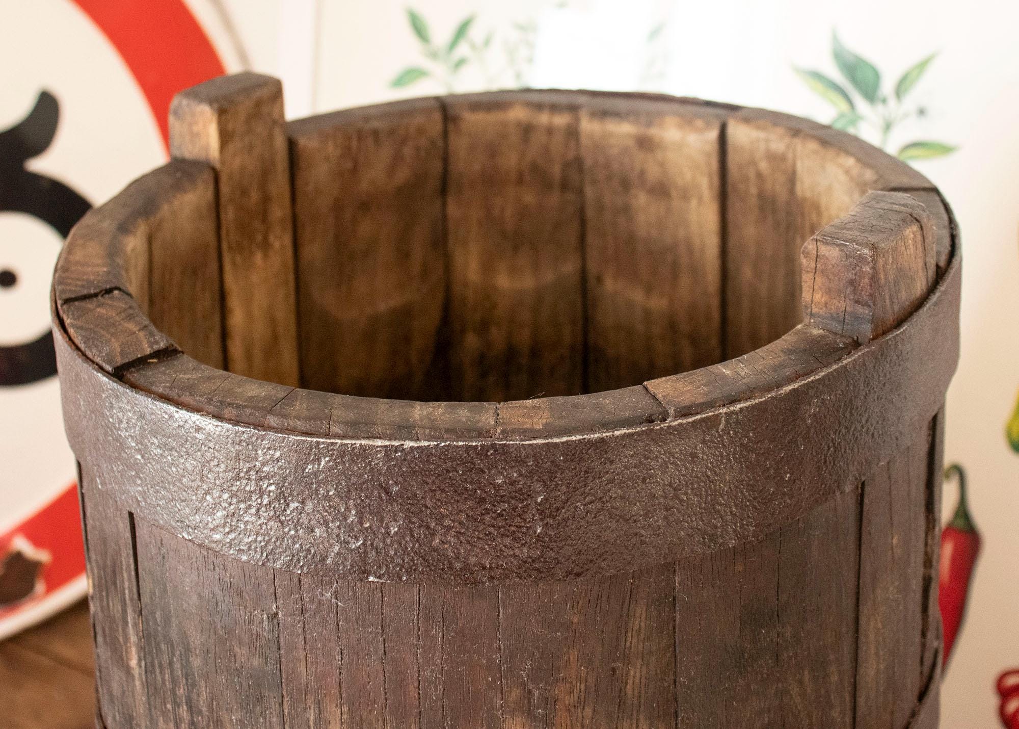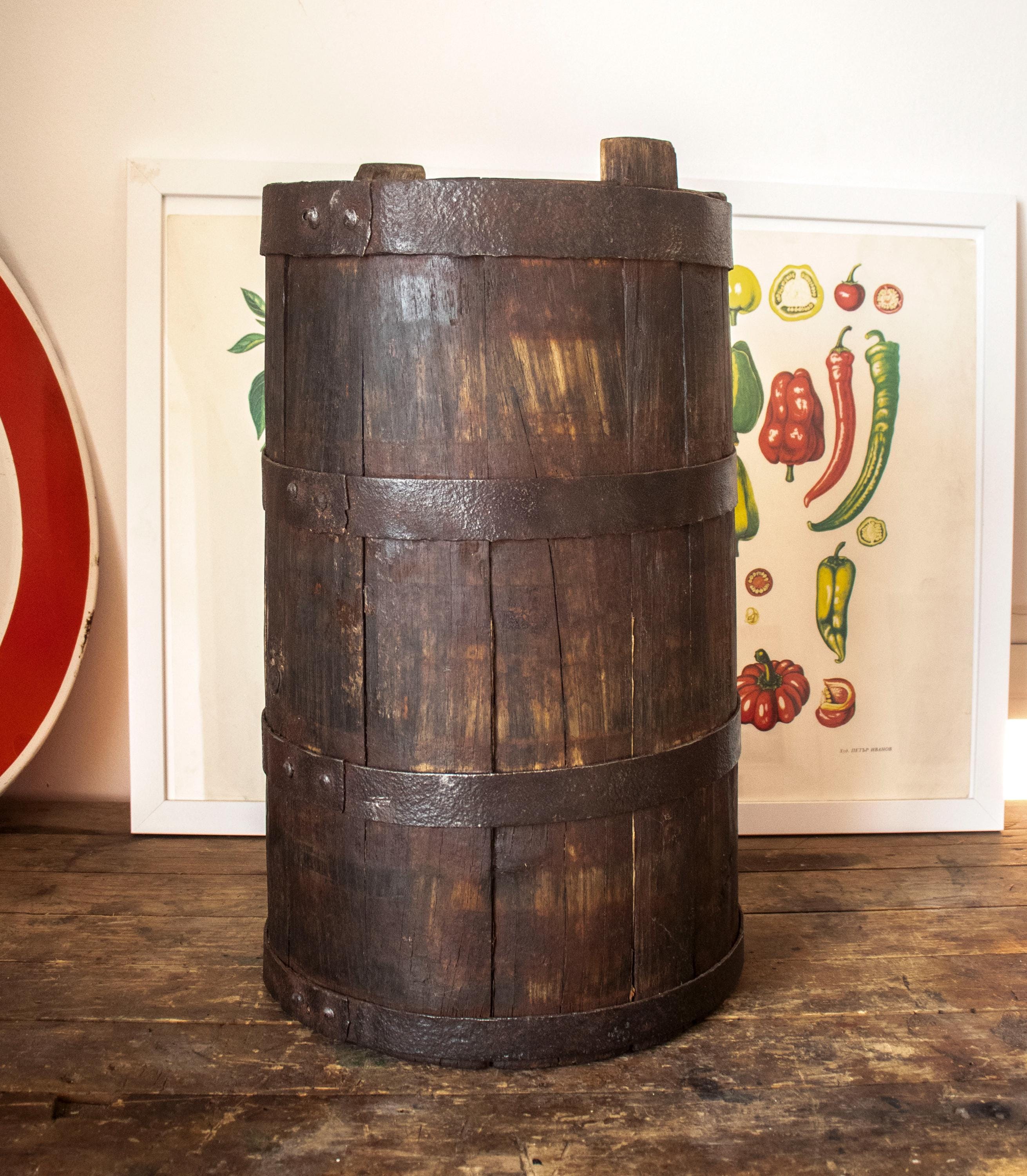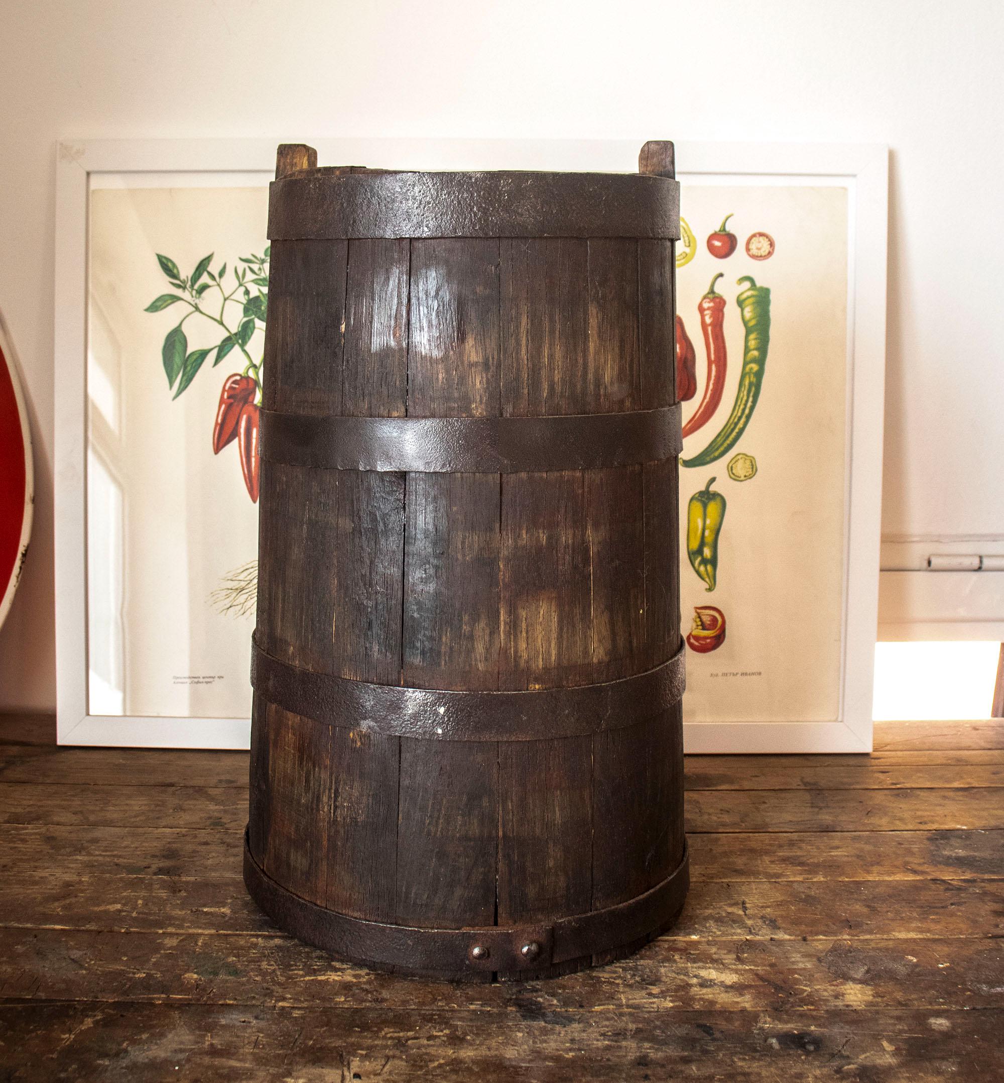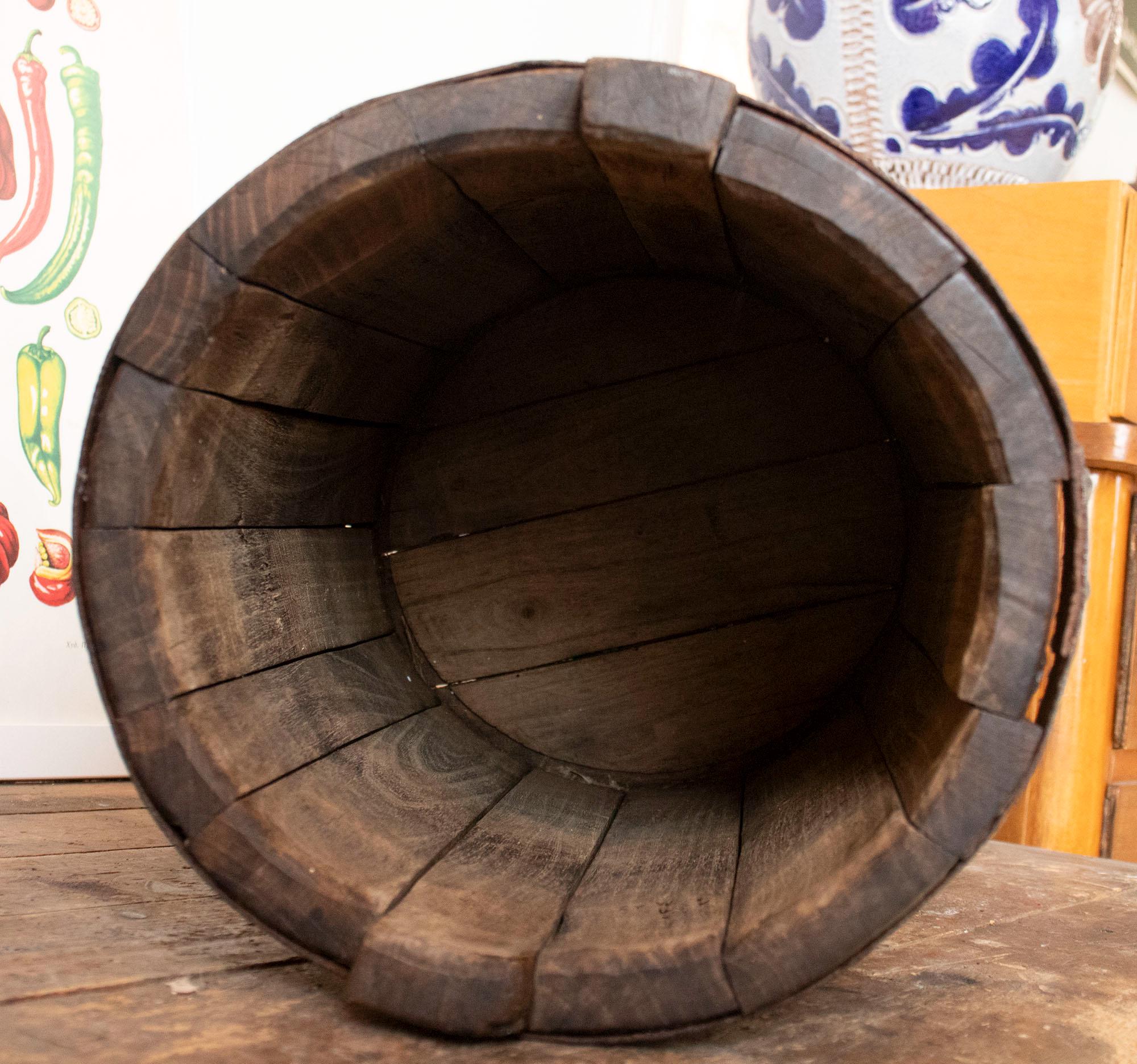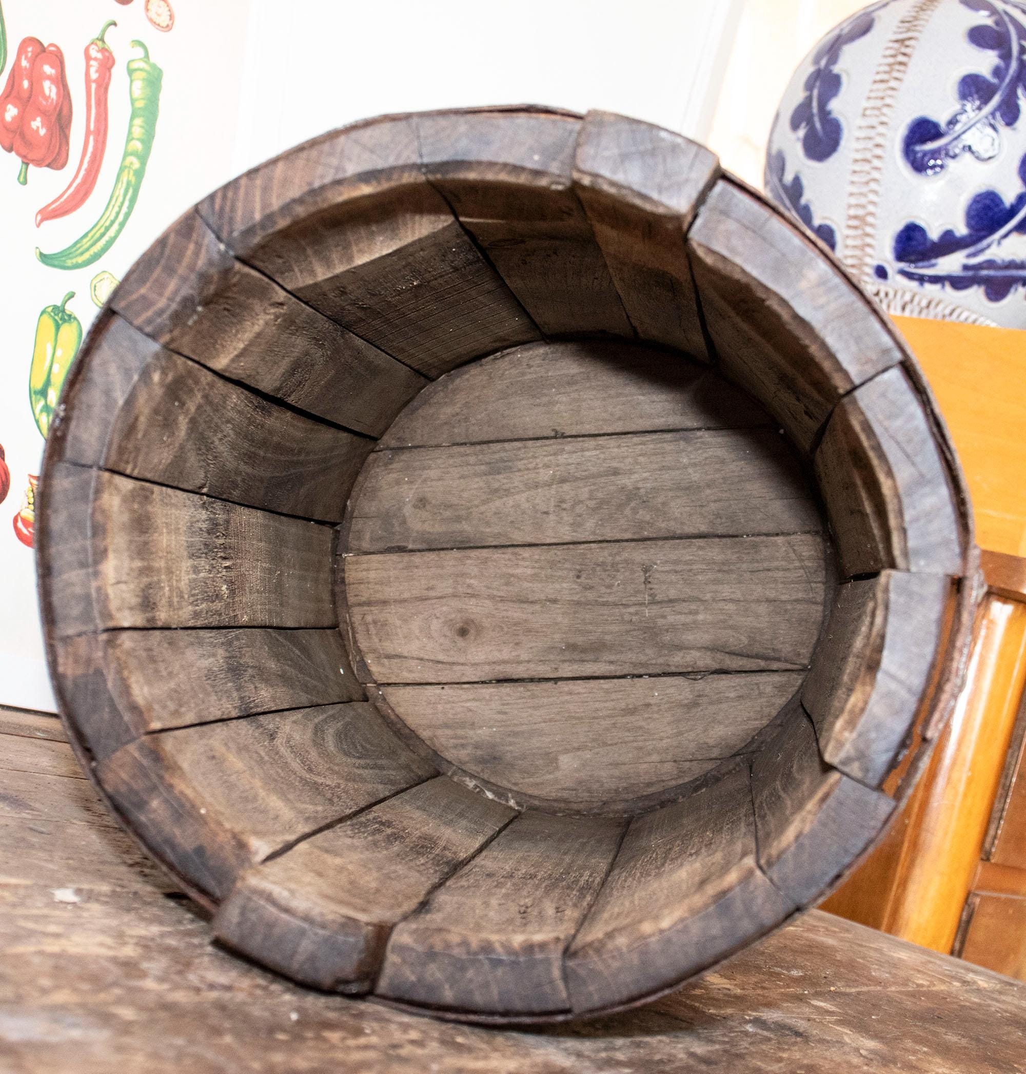 A charming antique wooden bucket, handcrafted from solid wood and reinforced with thick iron bands.