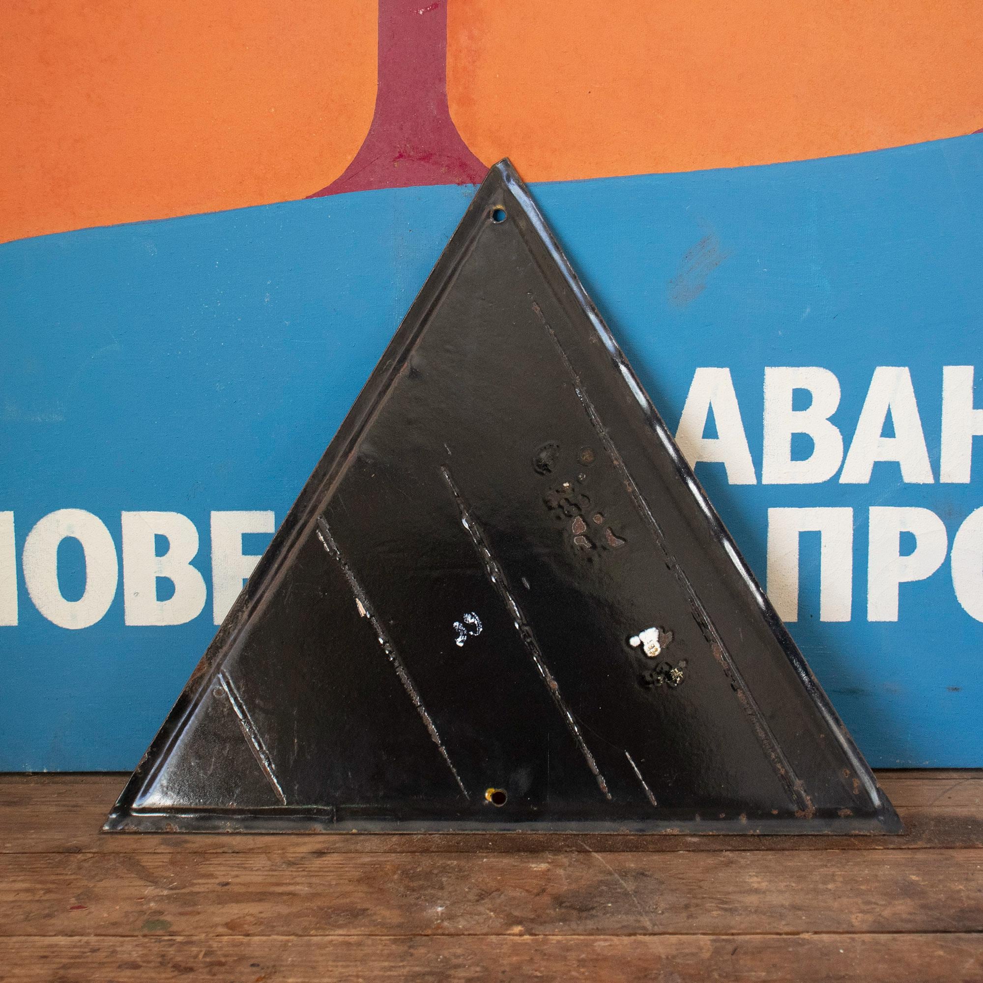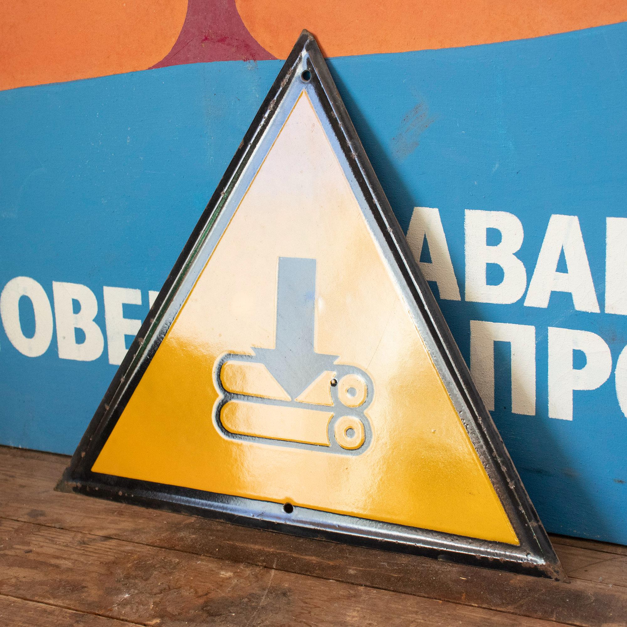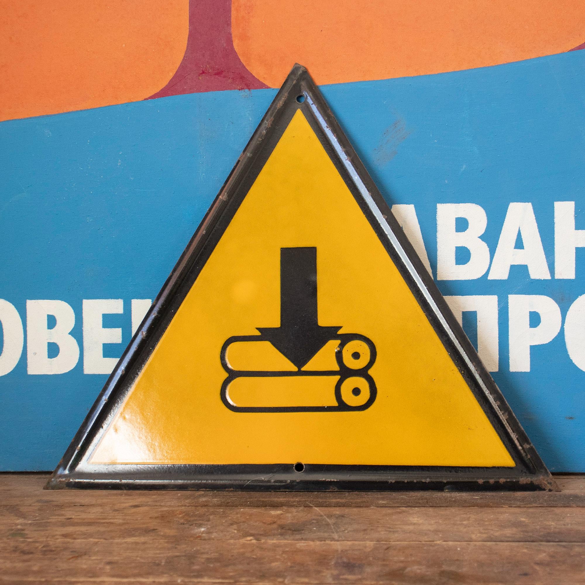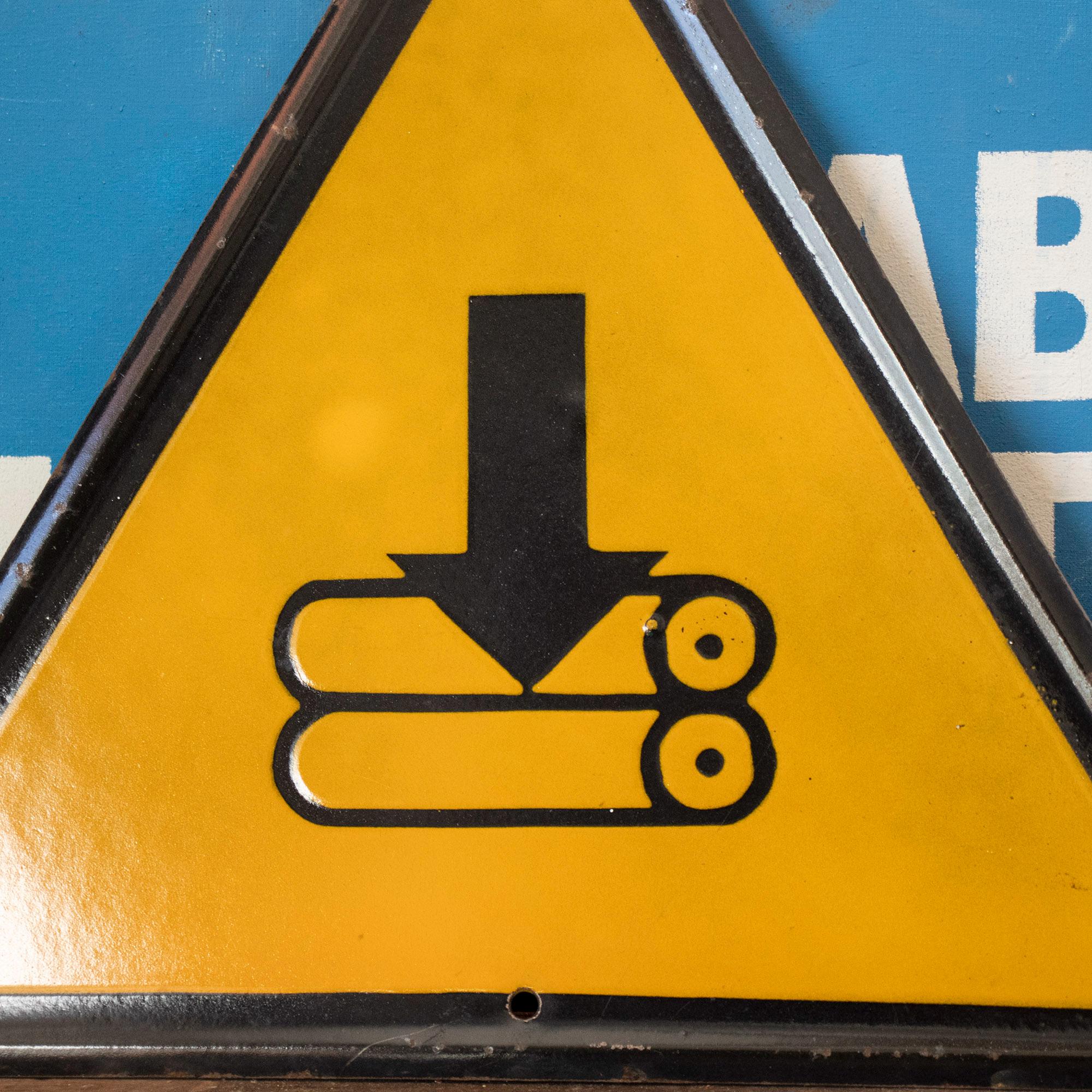 A striking vintage triangular enamel warning sign featuring a bold black graphic of a hand hazard on a yellow background.