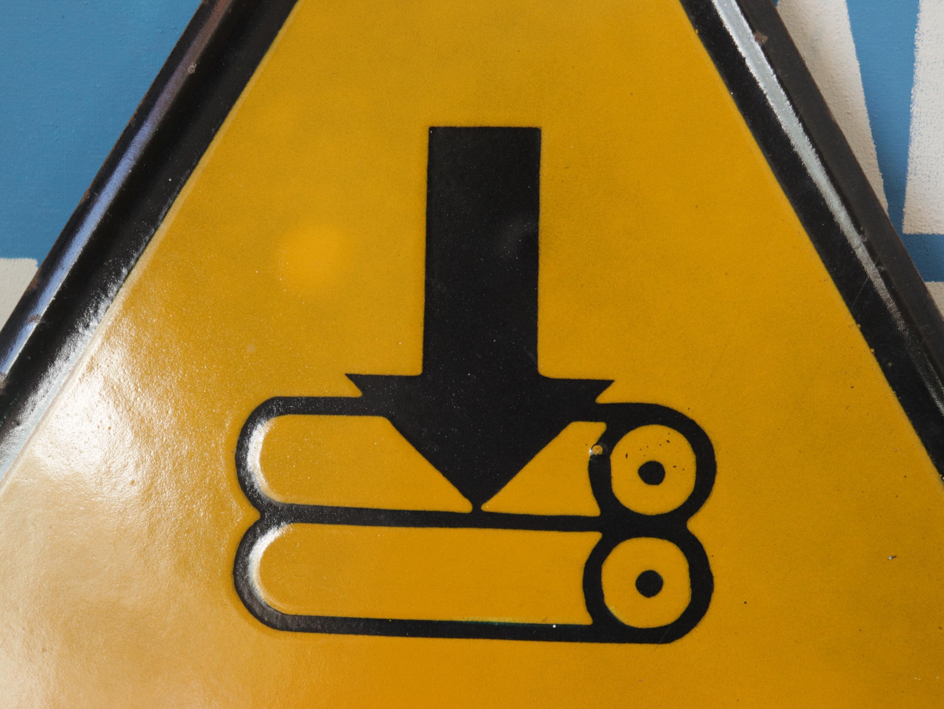 This sign was once used in factories and workshops to indicate a risk of injury from moving rollers or machinery.