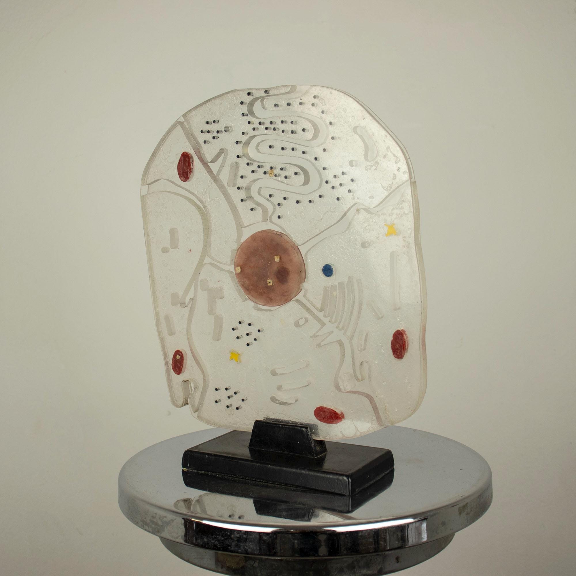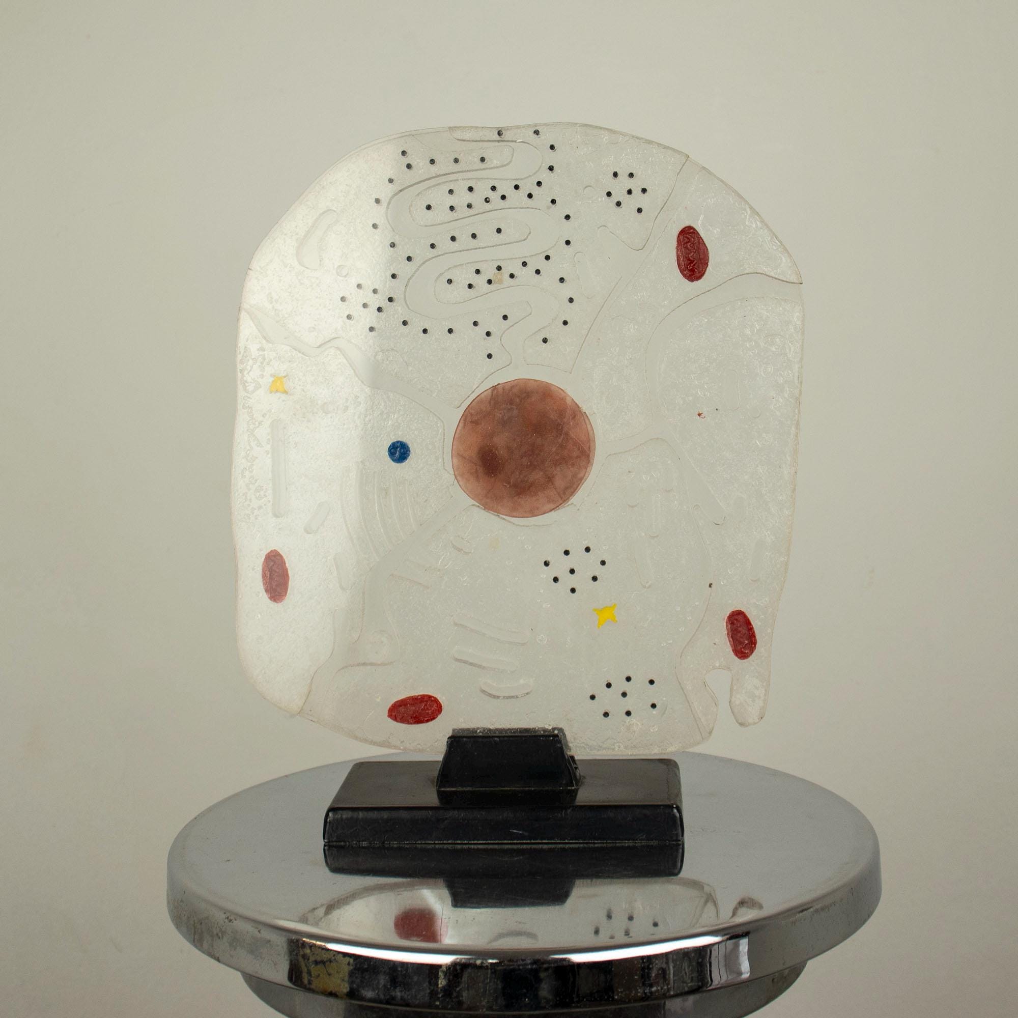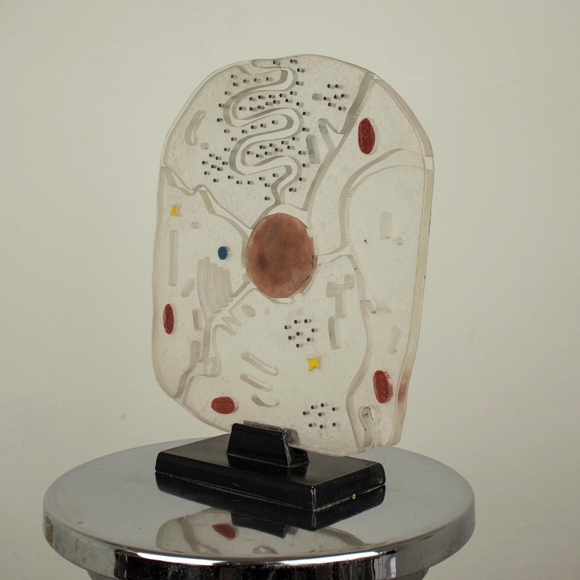 A wonderful vintage educational model of a eukaryotic animal cell, made of hard plastic and mounted on a black wooden base.