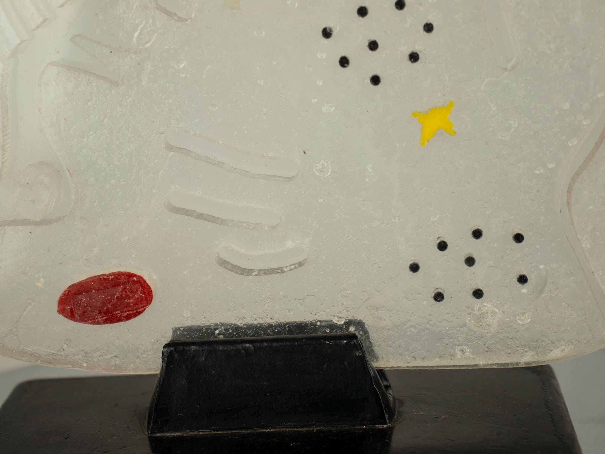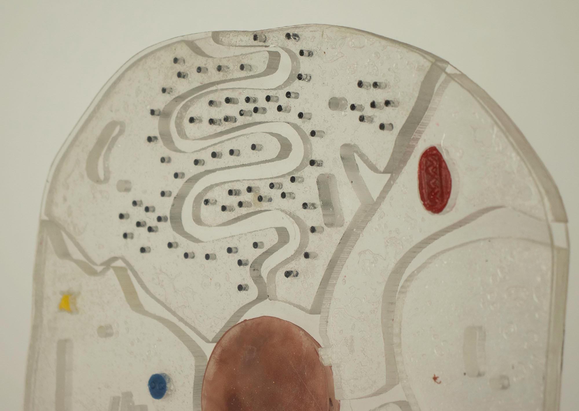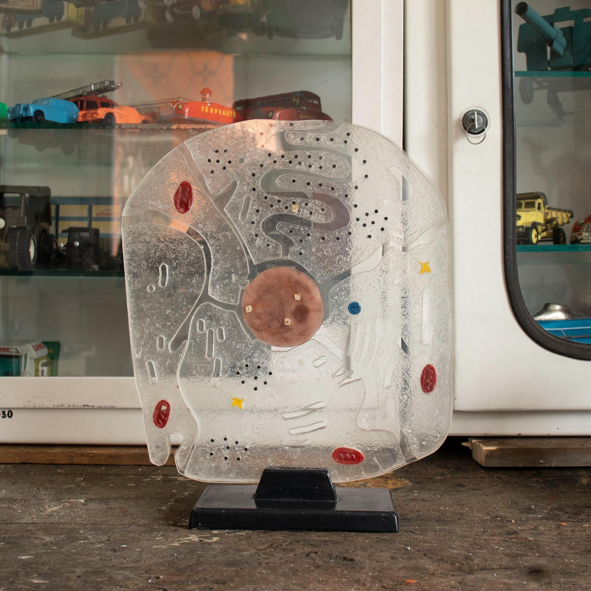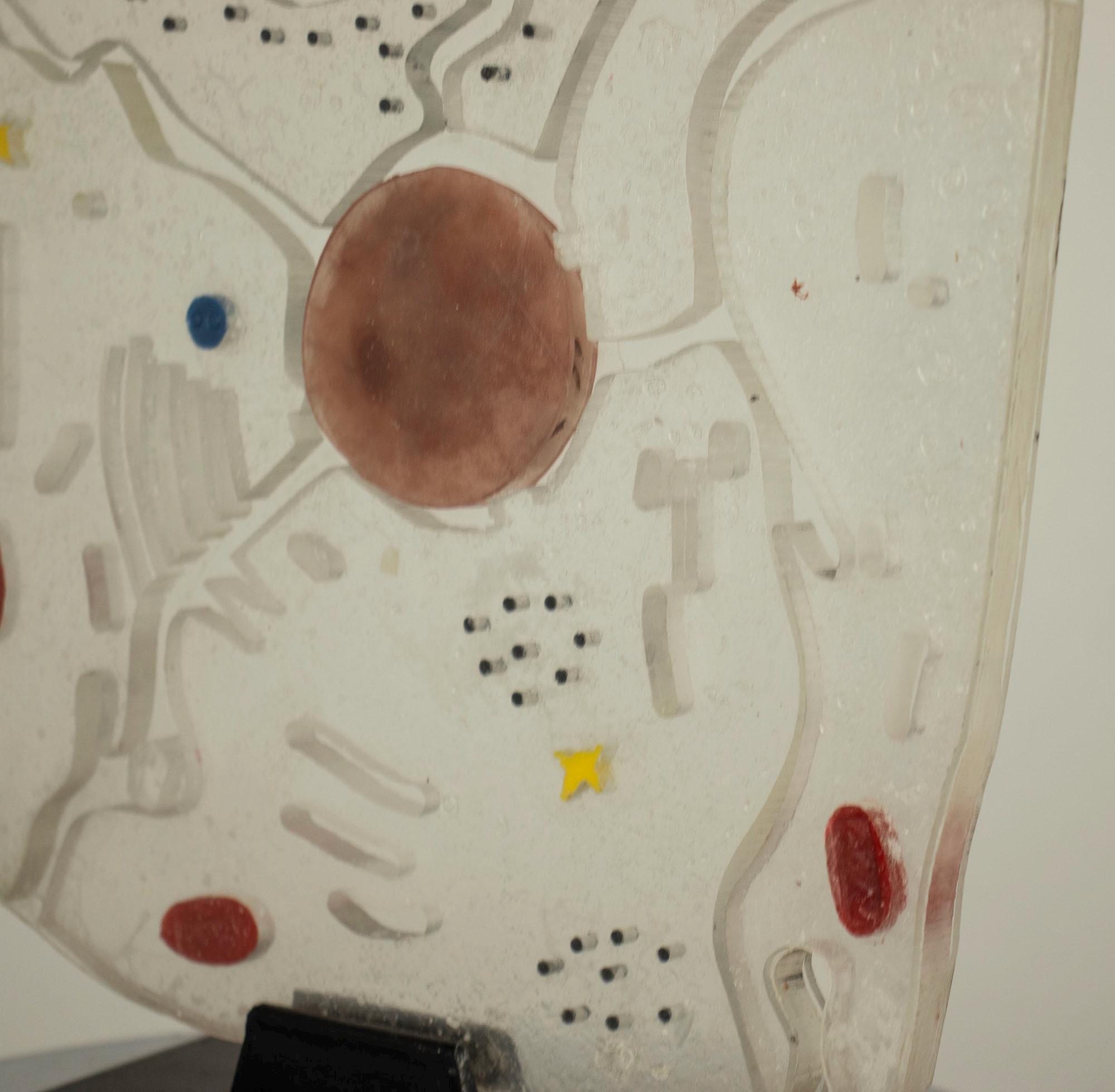 A wonderful vintage educational model of a eukaryotic animal cell, made of hard plastic and mounted on a black wooden base.
