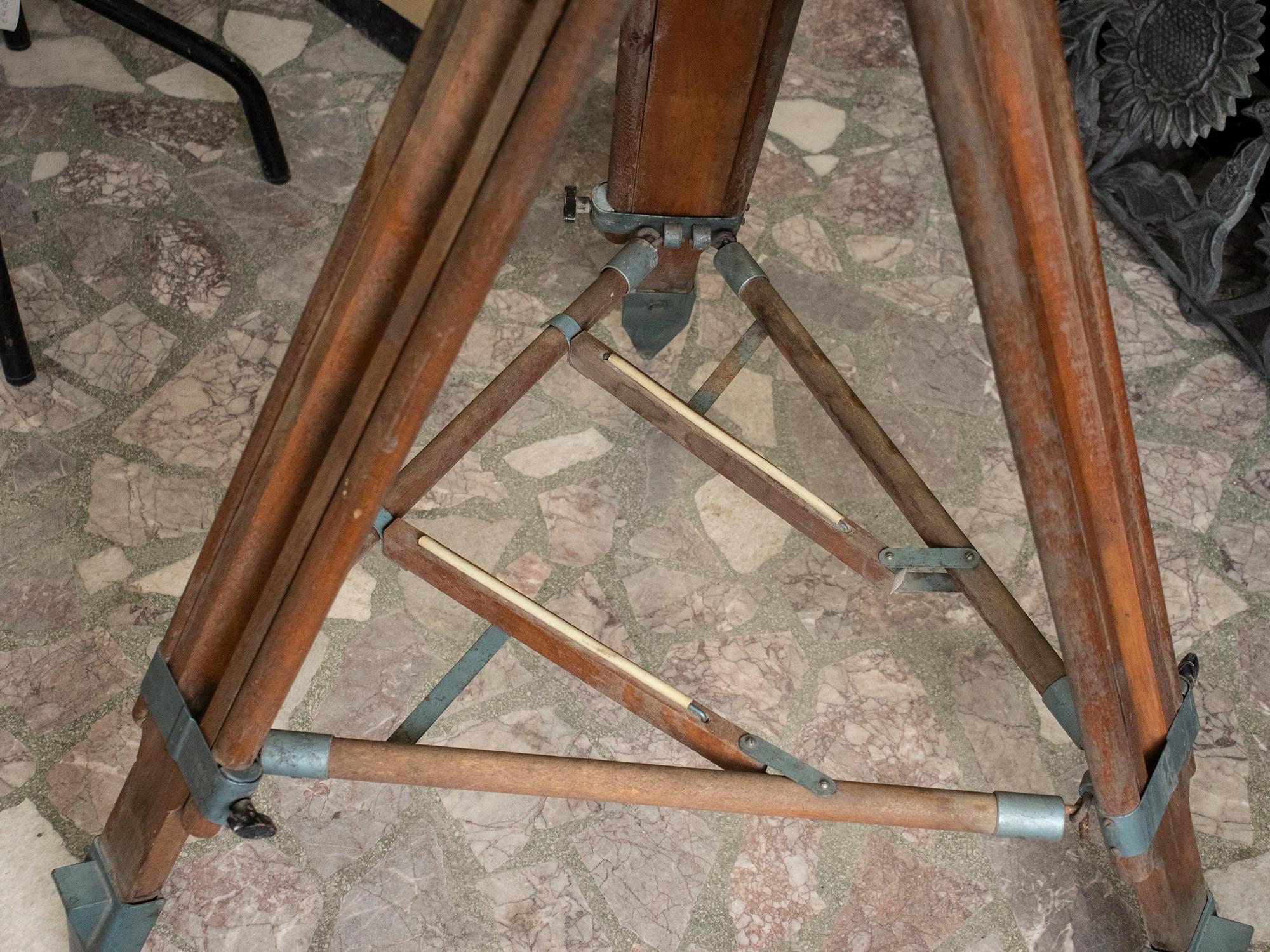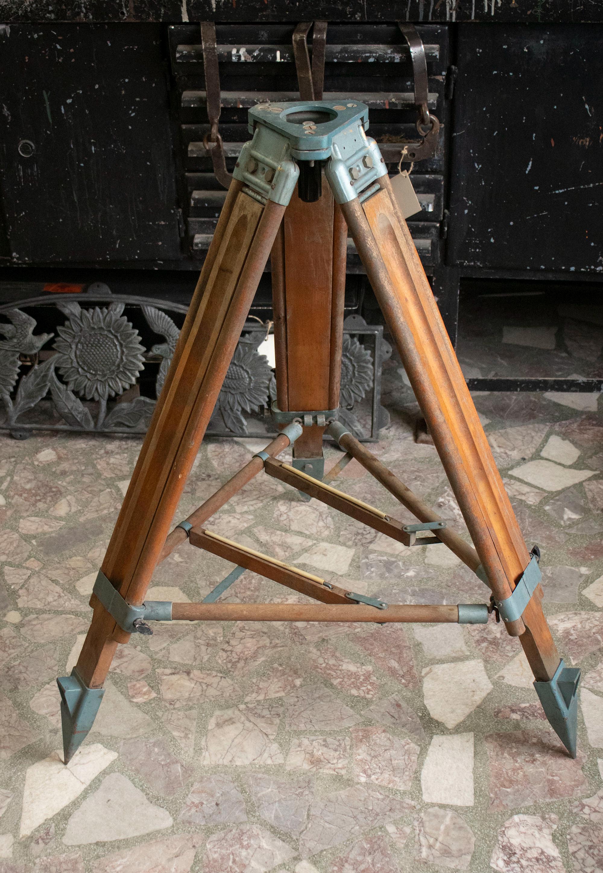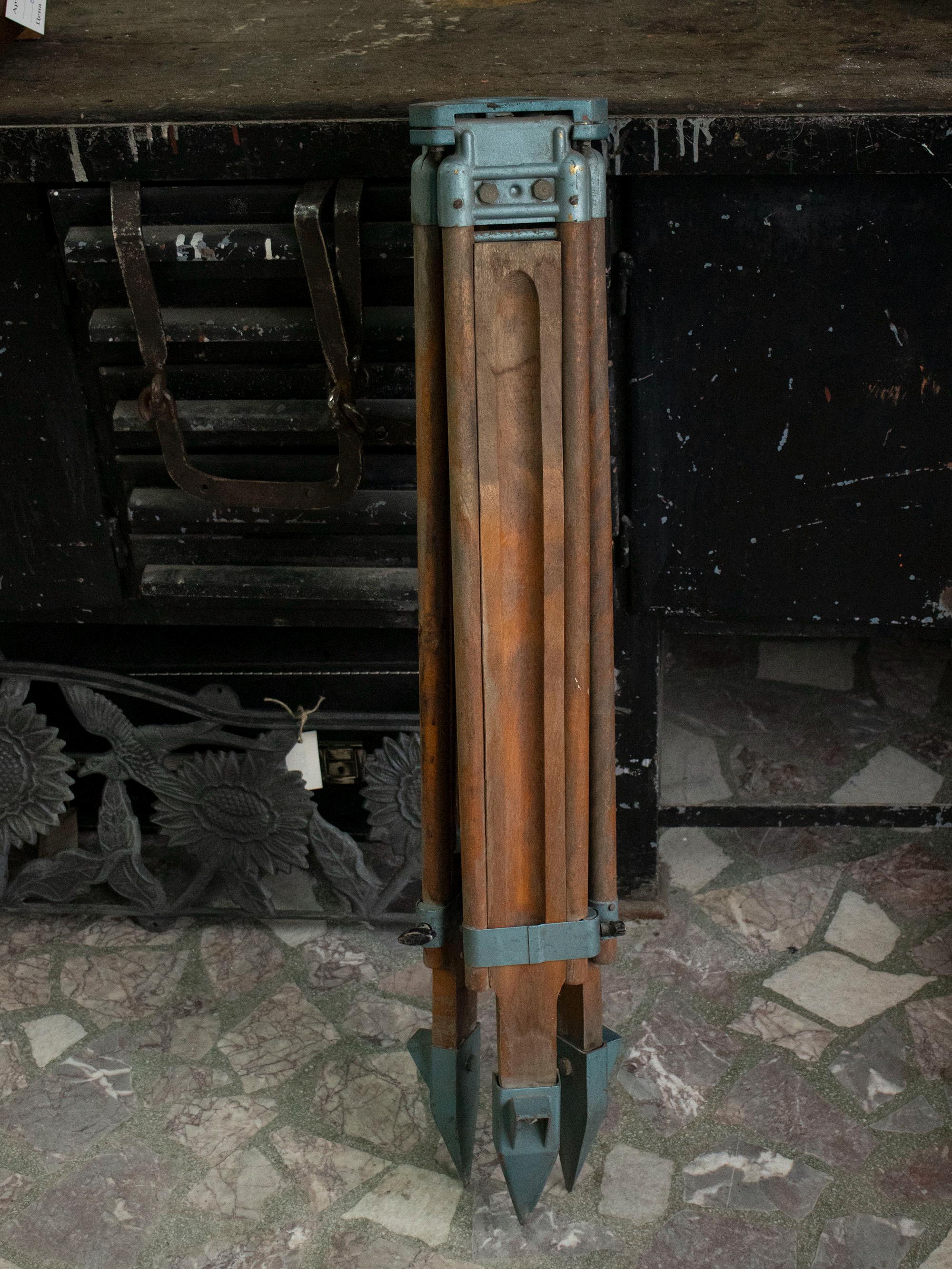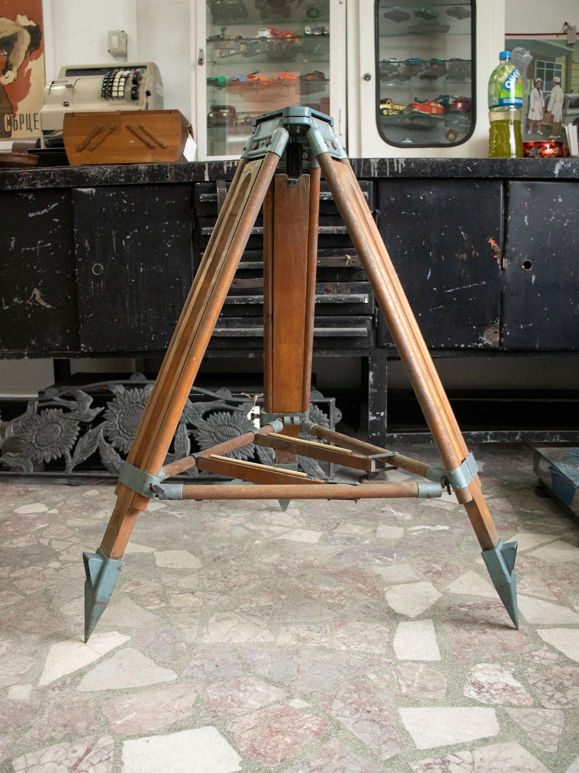 It features folding wooden legs with steel fittings and pointed ends, providing excellent stability on uneven terrain. The design allows it to fold compactly for easy storage and transport. The piece combines functionality with exceptional craftsmanship, making it ideal both as a collectible engineering relic and as a decorative stand for lamps, globes, cameras, or sculptures.