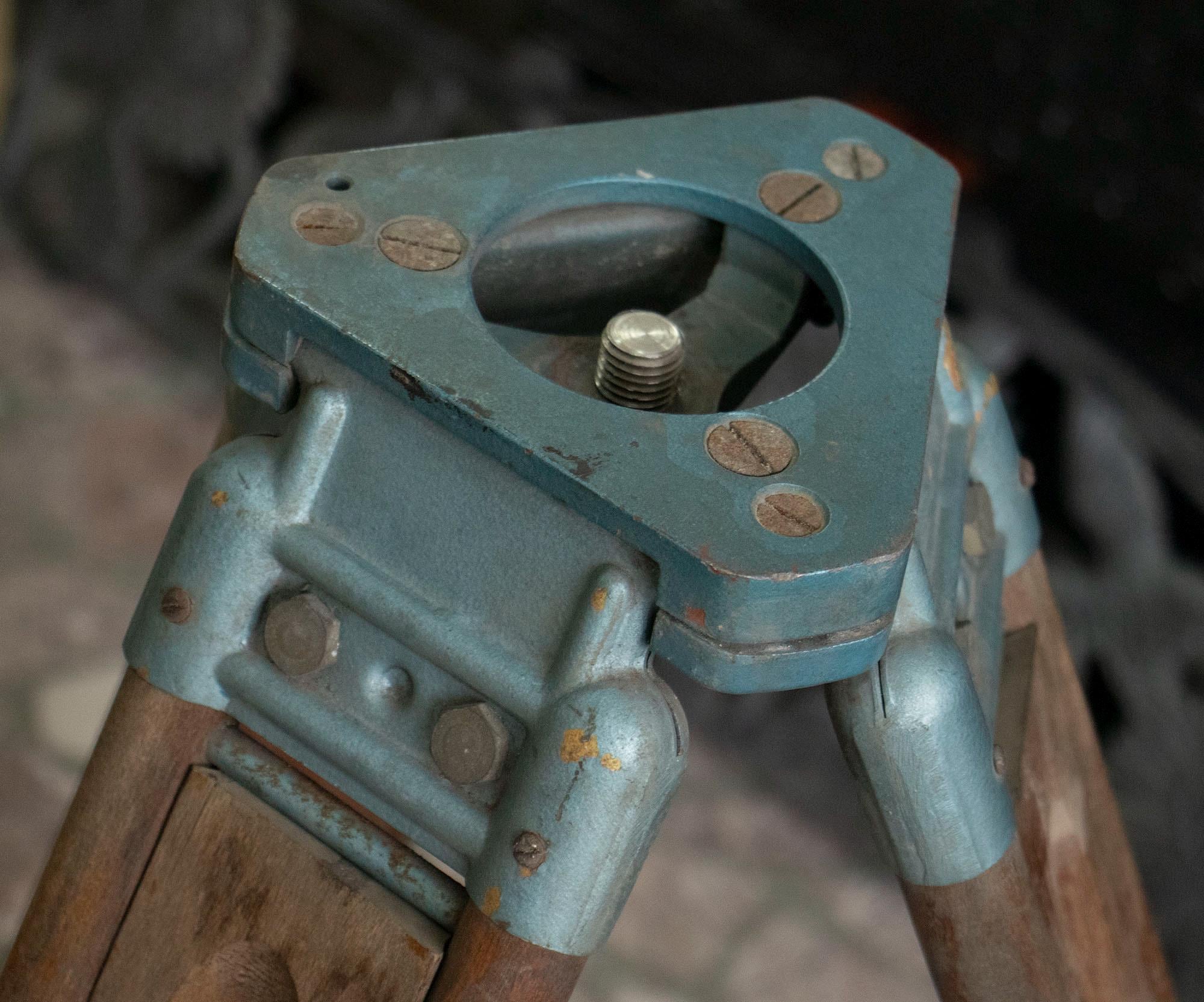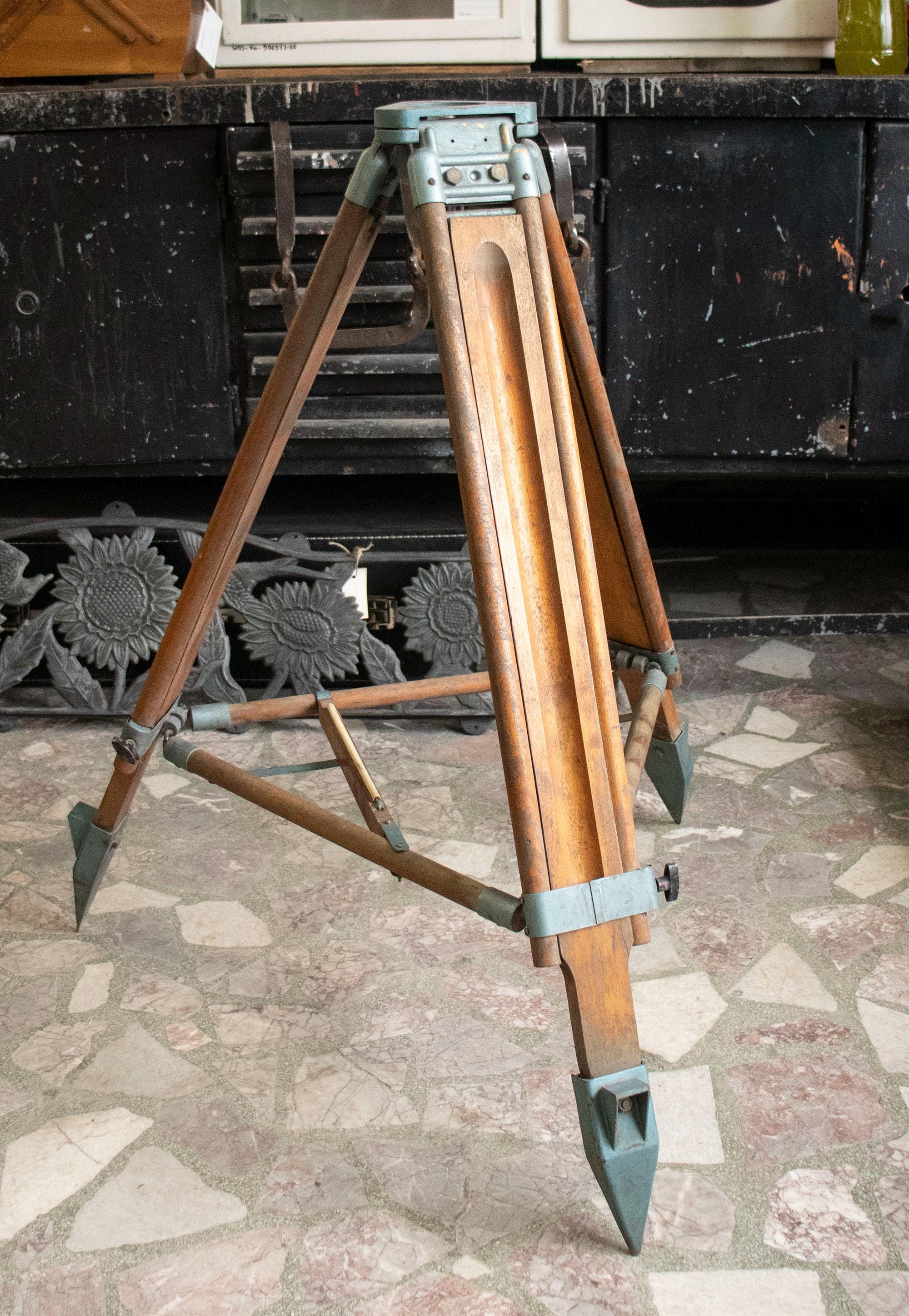 A beautifully crafted vintage surveyor’s tripod, made of solid wood and metal hardware with a stunning aged patina. This heavy-duty tripod was originally used to support surveying or optical instruments such as theodolites or levels — precision tools used by engineers, architects, and land surveyors during the mid-20th century.
