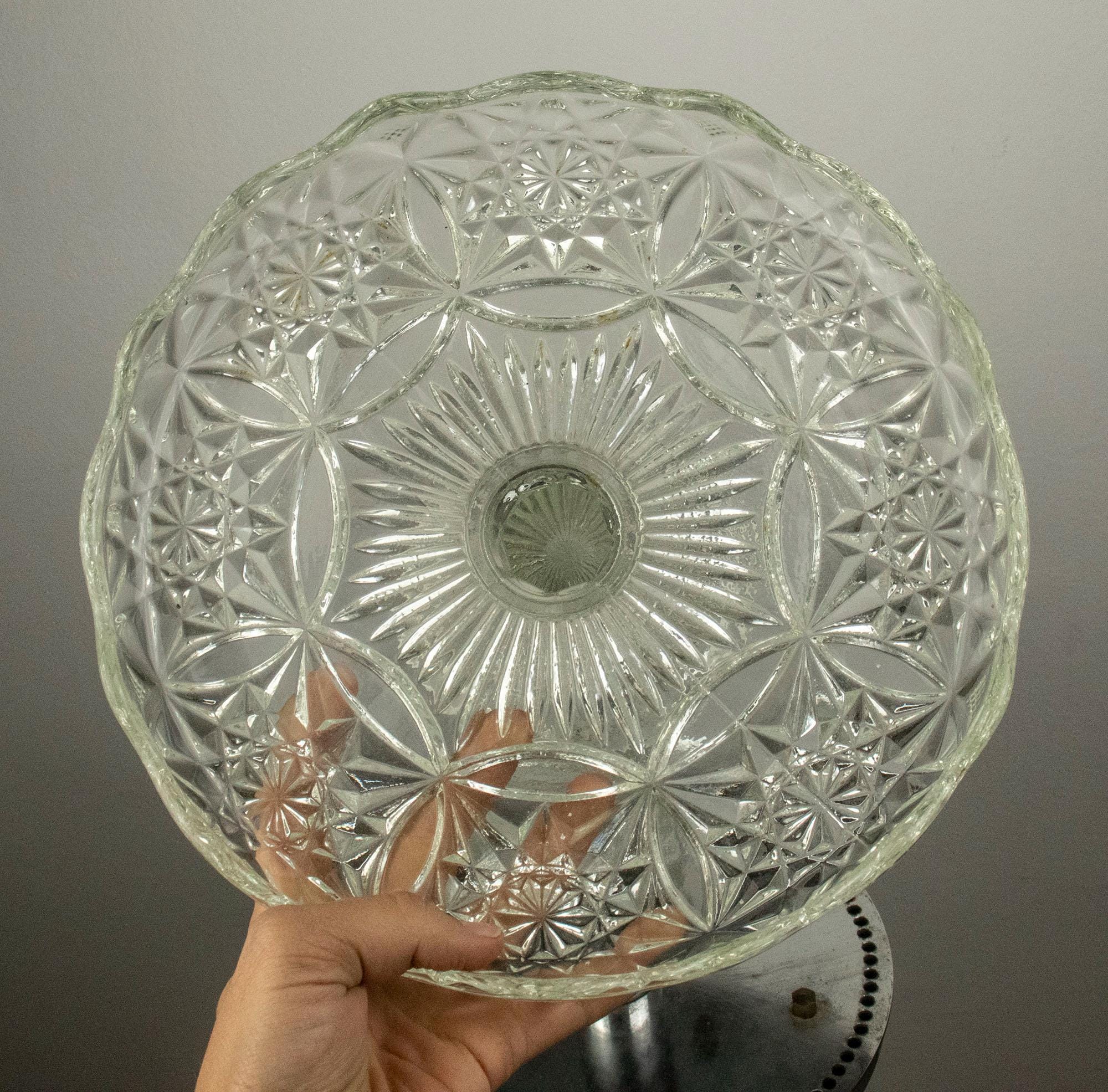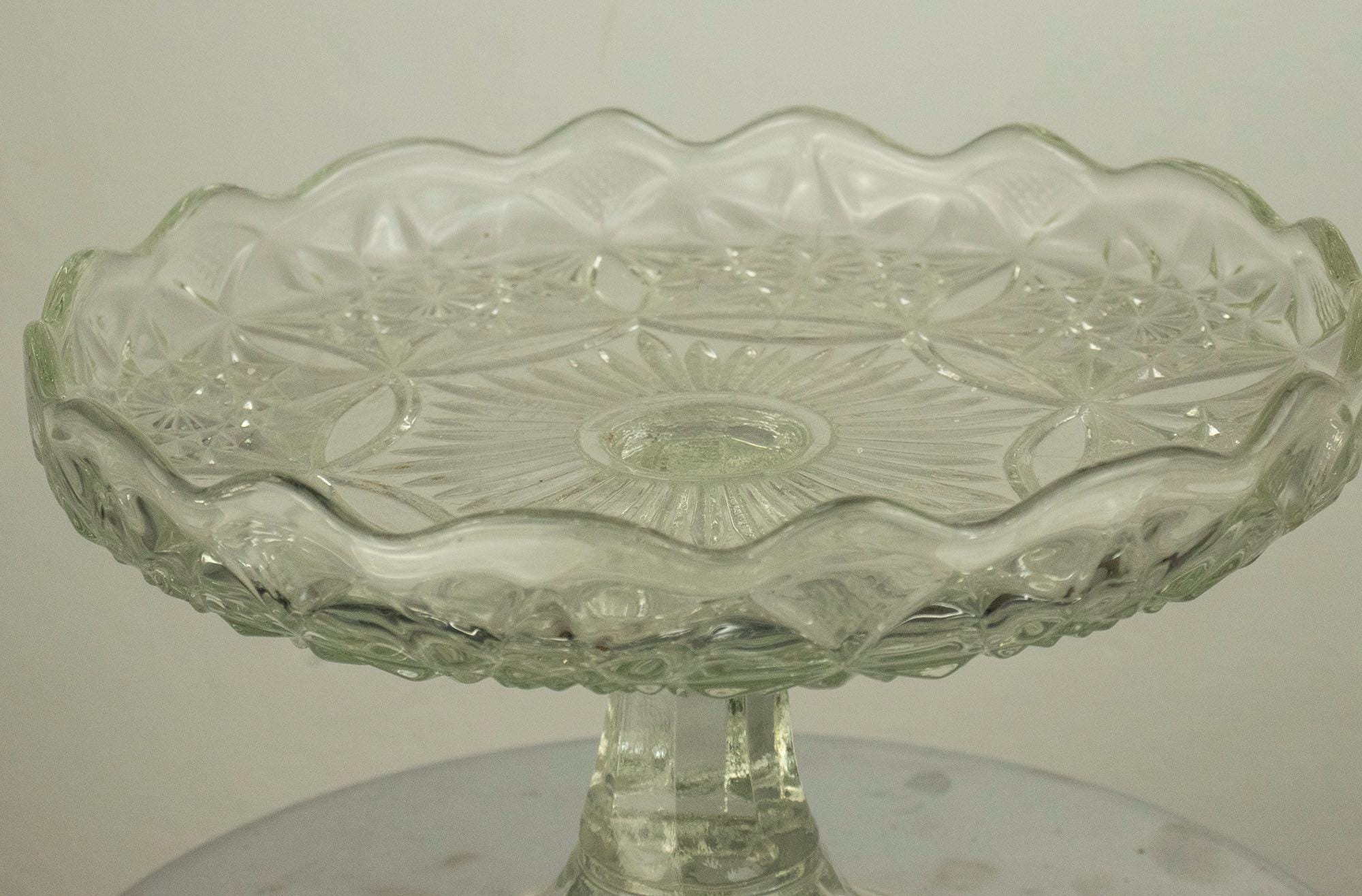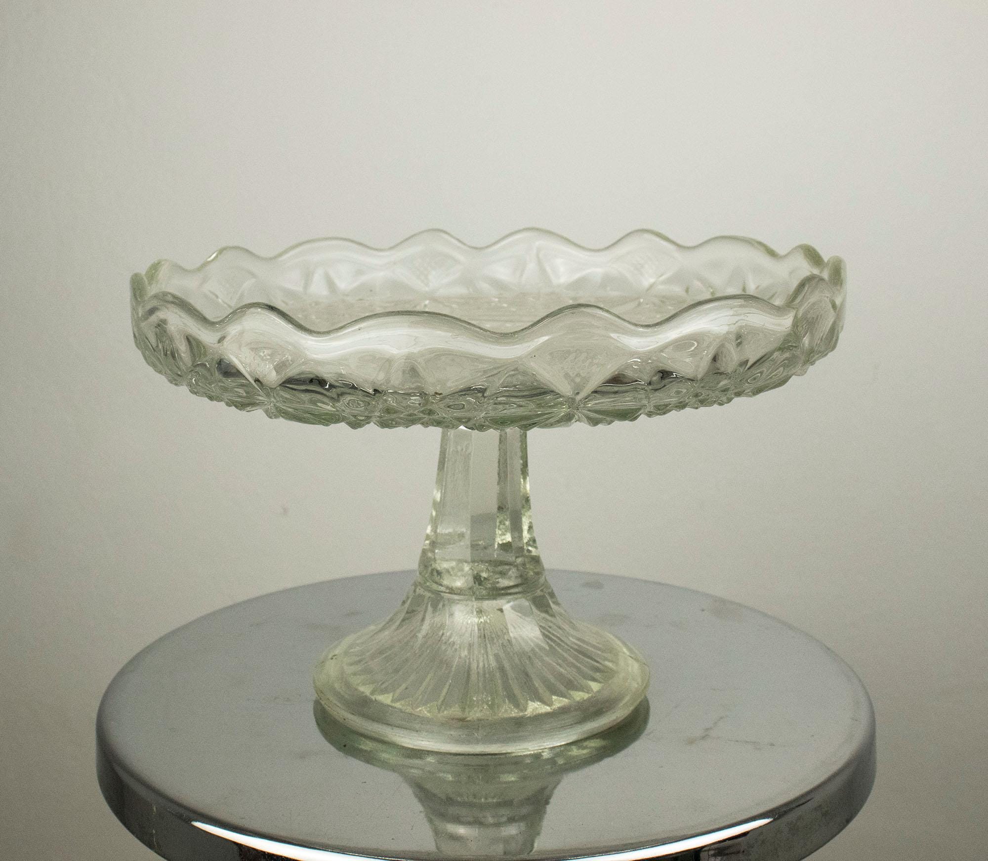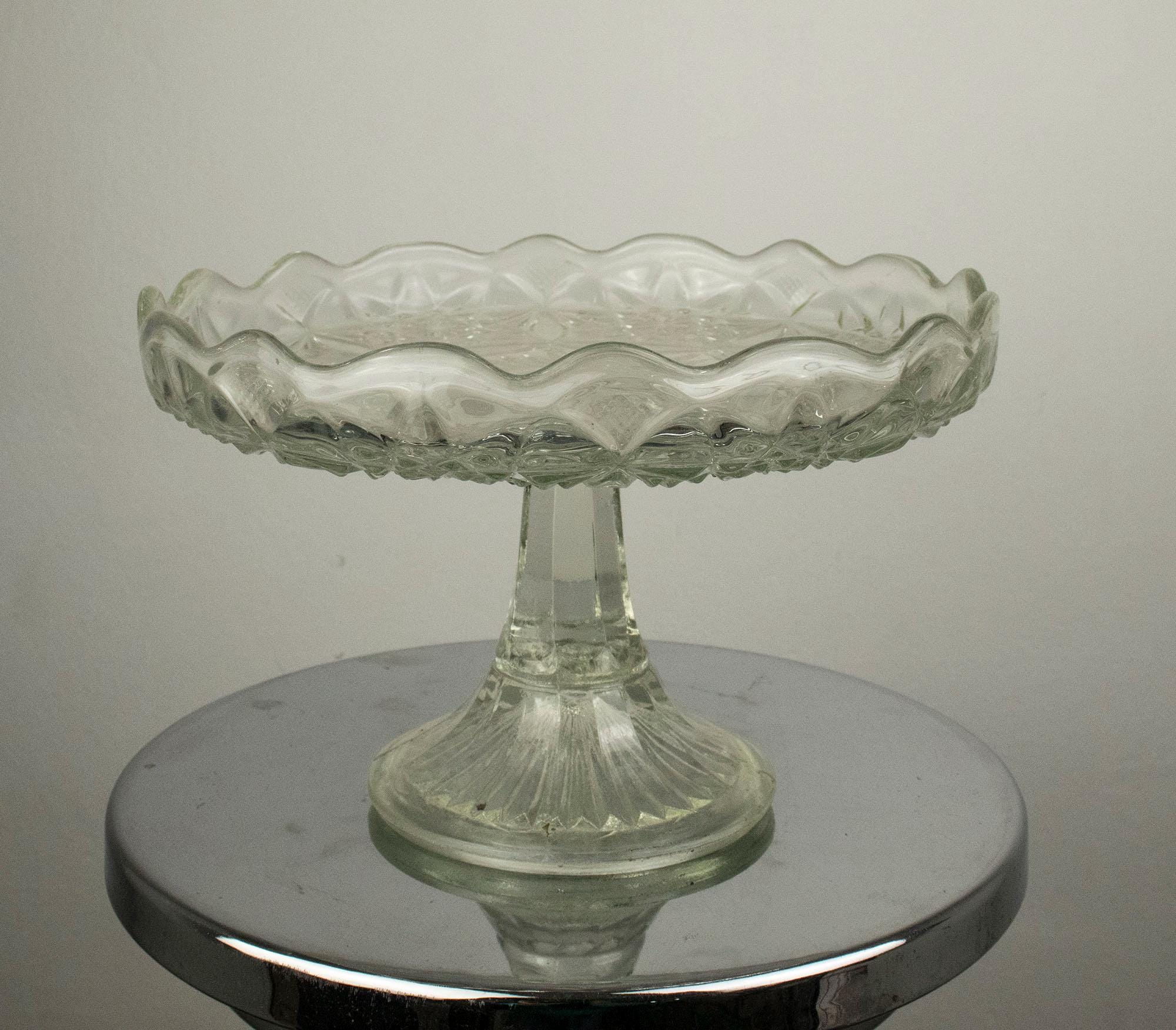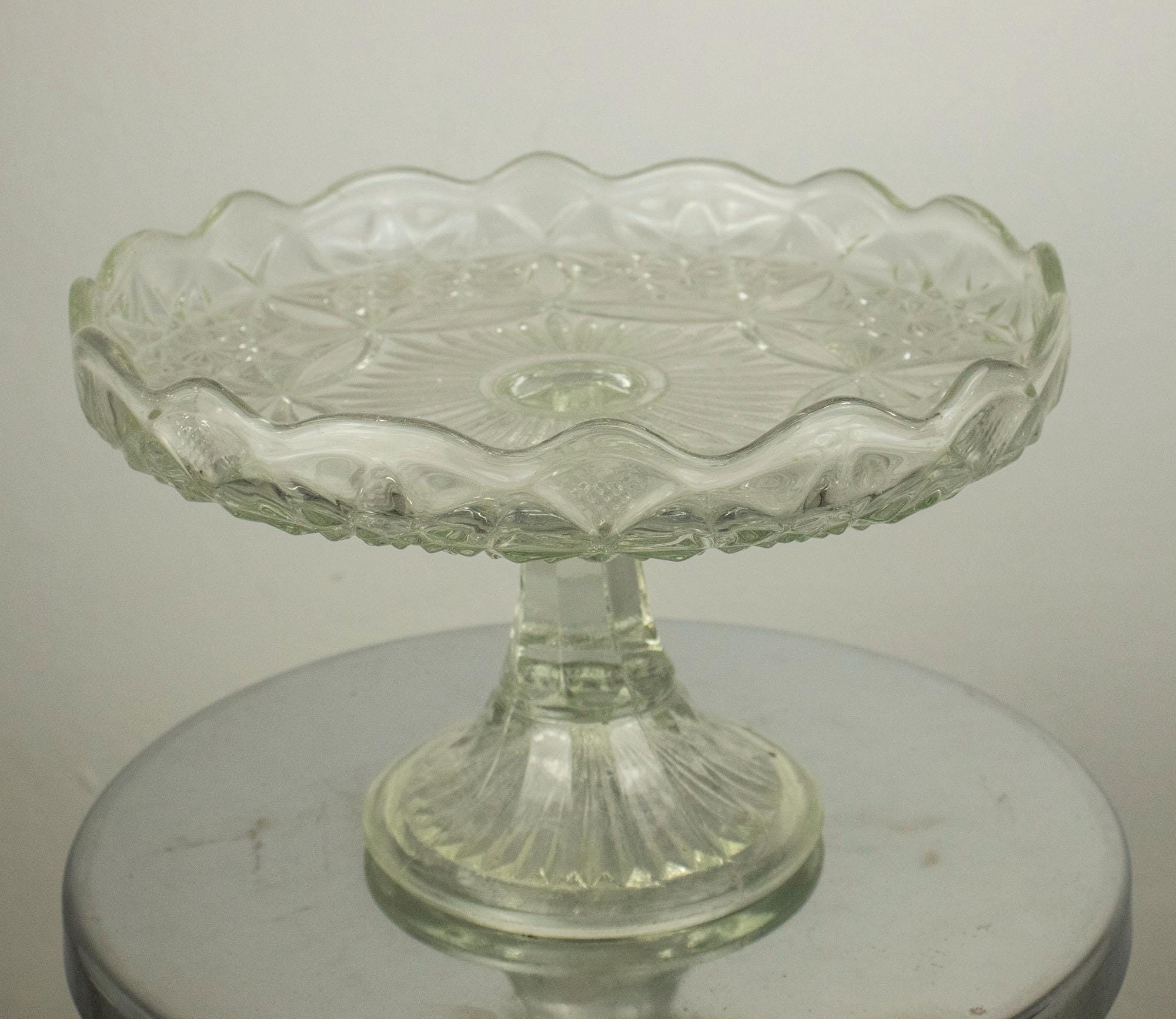 A beautiful vintage glass cake stand with a delicate pressed pattern and scalloped edge.