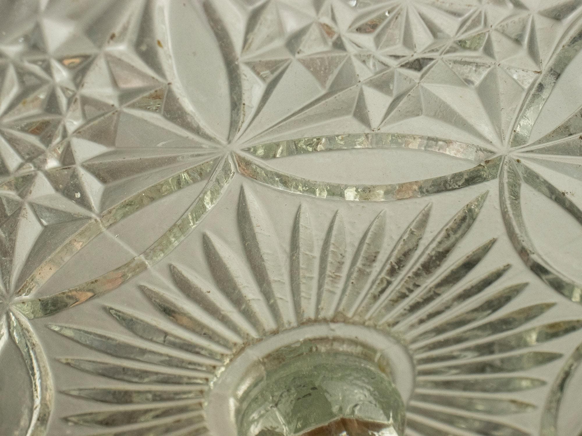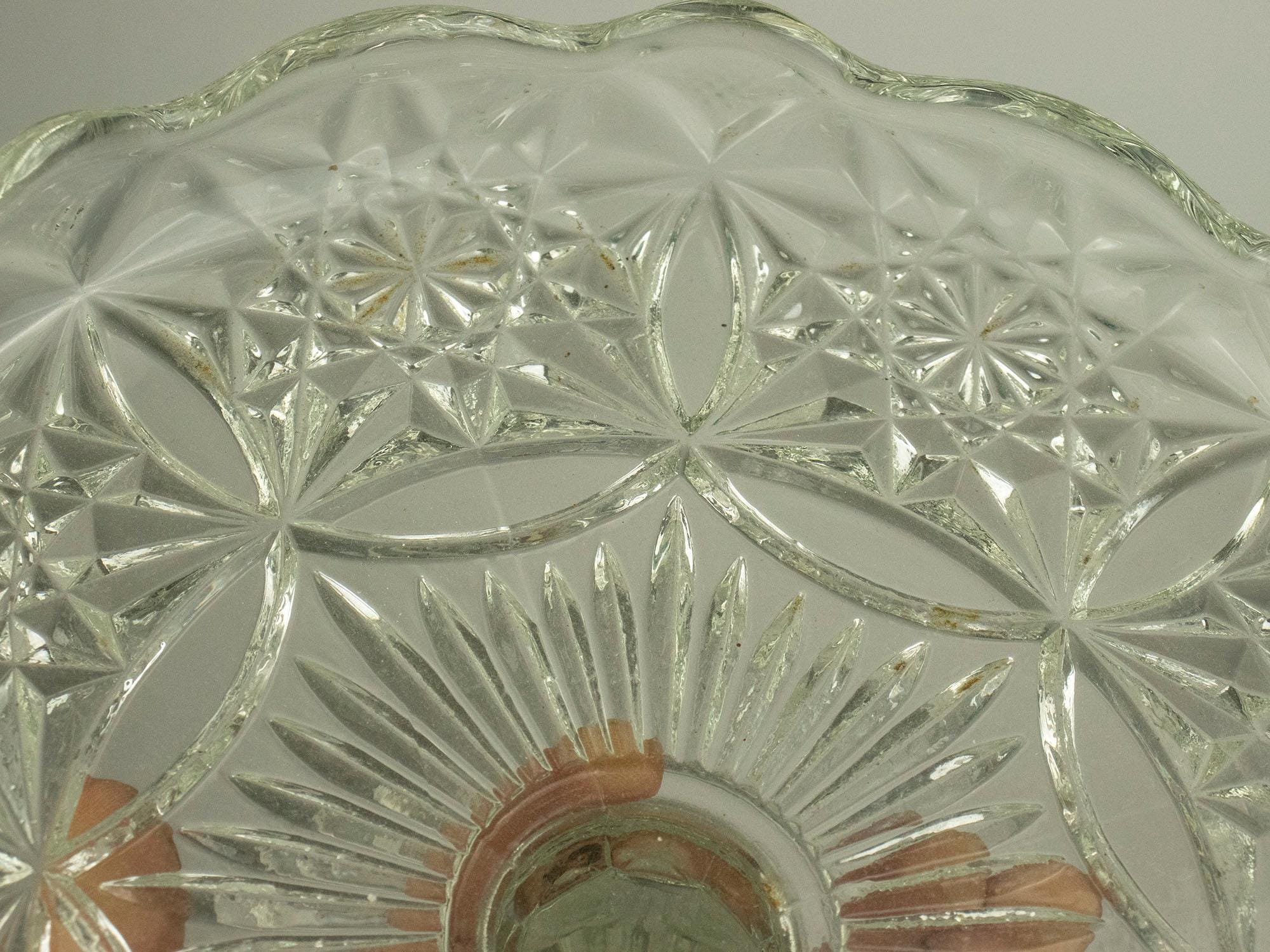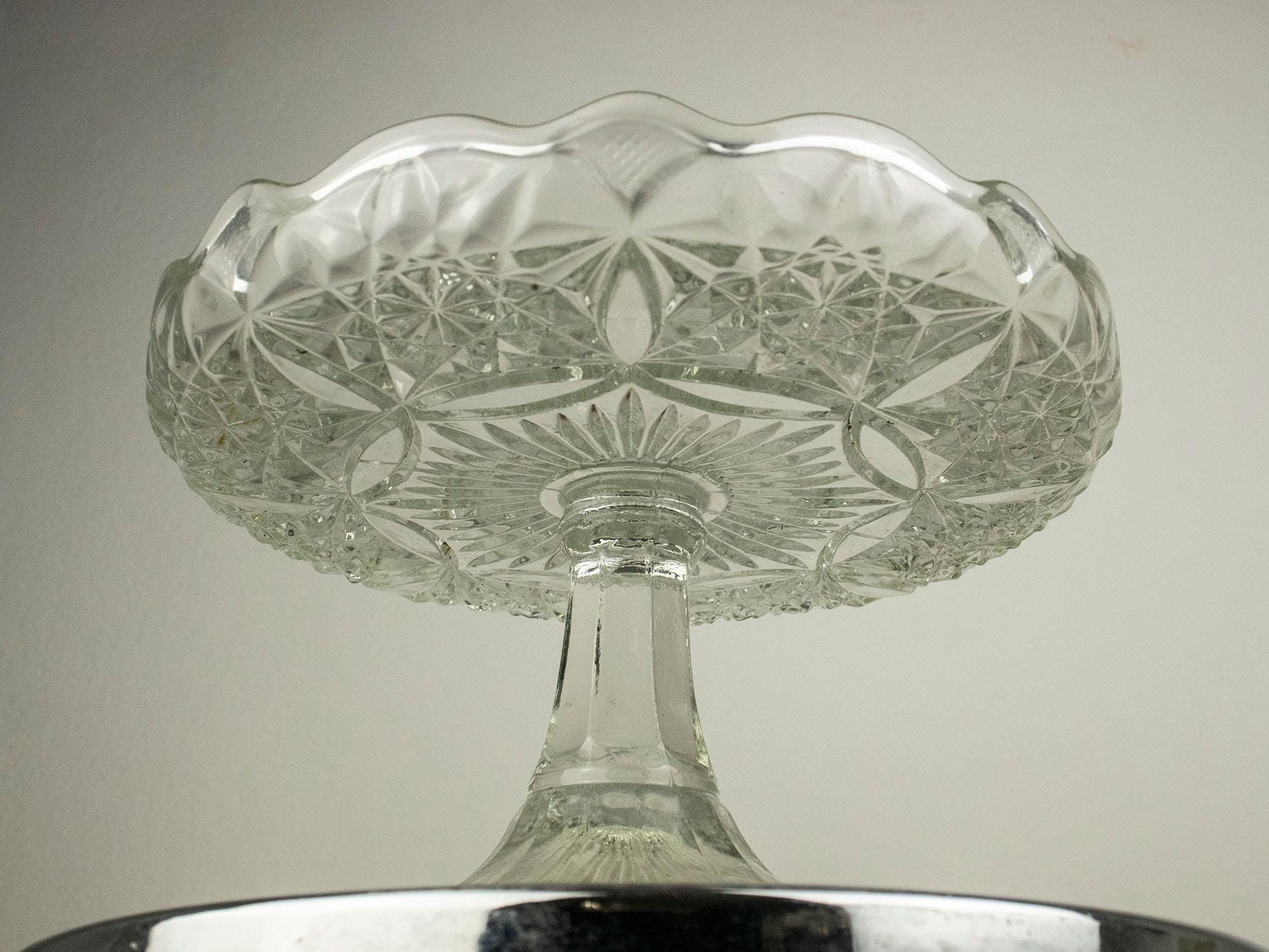 The stand is made of clear glass with a lovely geometric floral motif and a solid pedestal base. It reflects the light beautifully and adds an elegant touch to any table setting.