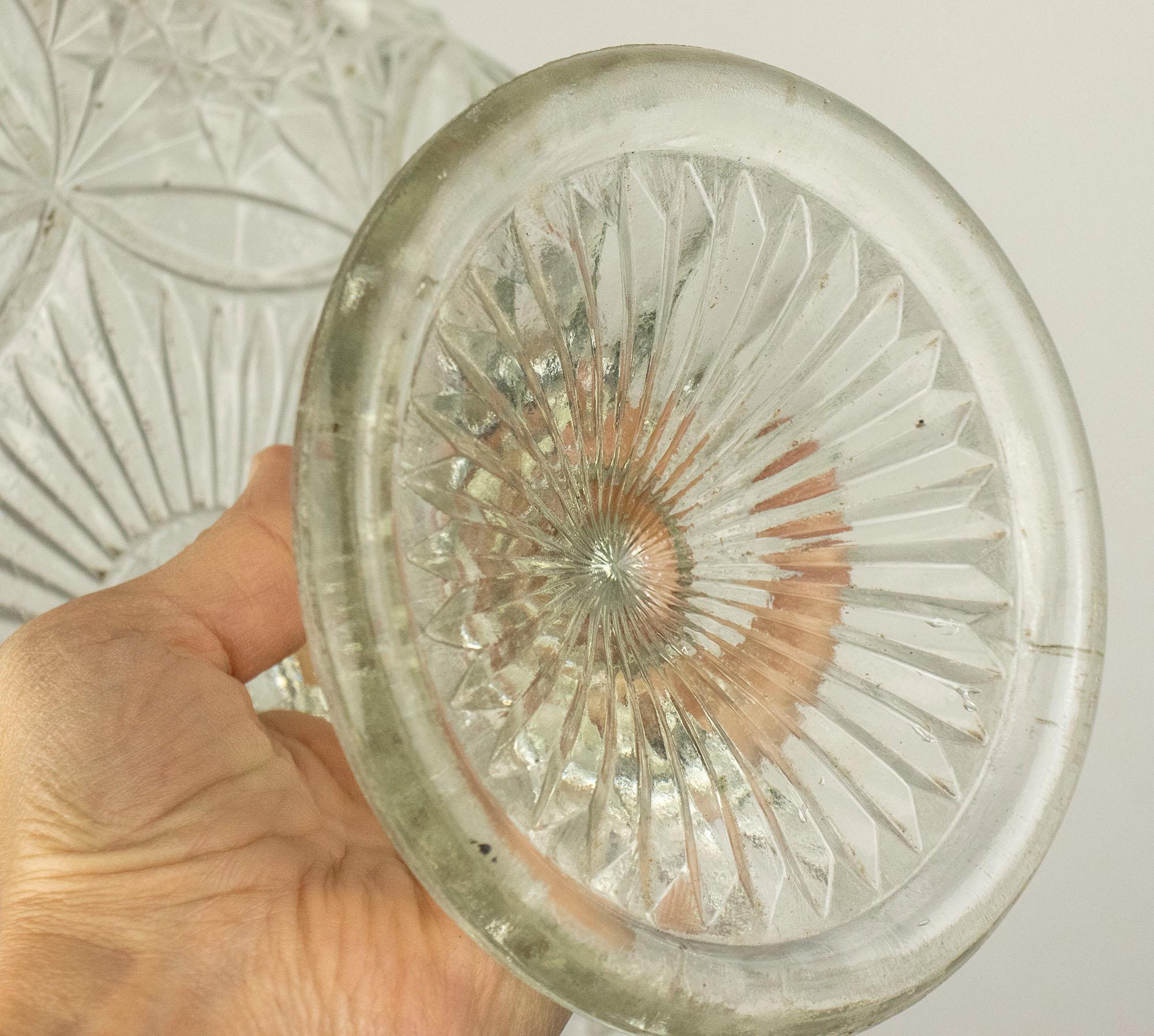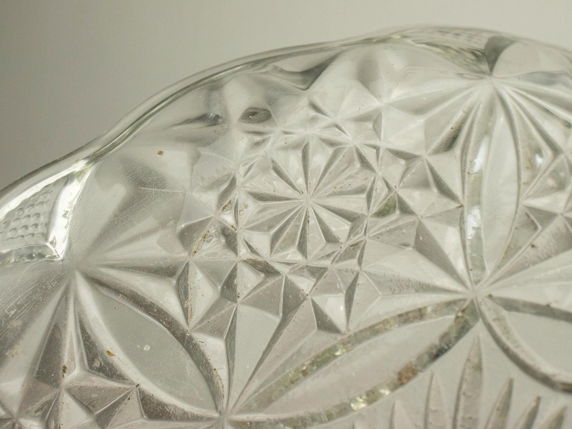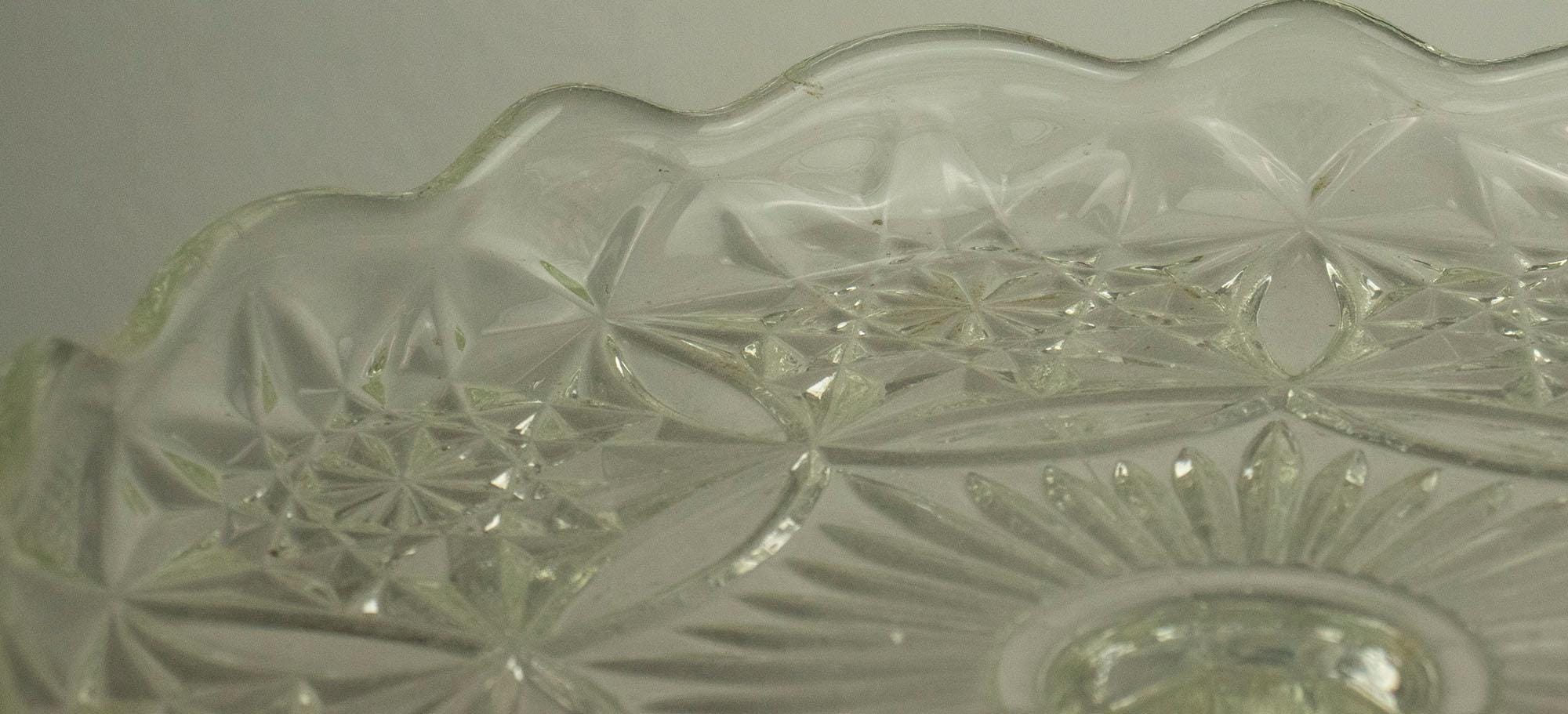 The stand is made of clear glass with a lovely geometric floral motif and a solid pedestal base. It reflects the light beautifully and adds an elegant touch to any table setting.