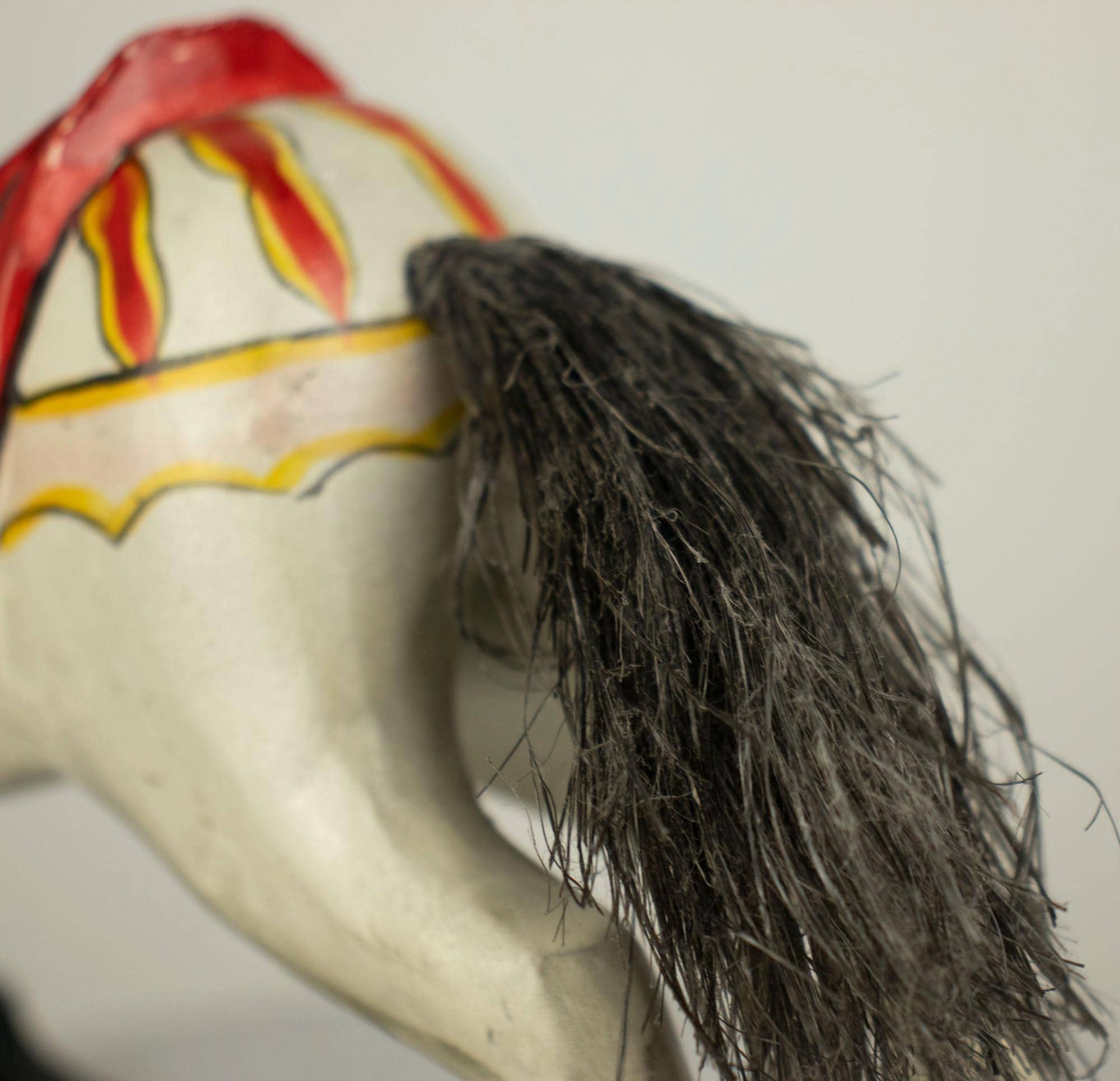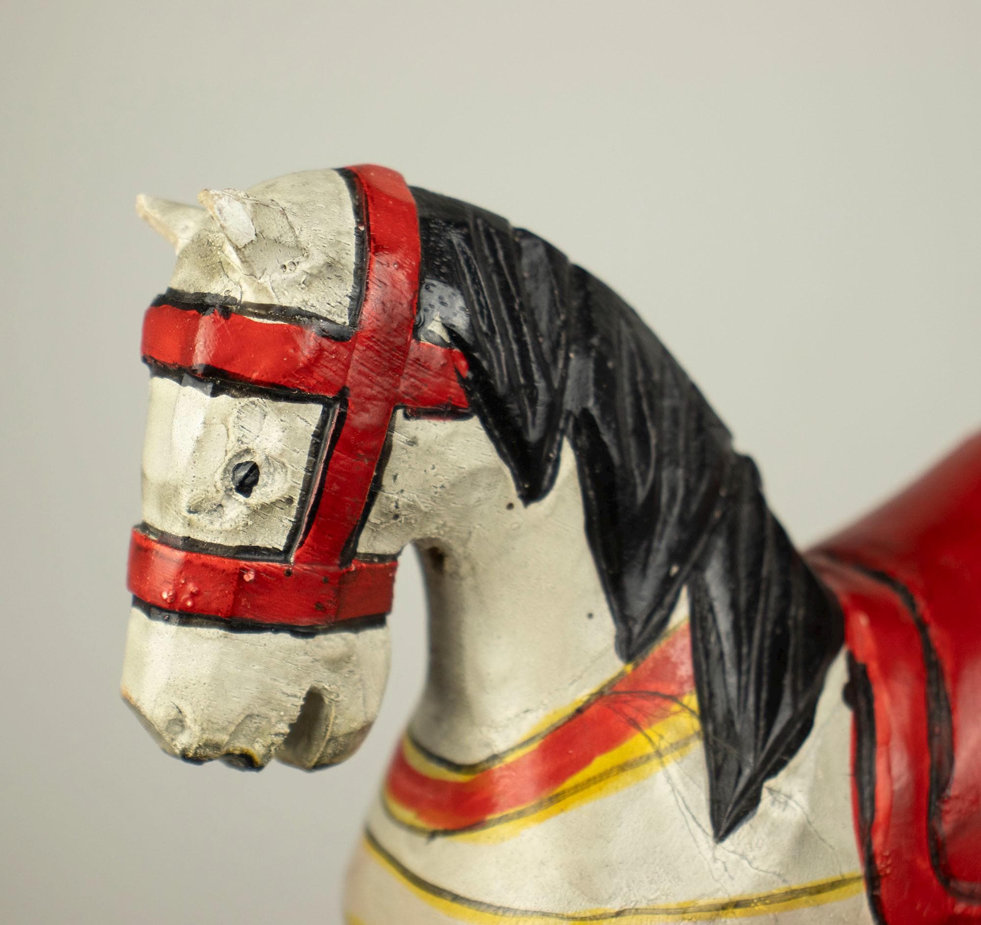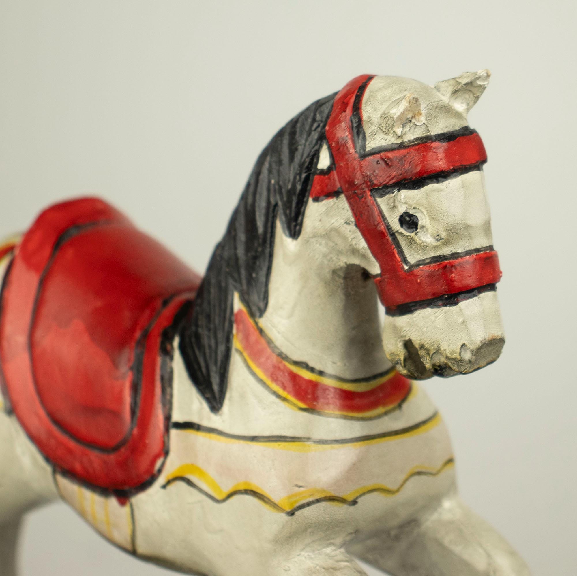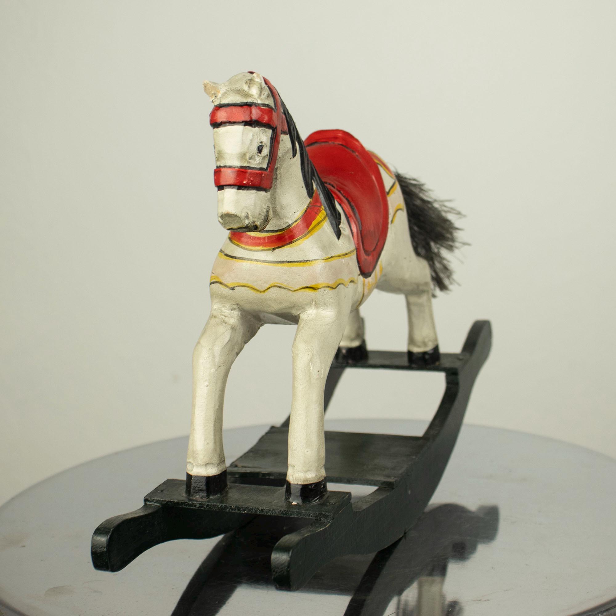 The horse features a white body, a red saddle, black mane and tail, and delicate hand-painted yellow details. Its folk-art character and handcrafted finish give it a warm nostalgic presence.