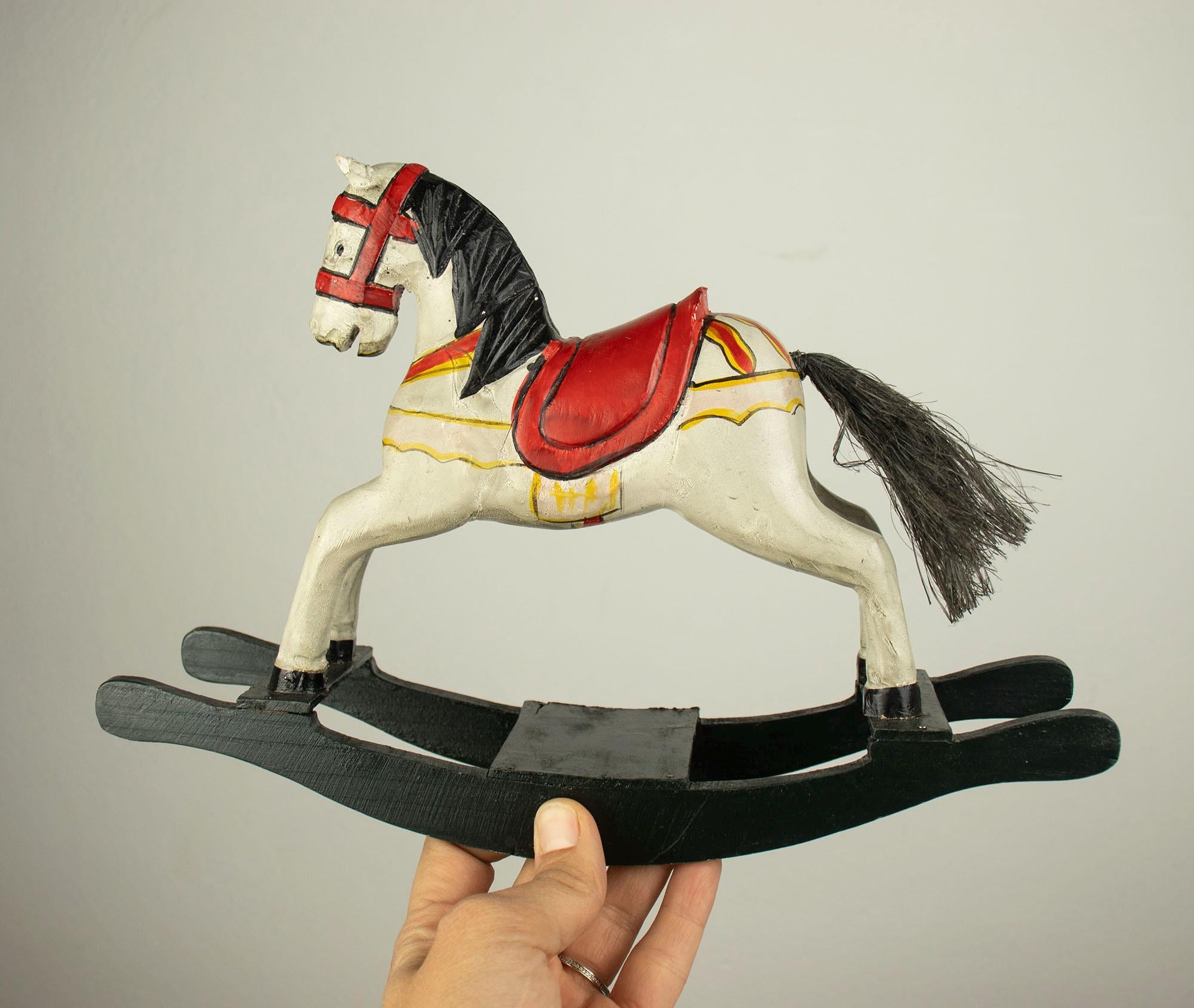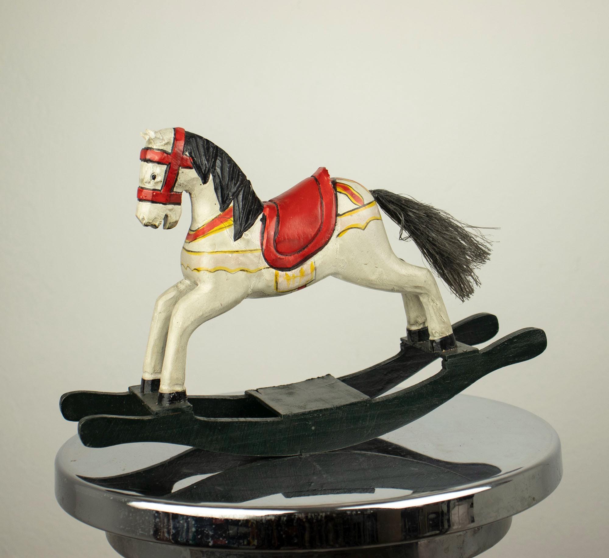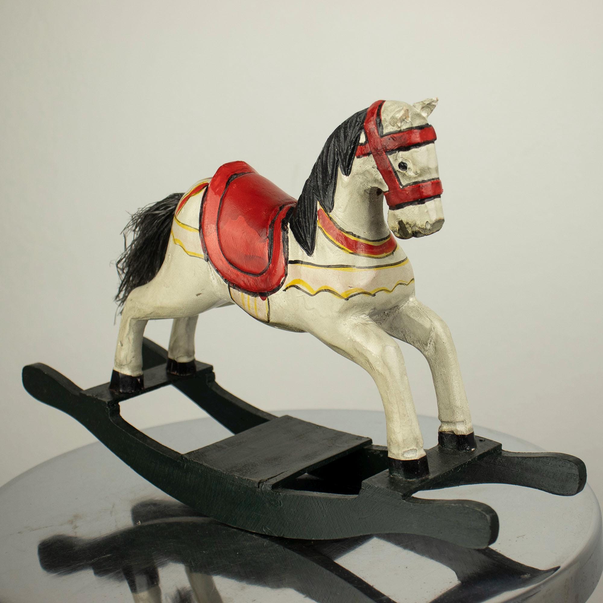 A charming vintage wooden rocking horse toy, hand-carved and painted in beautiful traditional colors.