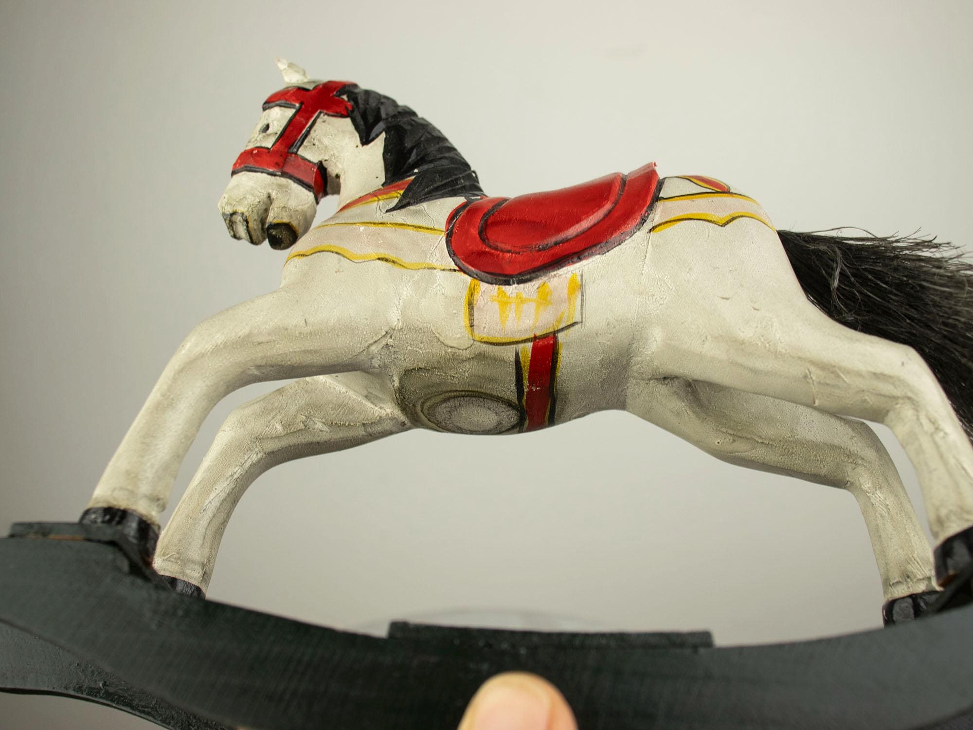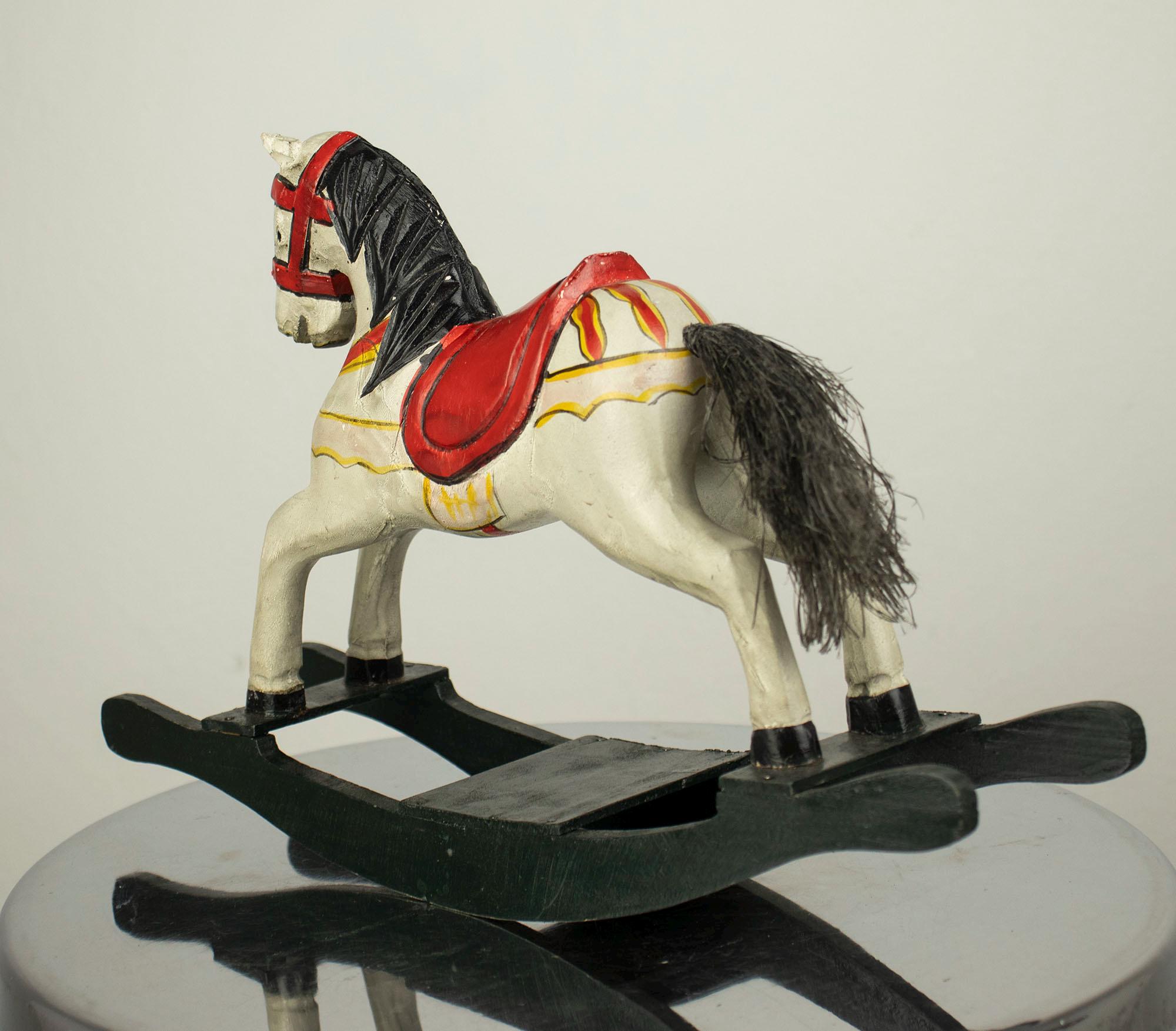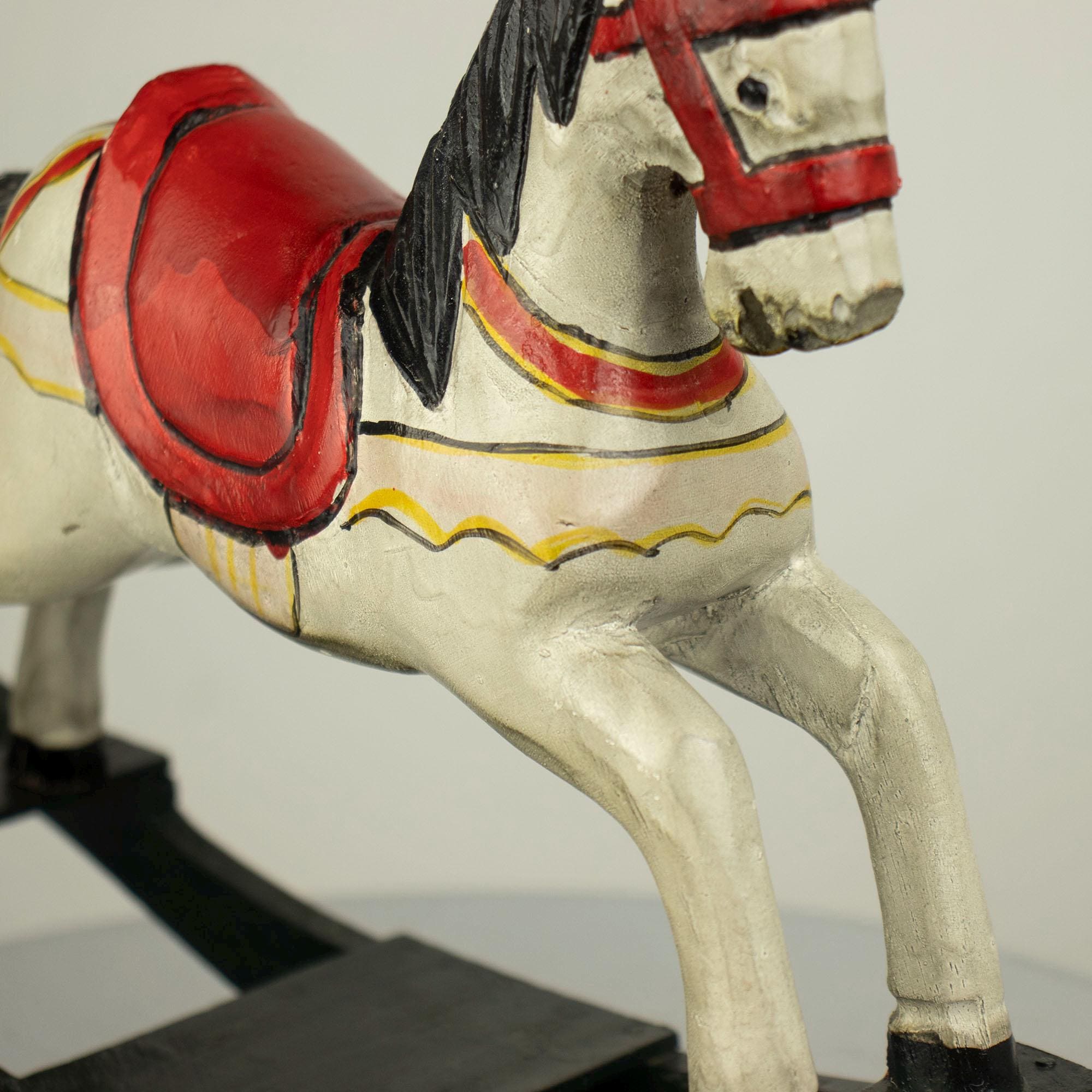 A charming vintage wooden rocking horse toy, hand-carved and painted in beautiful traditional colors.