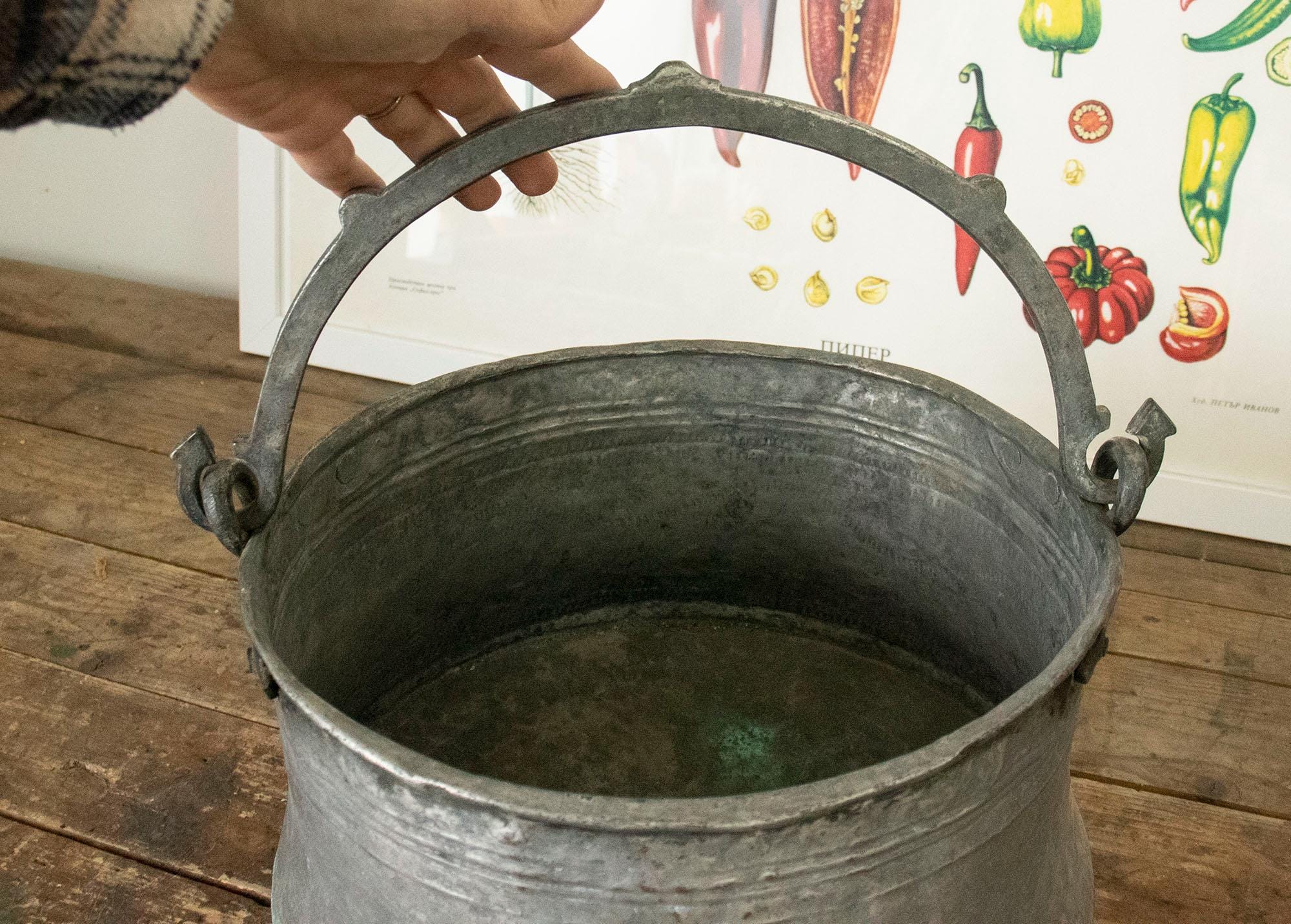 A beautiful vintage Bulgarian cooking pot, traditionally used for open-fire cooking, carrying water, or preparing stews.