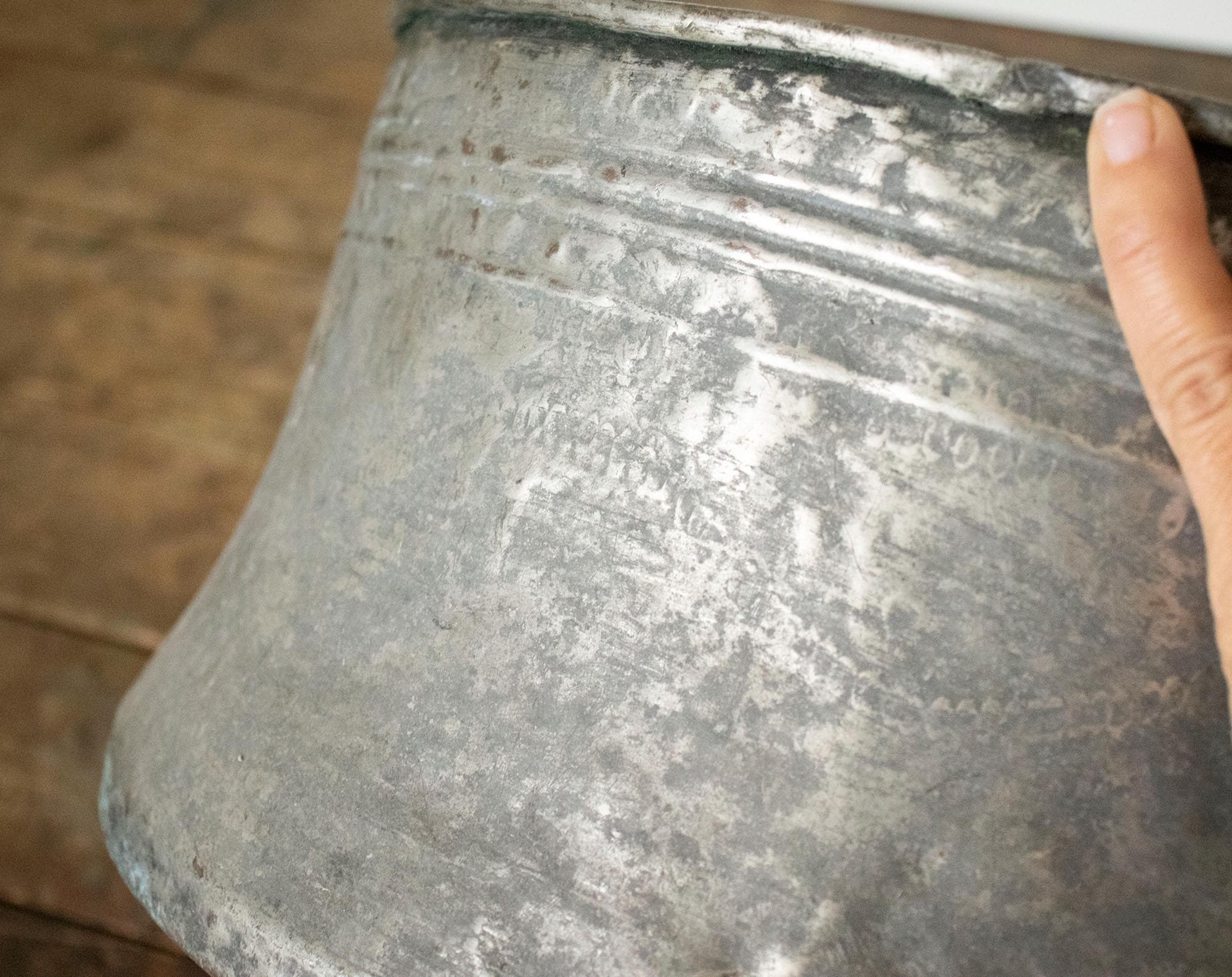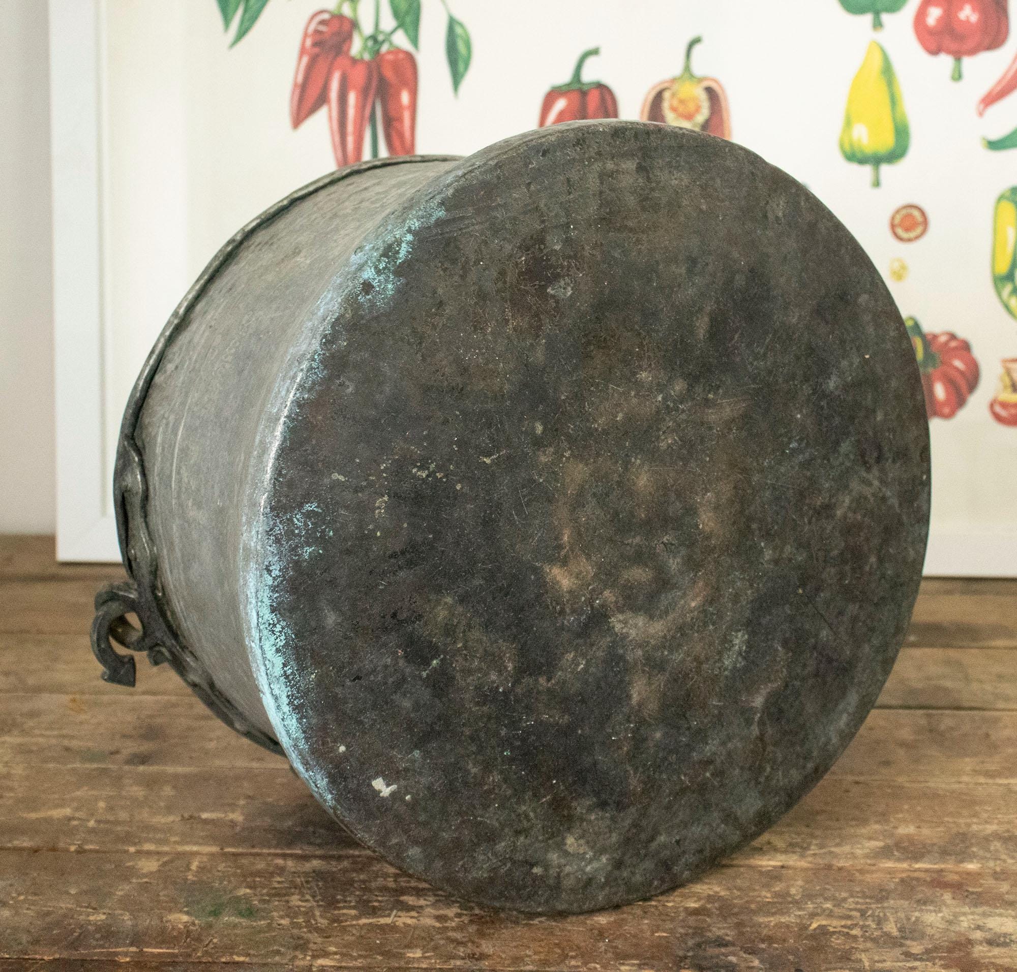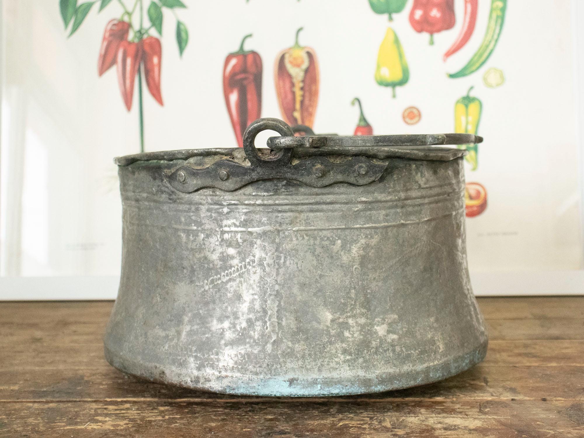 This authentic vessel was handmade from copper and later tinned, a common technique that made it both durable and safe for cooking. Over the years, it has developed a gorgeous aged patina with visible hammer marks and traces of everyday use.