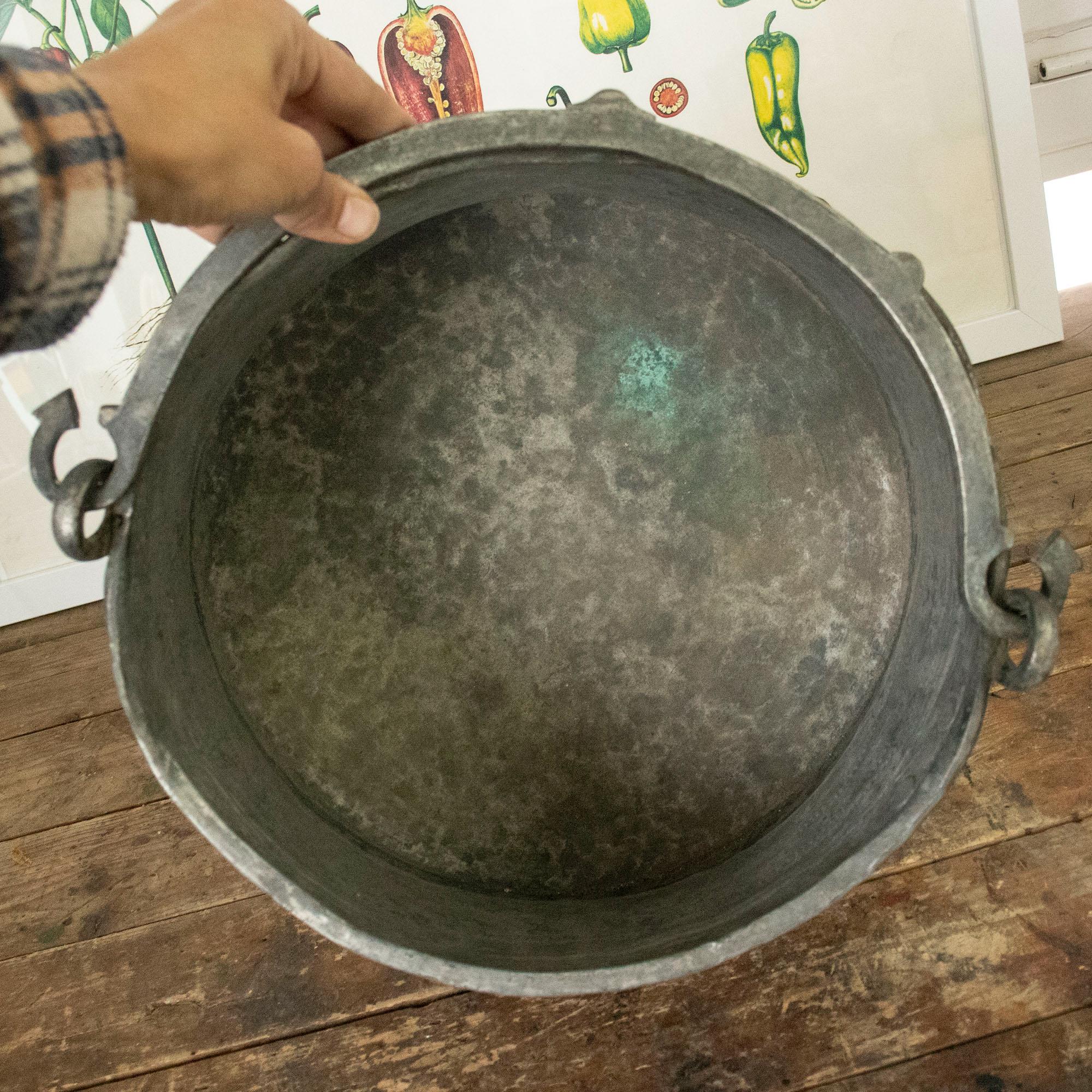 The pot features a wide flared body, a solid iron handle with ornate detailing, and a sturdy rim with riveted joints. Its shape and craftsmanship are typical of 19th–early 20th-century Balkan household cookware — functional, rustic, and built to last.
