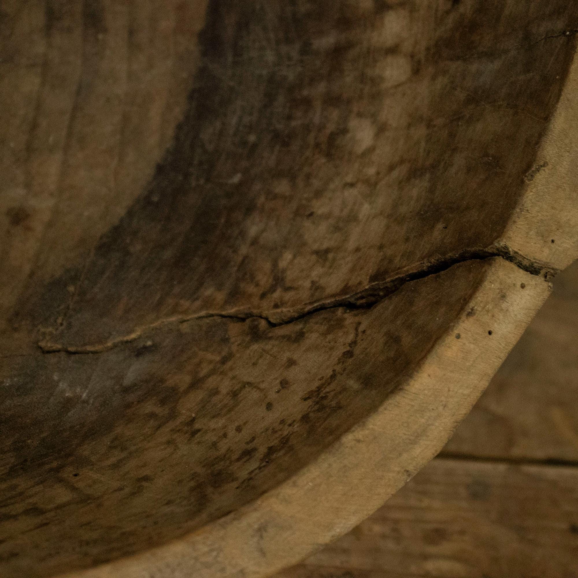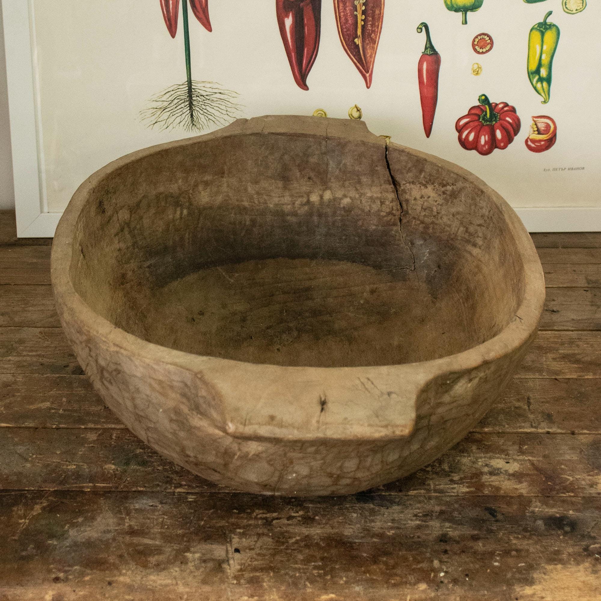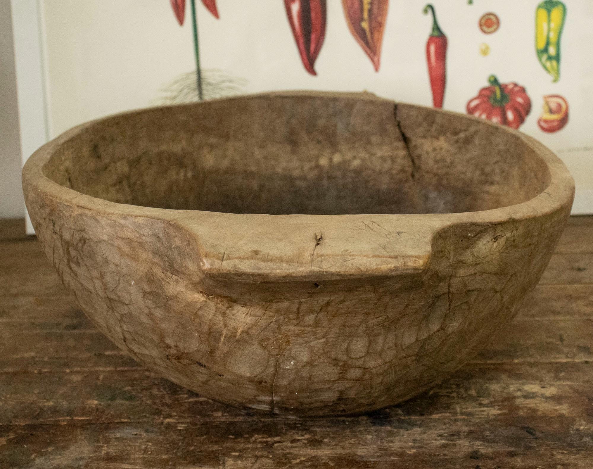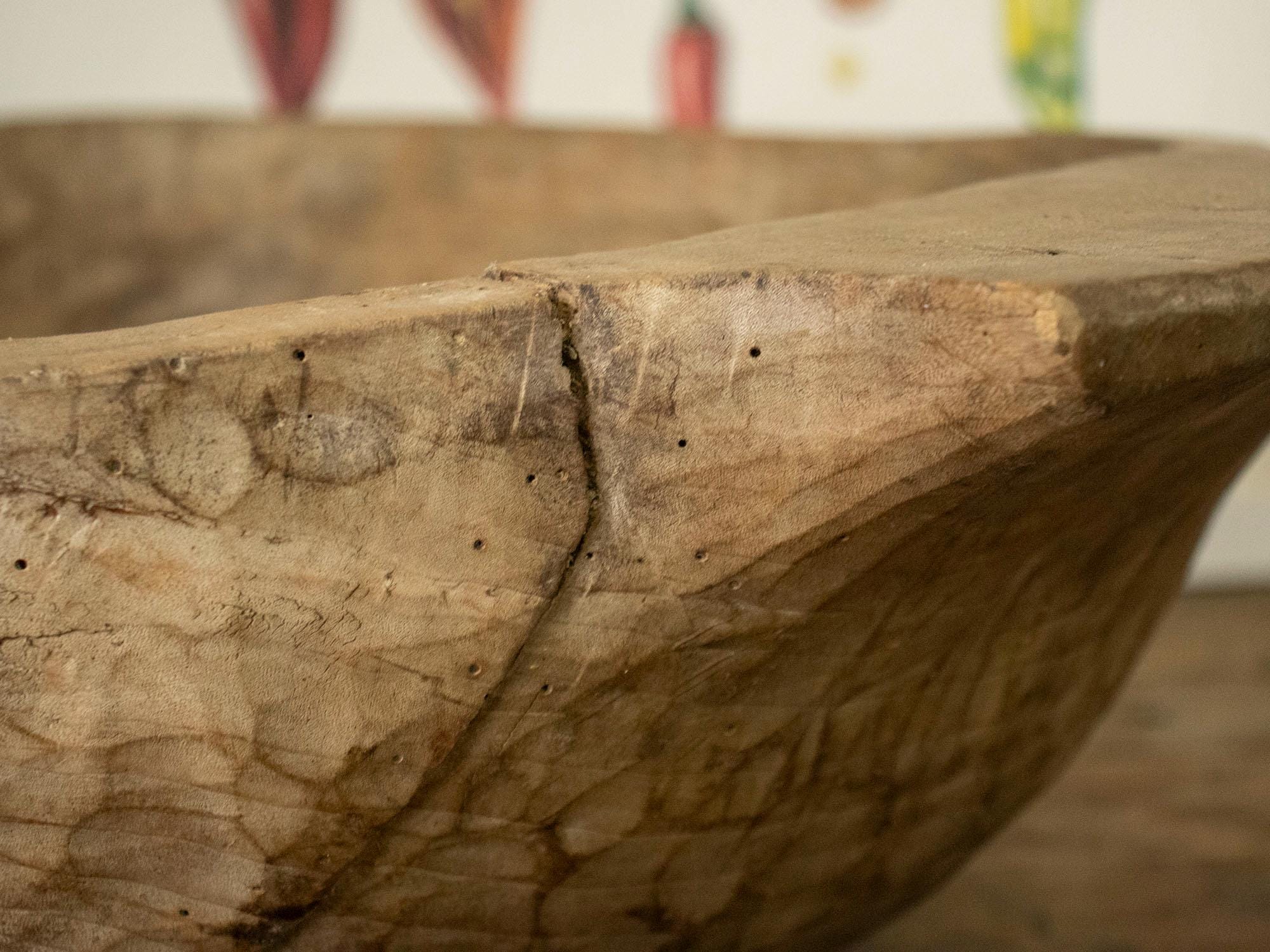 The bowl has a rich patina and visible tool marks that tell its story. It shows a natural crack and a few old woodworm holes (treated), adding to its authentic, timeworn charm.