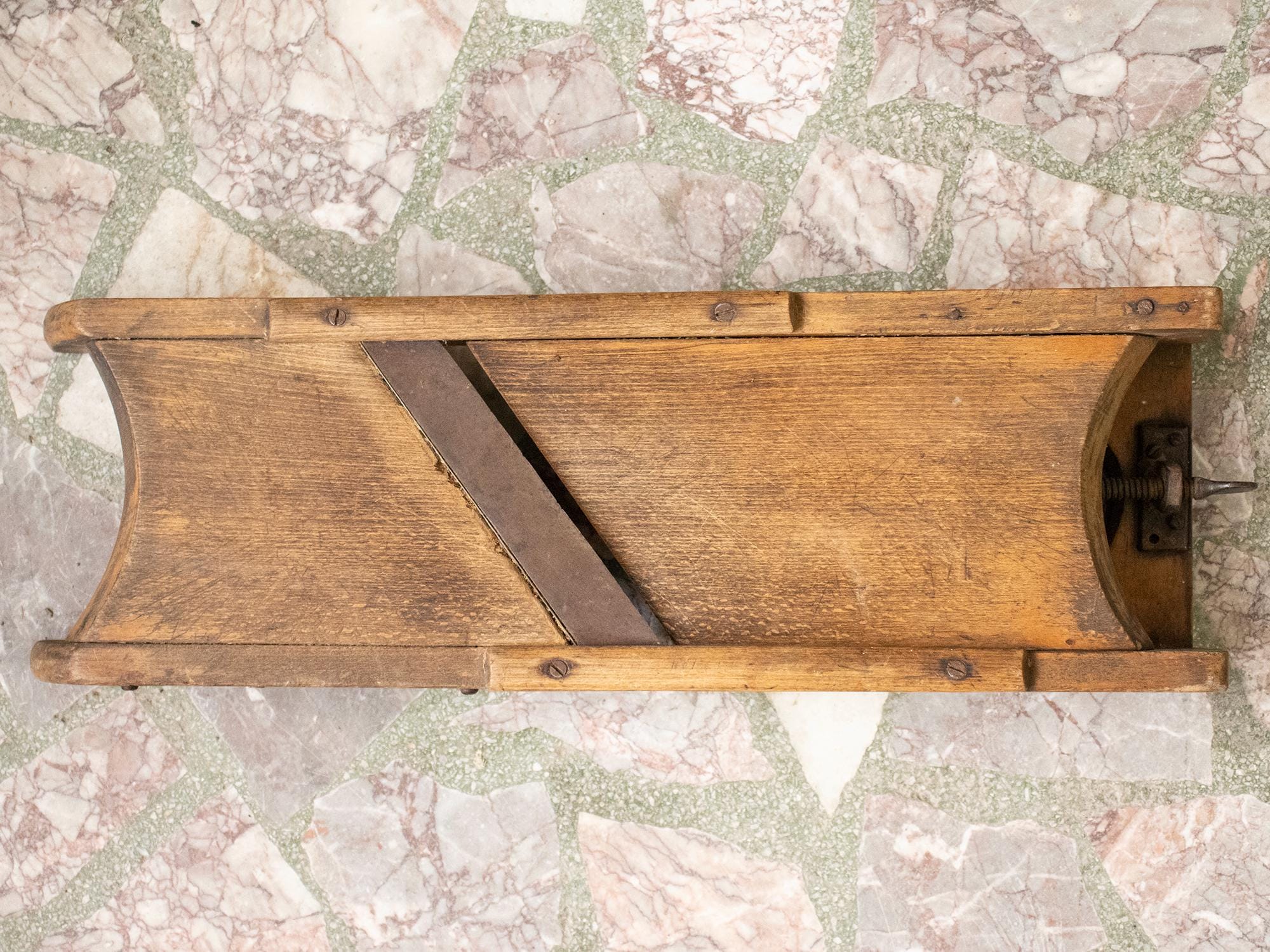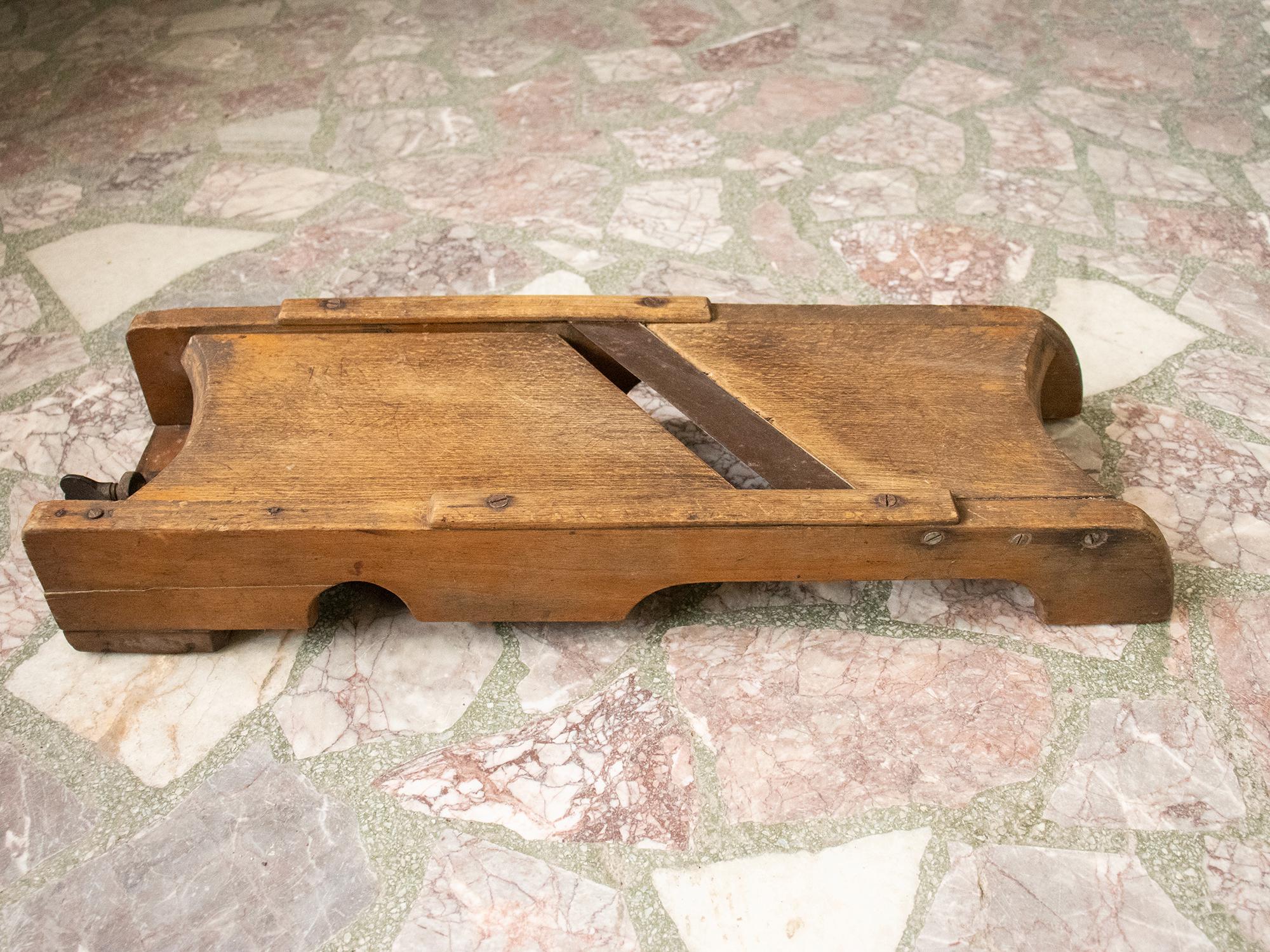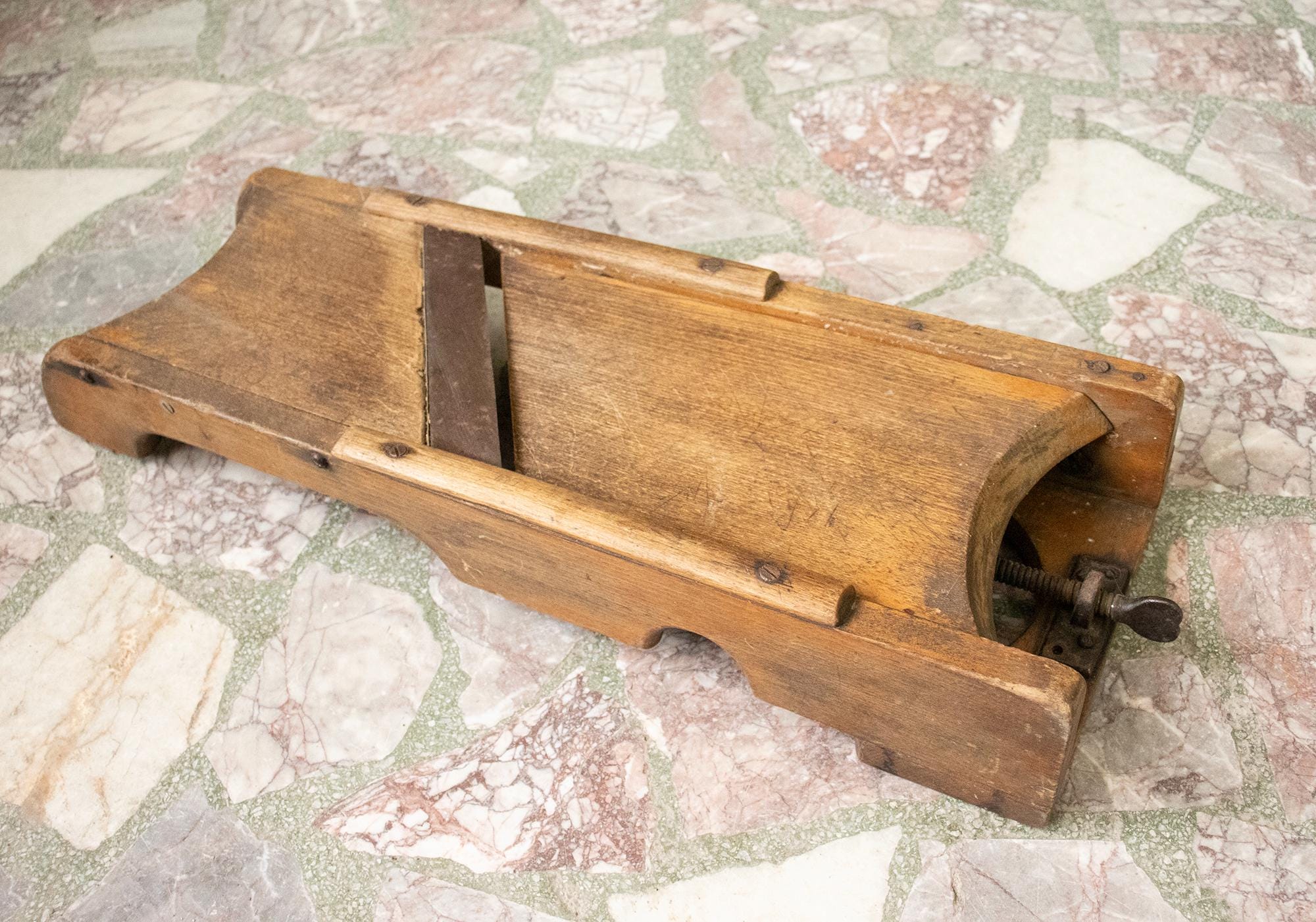 A wonderful vintage wooden cutting tool, traditionally used in rural kitchens and farms. Made entirely of solid wood with a metal blade set into the angled slot, this piece was designed for slicing vegetables, cabbage, or other produce. The curved top and built-in screw mechanism at the end were likely used to secure the tool to a table or working surface during use.