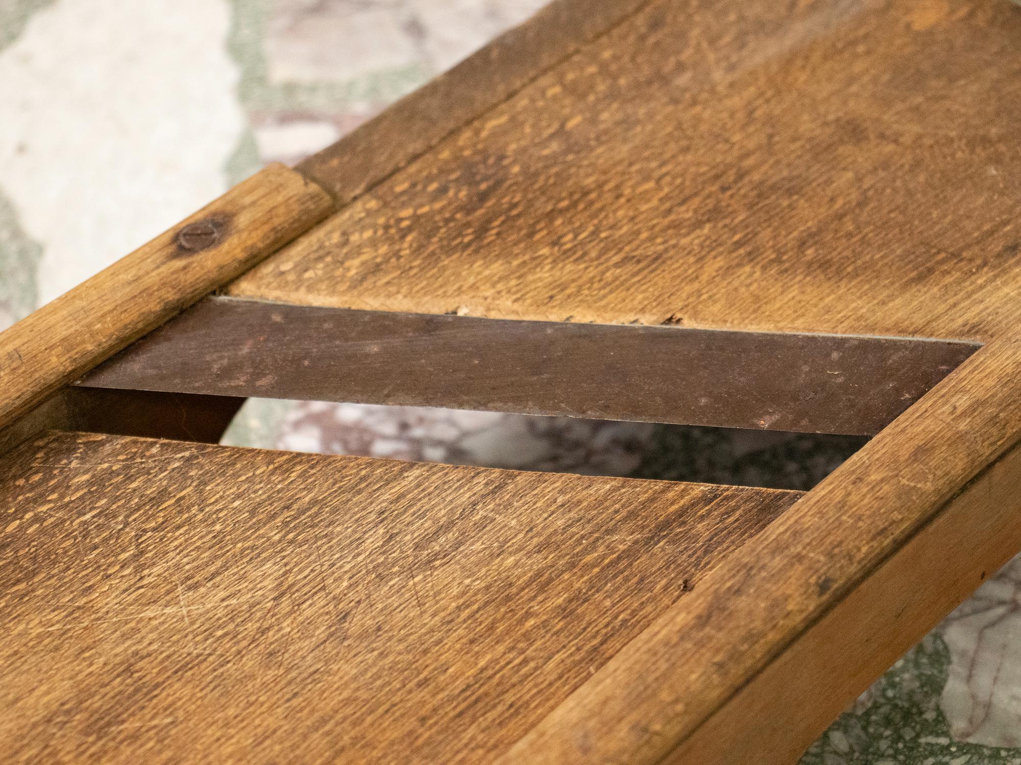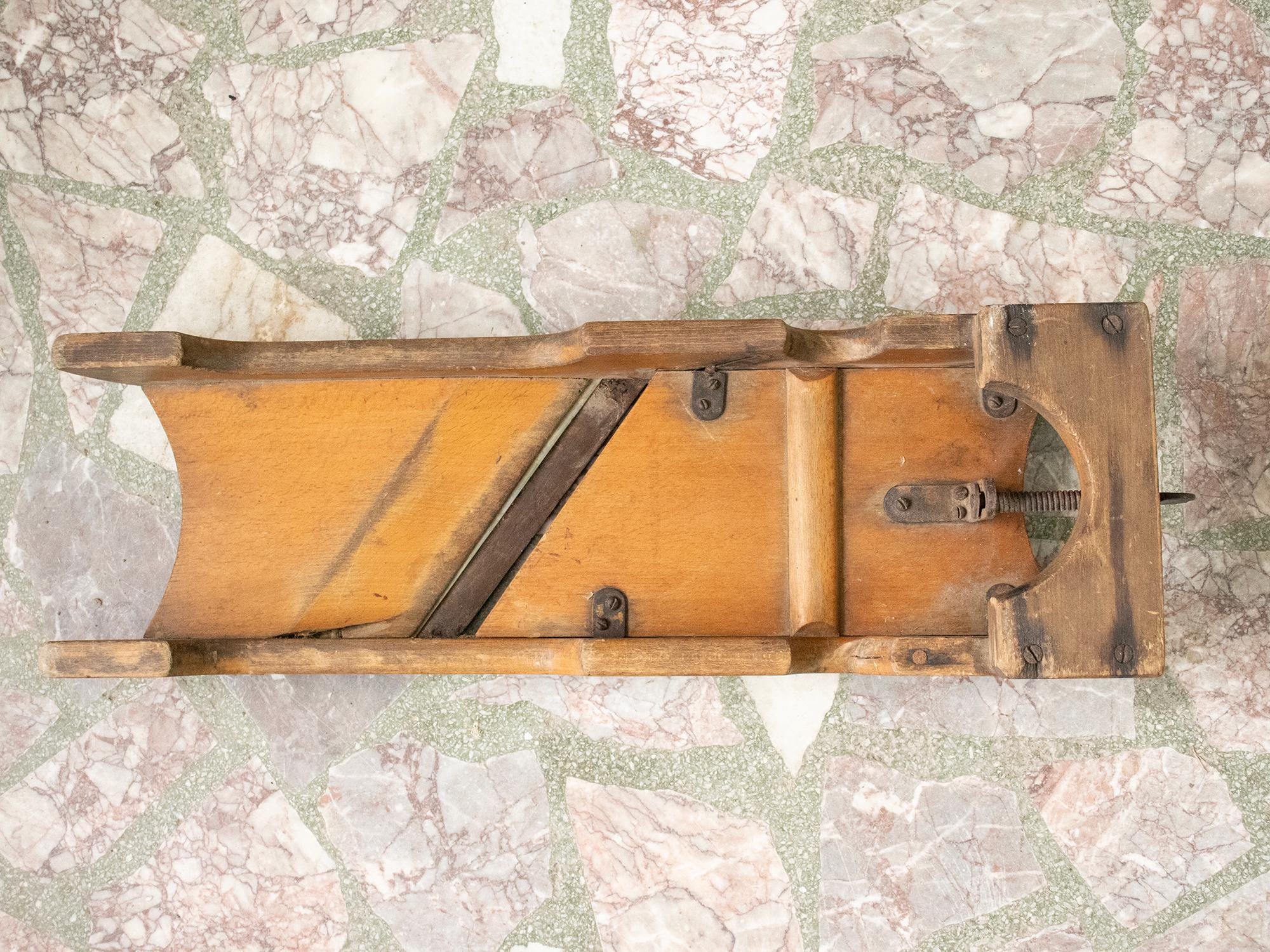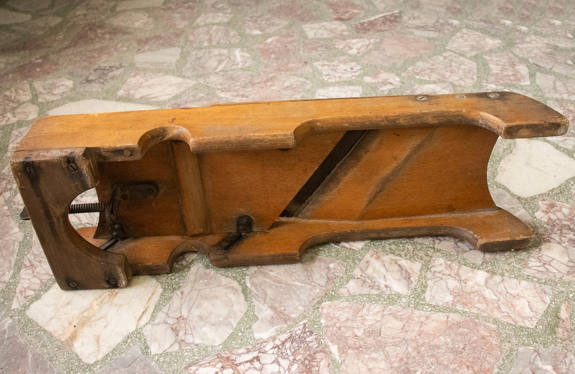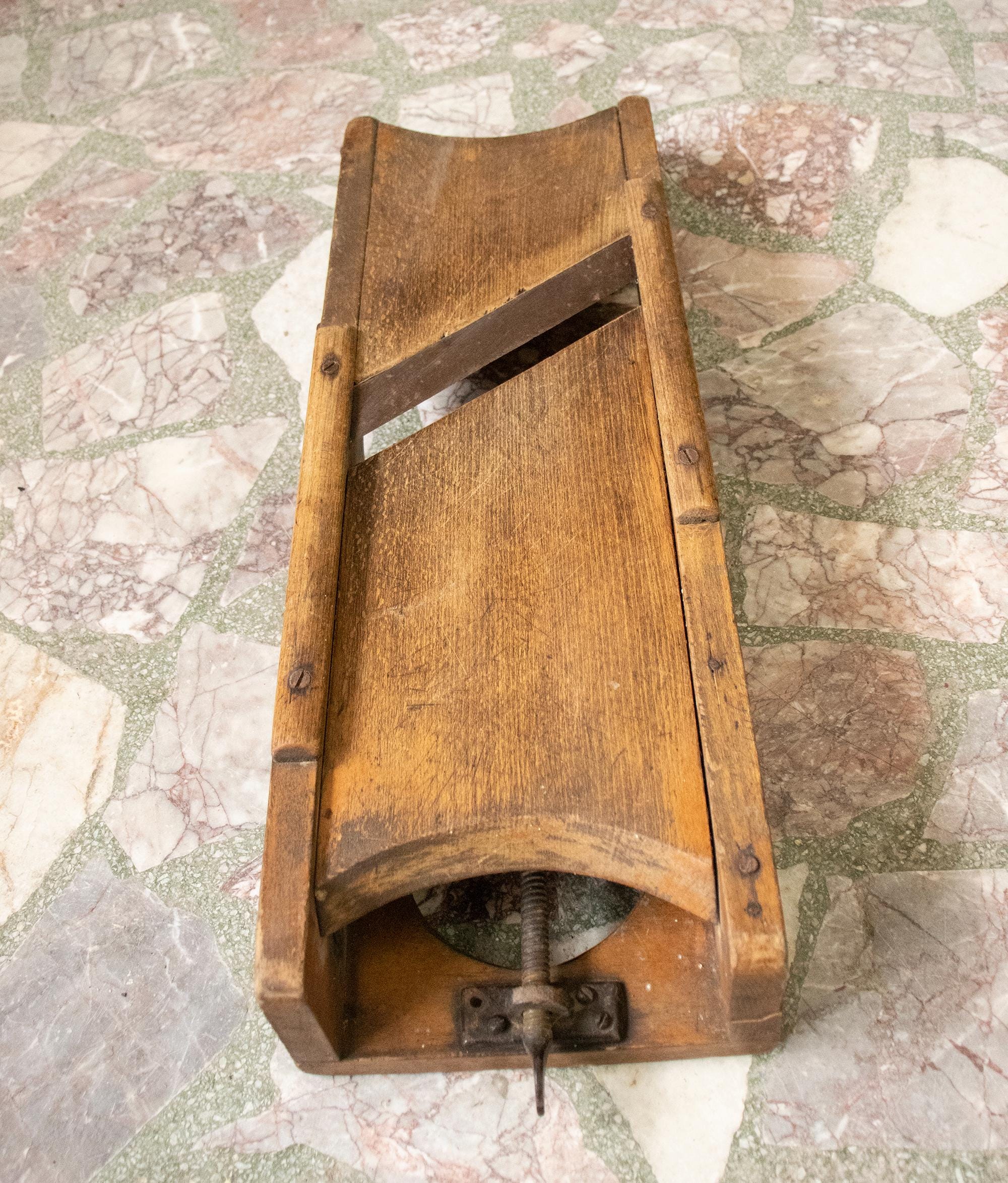 A wonderful vintage wooden cutting tool, traditionally used in rural kitchens and farms. Made entirely of solid wood with a metal blade set into the angled slot, this piece was designed for slicing vegetables, cabbage, or other produce. The curved top and built-in screw mechanism at the end were likely used to secure the tool to a table or working surface during use.