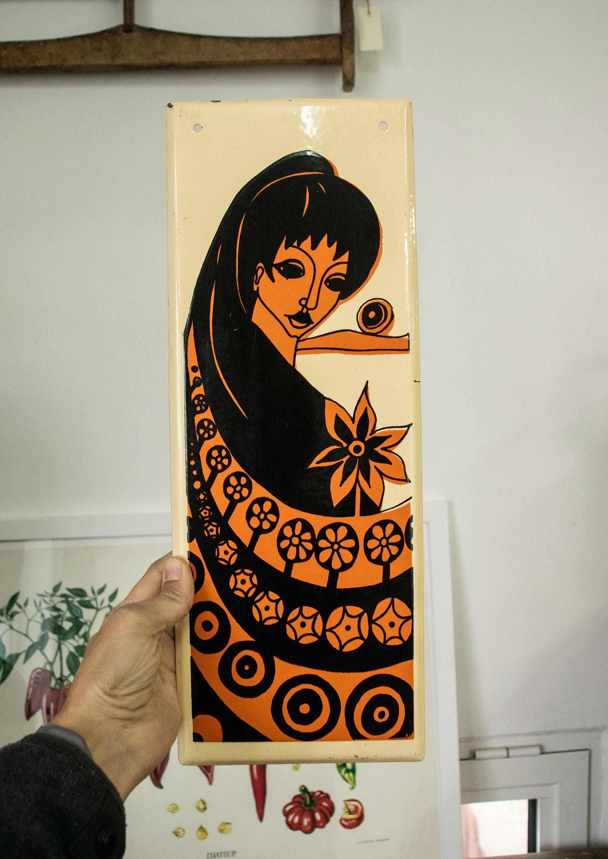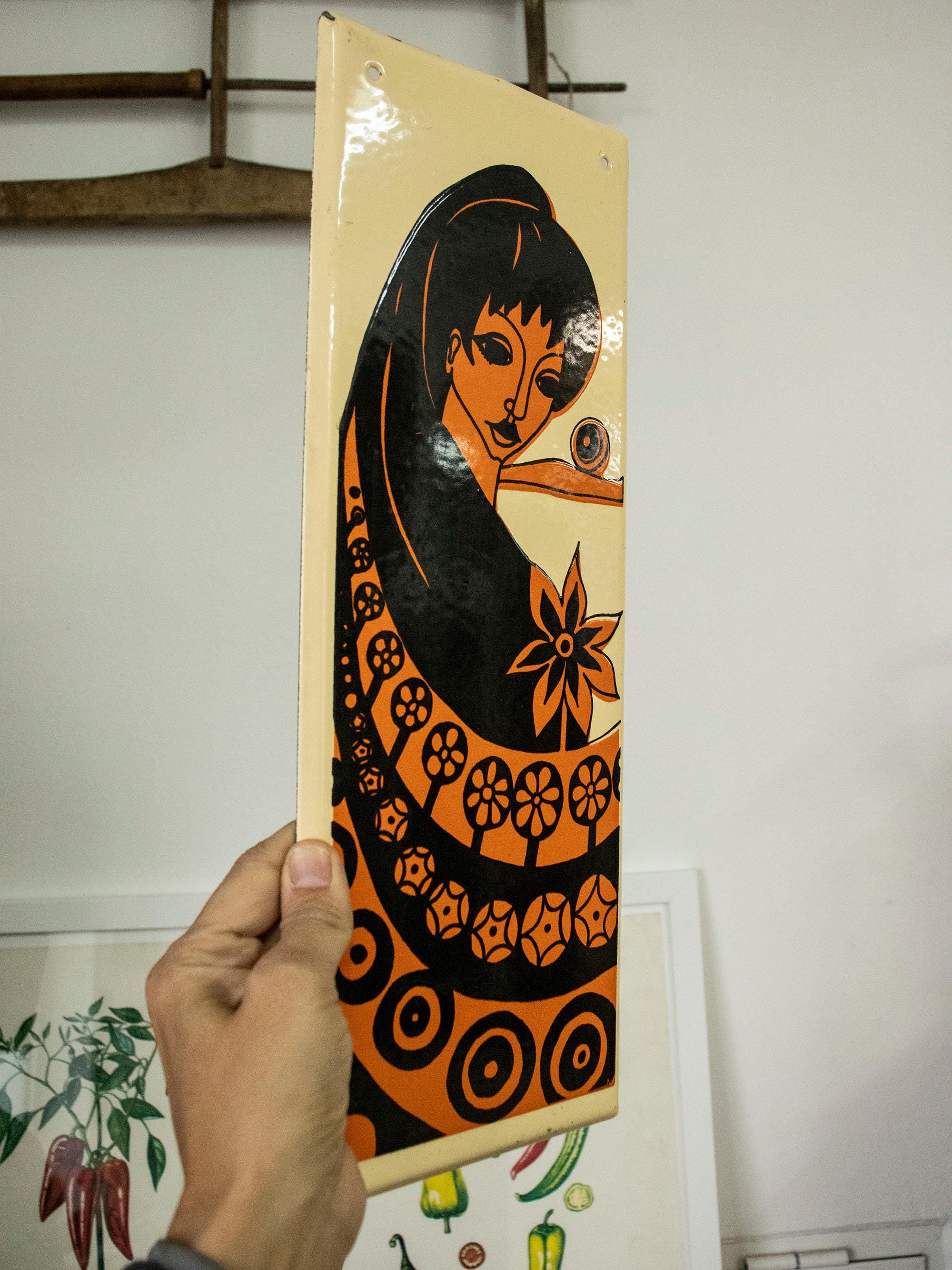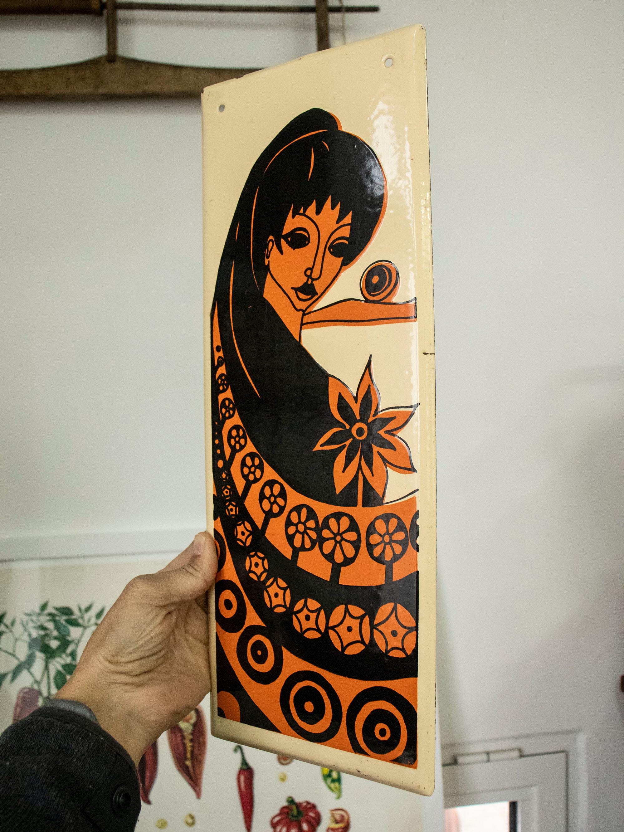 A beautiful vintage Hungarian enamel sign featuring a bold mid-century illustration in orange and black. The graphic shows a stylized woman with flowing hair and geometric floral motifs — a wonderful example of Eastern European design from the 1960s–1970s. The colours are vivid, the lines are sharp, and the composition has that unmistakable retro charm typical of Hungarian public and decorative signage of the era.