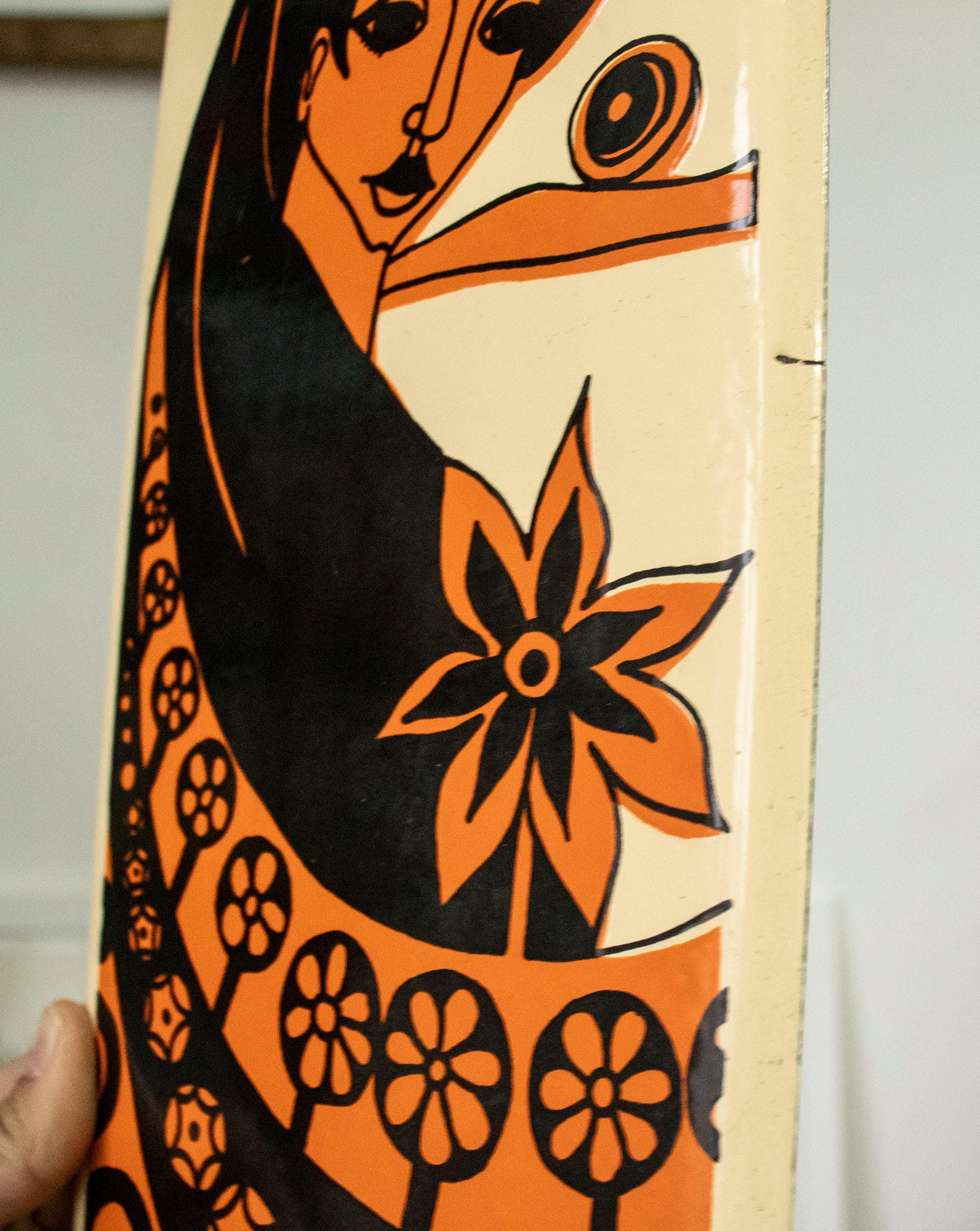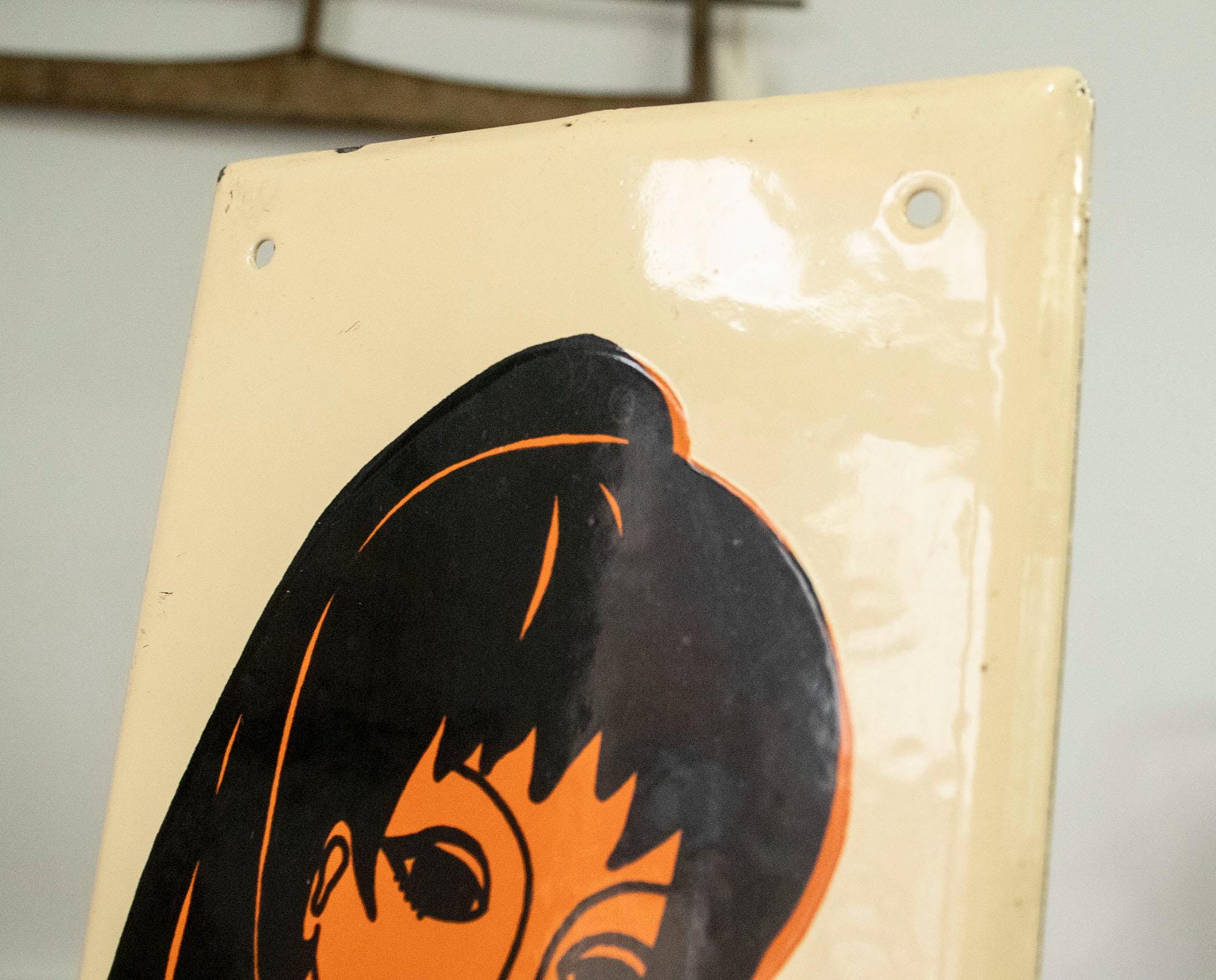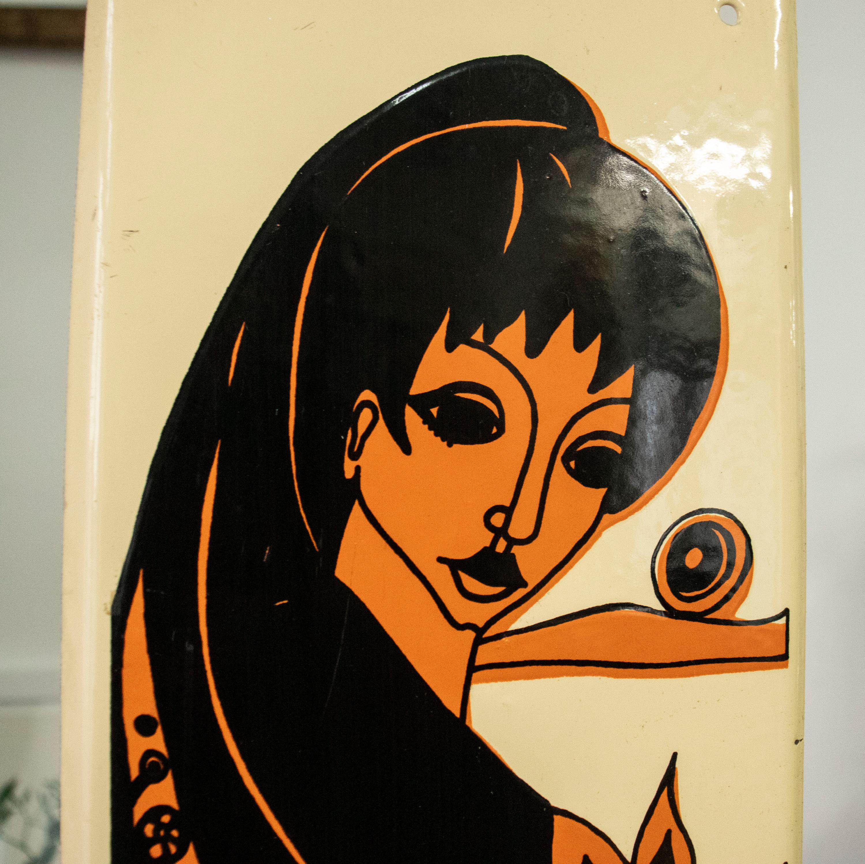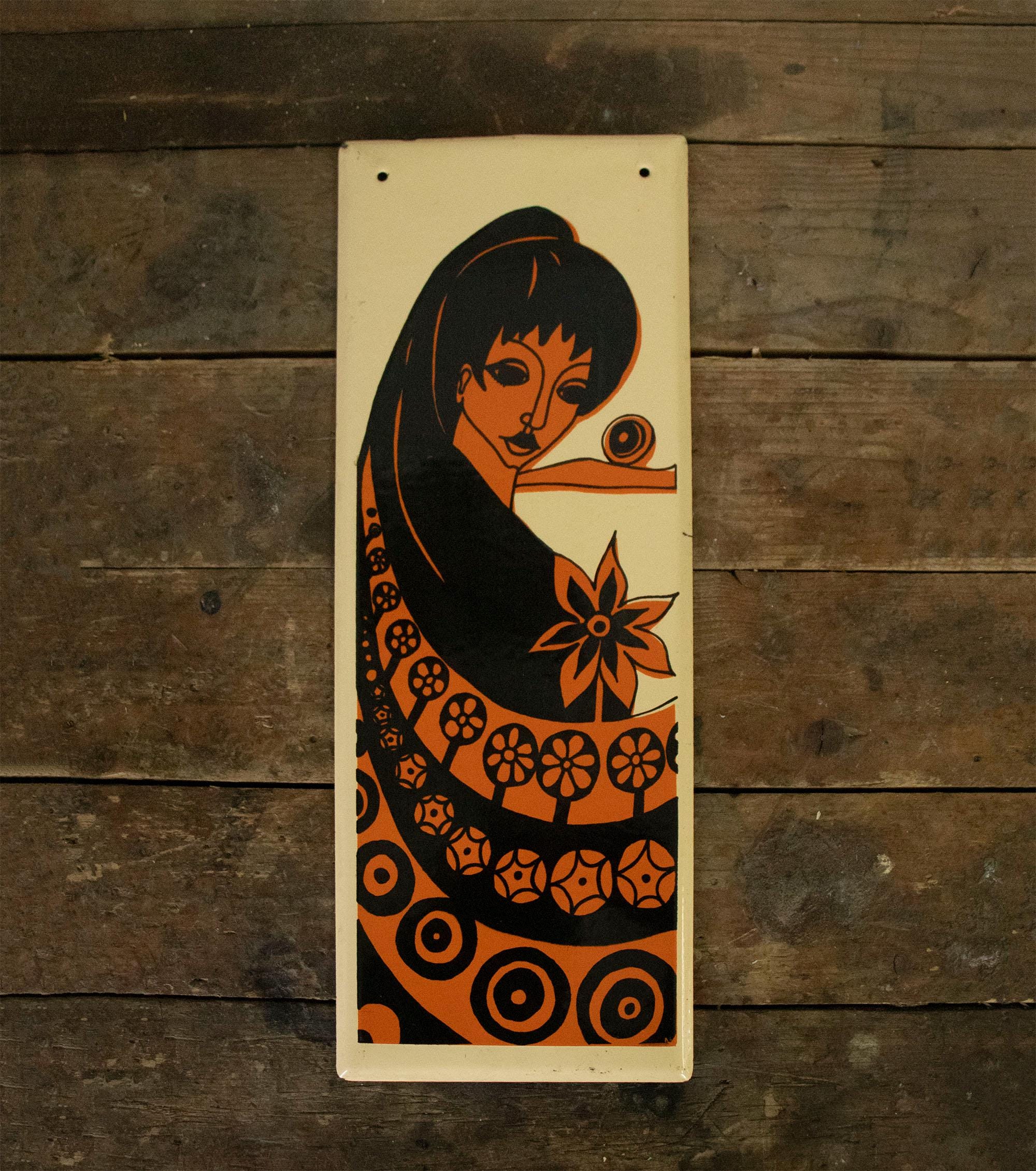 A beautiful vintage Hungarian enamel sign featuring a bold mid-century illustration in orange and black. The graphic shows a stylized woman with flowing hair and geometric floral motifs — a wonderful example of Eastern European design from the 1960s–1970s. The colours are vivid, the lines are sharp, and the composition has that unmistakable retro charm typical of Hungarian public and decorative signage of the era.