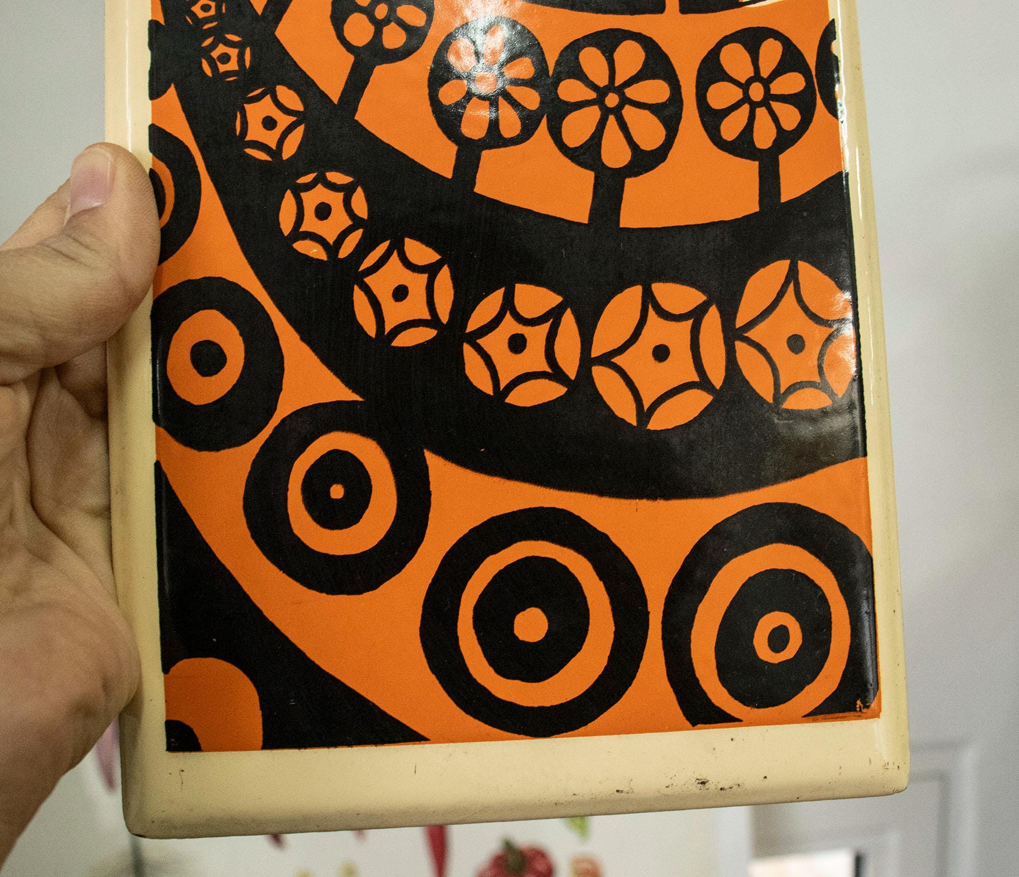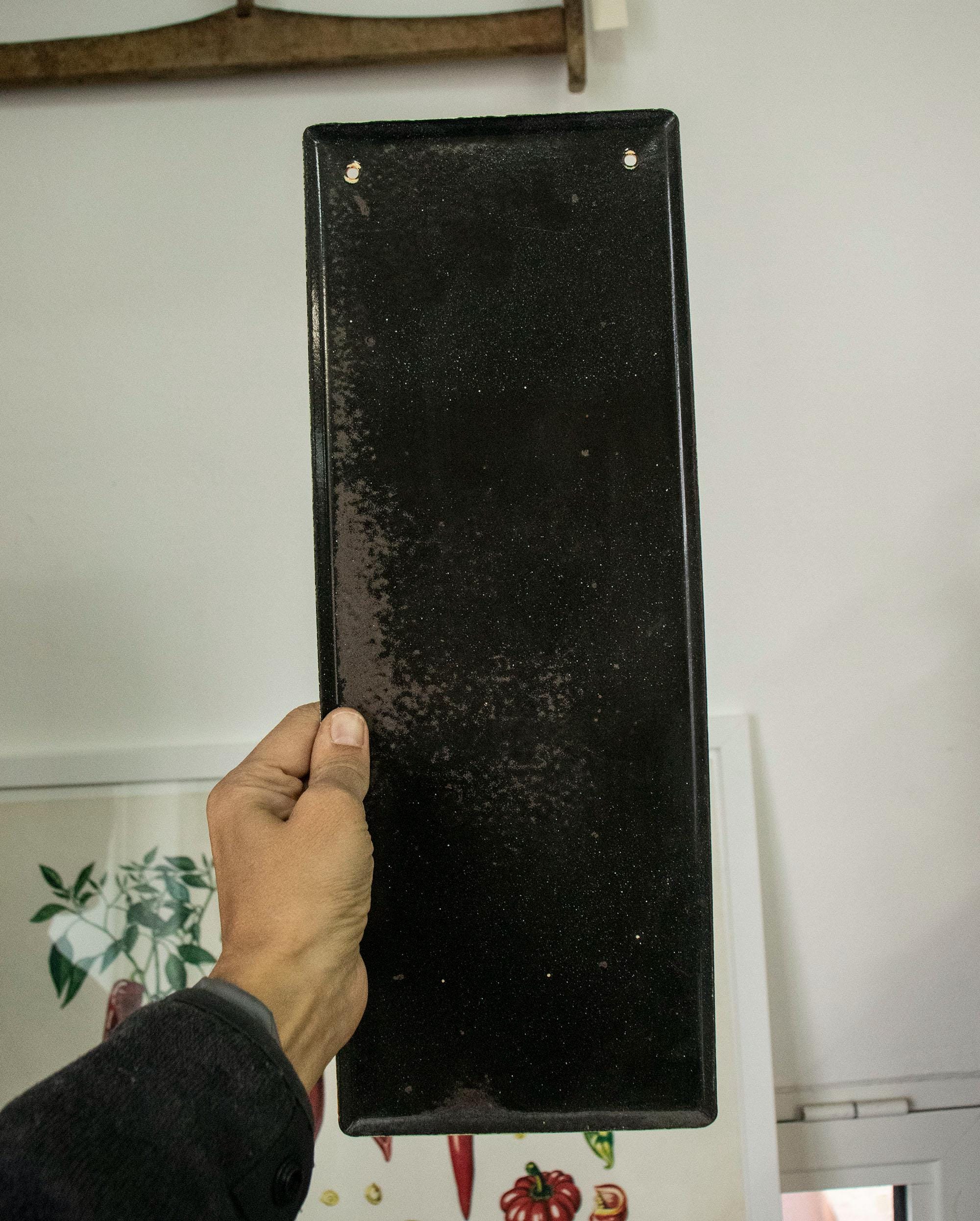 The enamel has a glossy finish with small signs of age, including tiny chips, surface marks and light wear around the edges — all consistent with genuine vintage enamel. A striking piece for collectors of enamel graphics, retro design enthusiasts, or anyone looking for an eye-catching wall accent.
