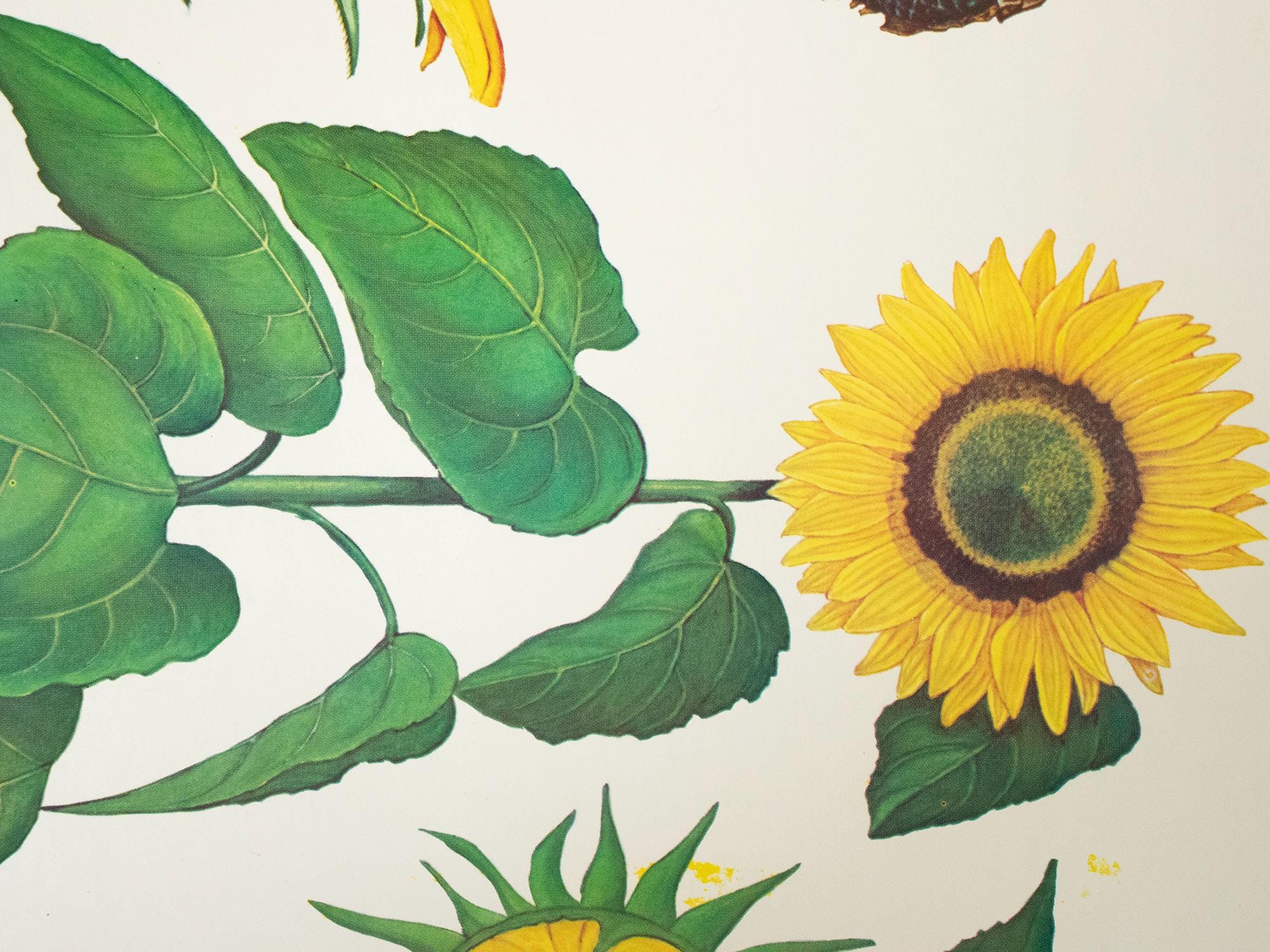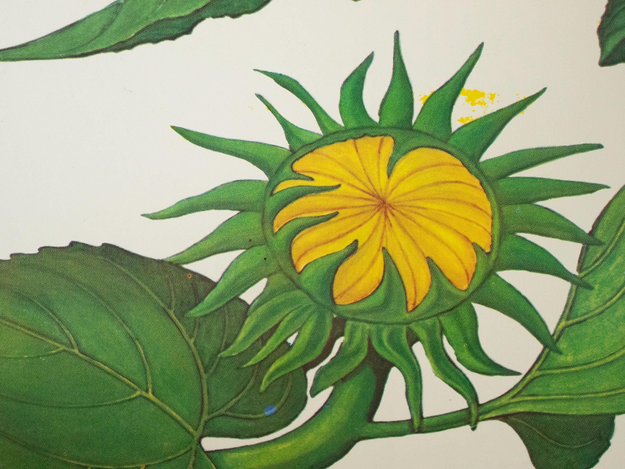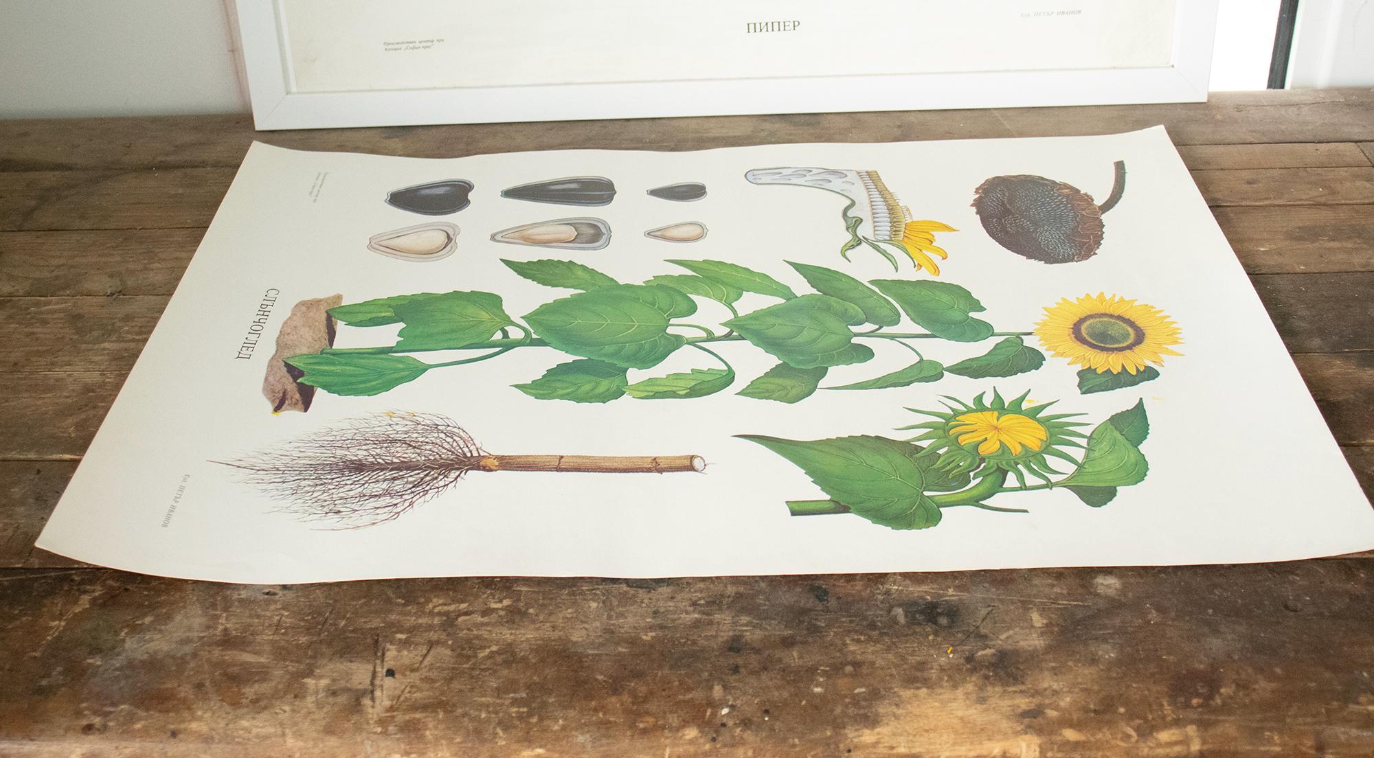 A beautiful vintage botanical school print from Bulgaria, featuring a detailed scientific illustration of the sunflower (Слънчоглед). This educational wall chart was used in Bulgarian classrooms and is part of the classic mid-century series of biology and botany teaching aids.