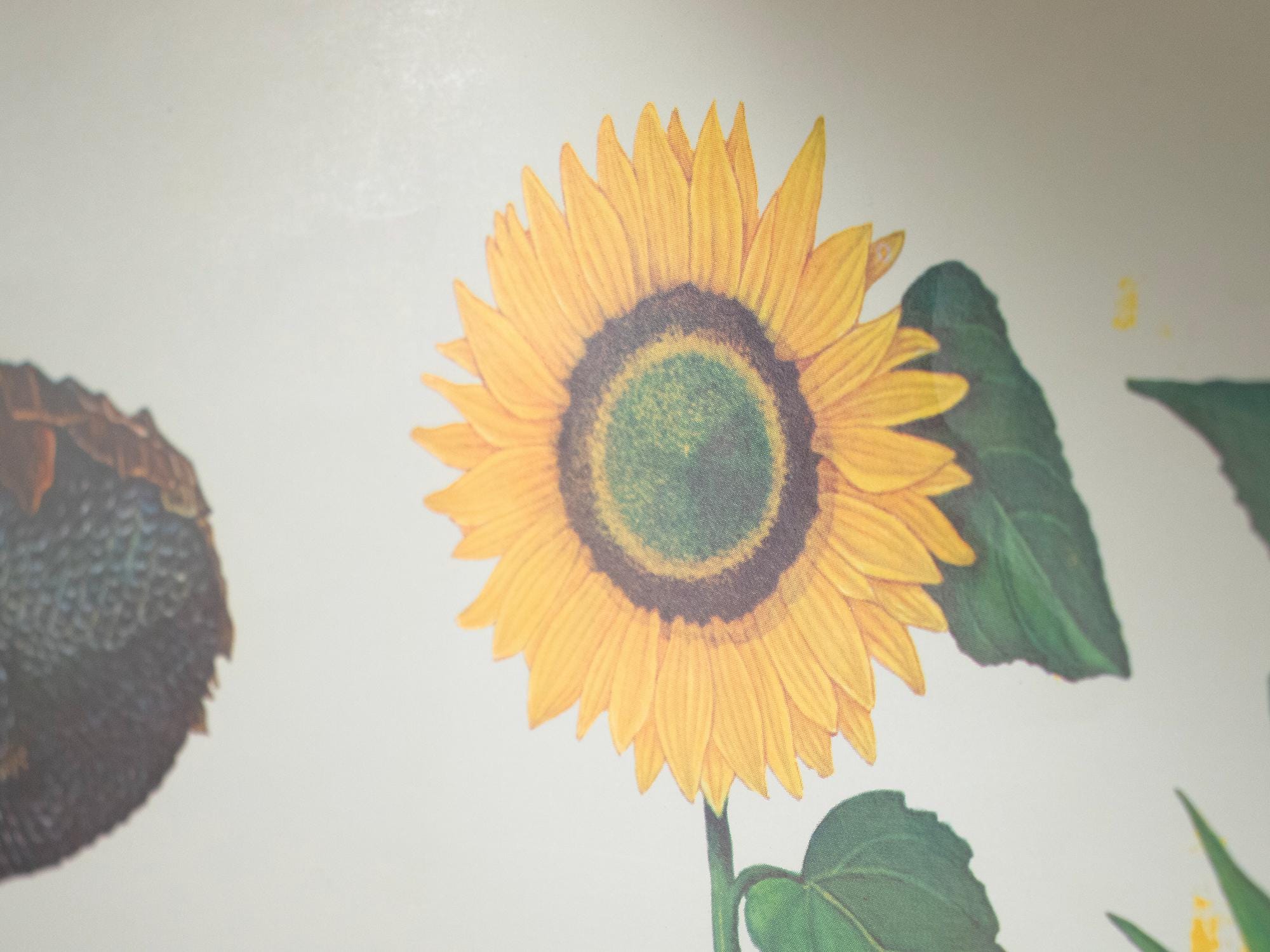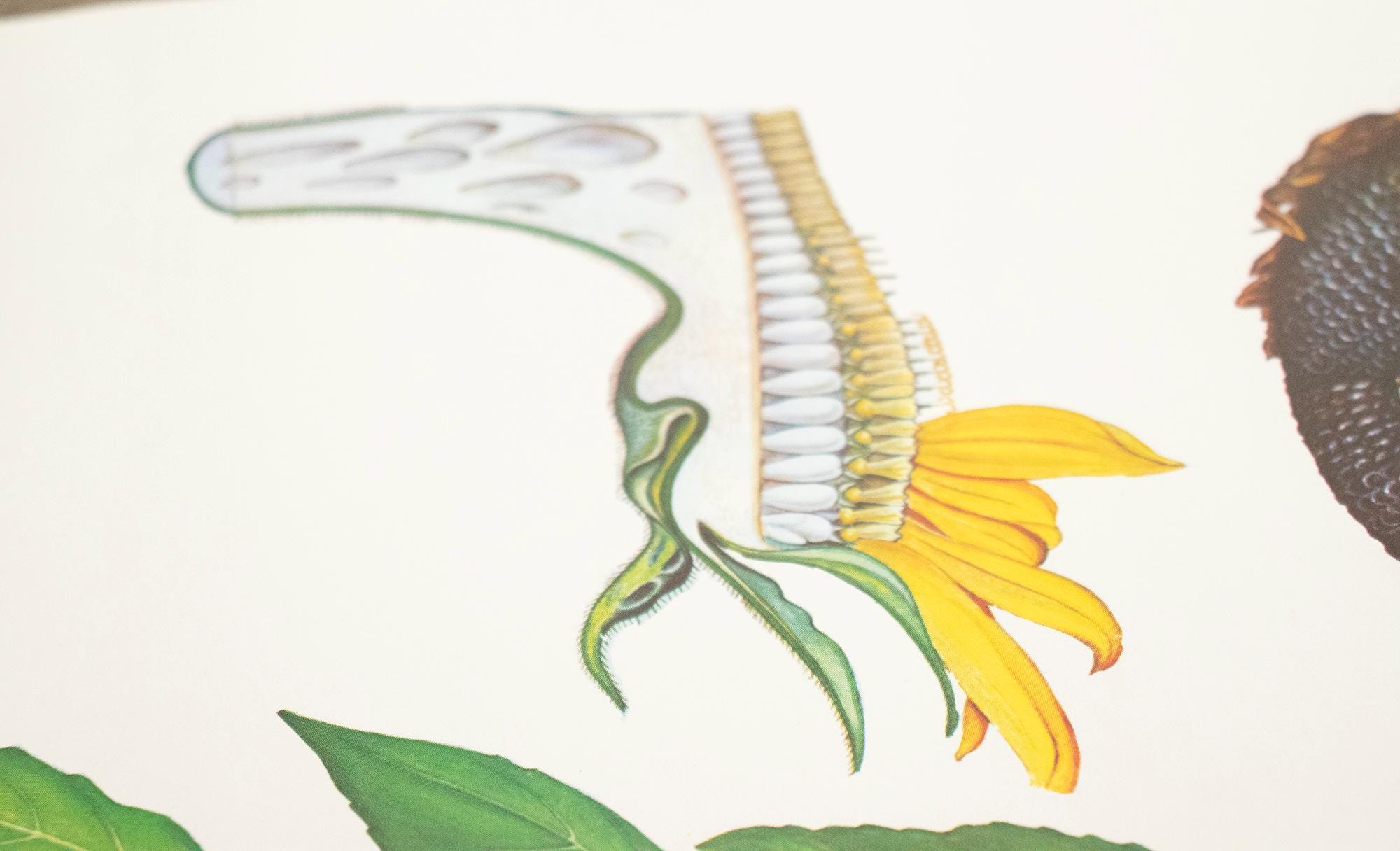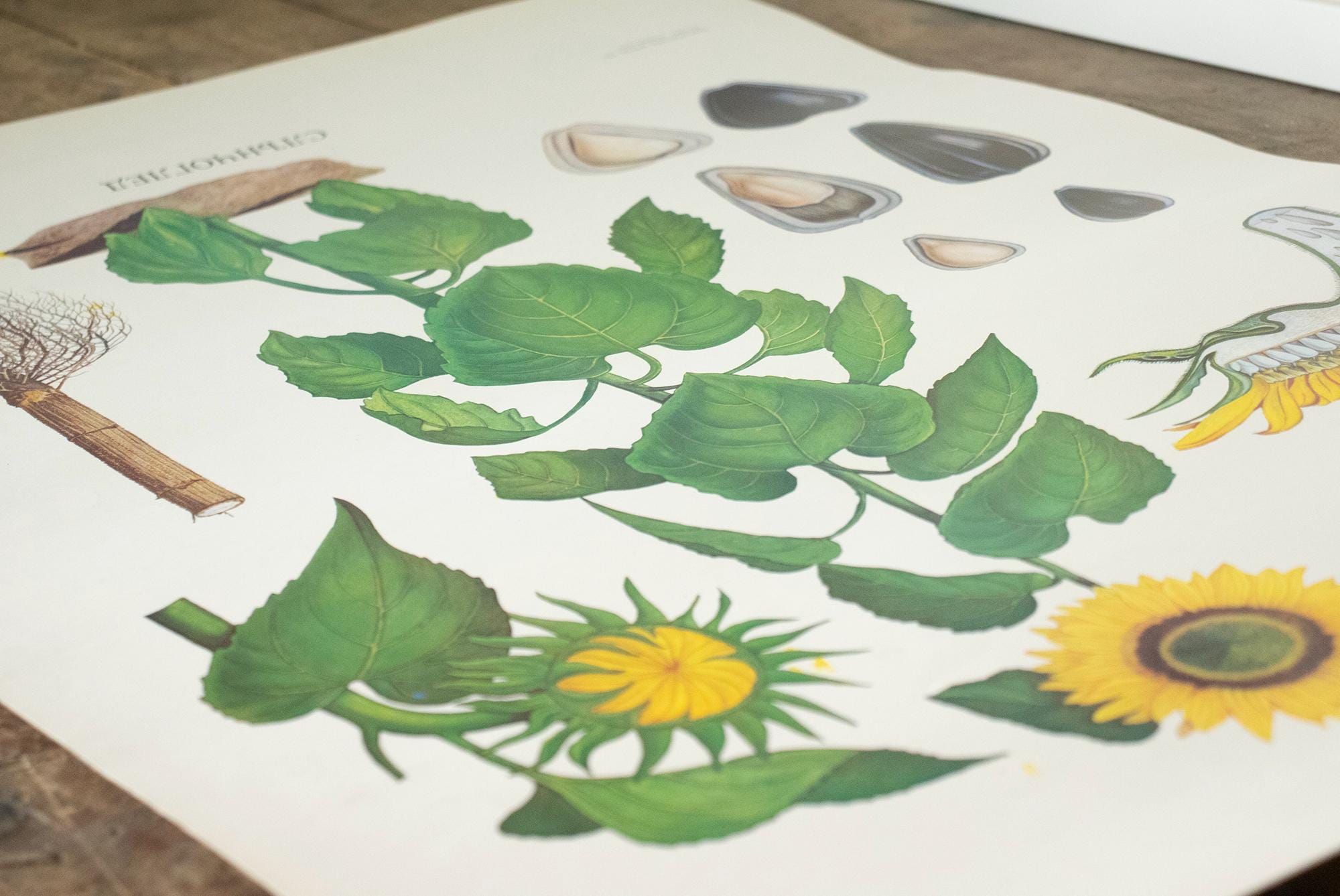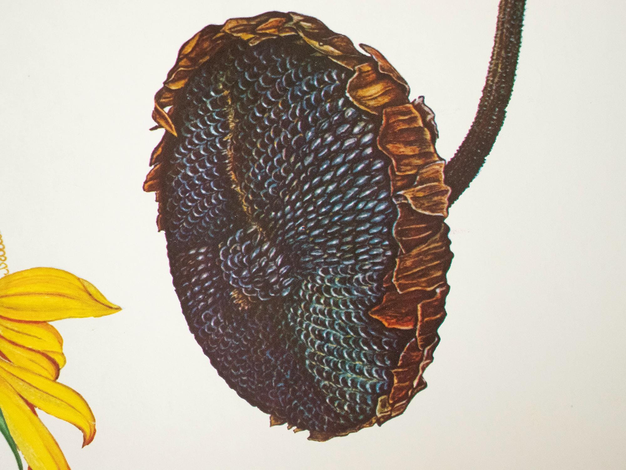 A beautiful vintage botanical school print from Bulgaria, featuring a detailed scientific illustration of the sunflower (Слънчоглед). This educational wall chart was used in Bulgarian classrooms and is part of the classic mid-century series of biology and botany teaching aids.