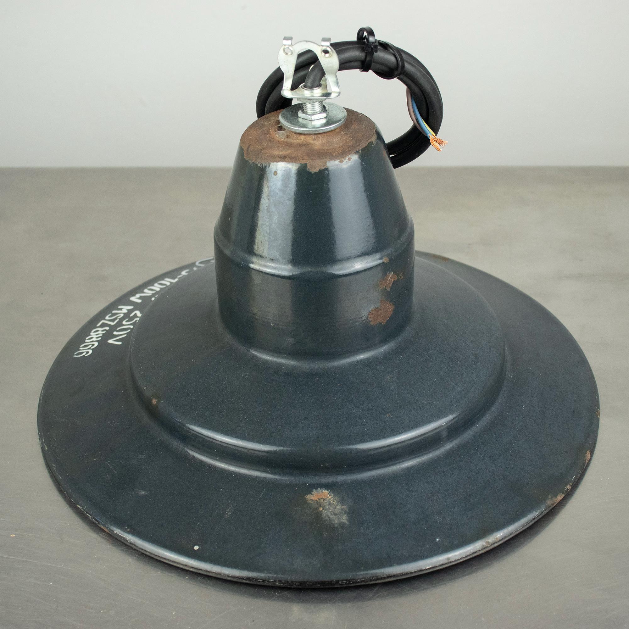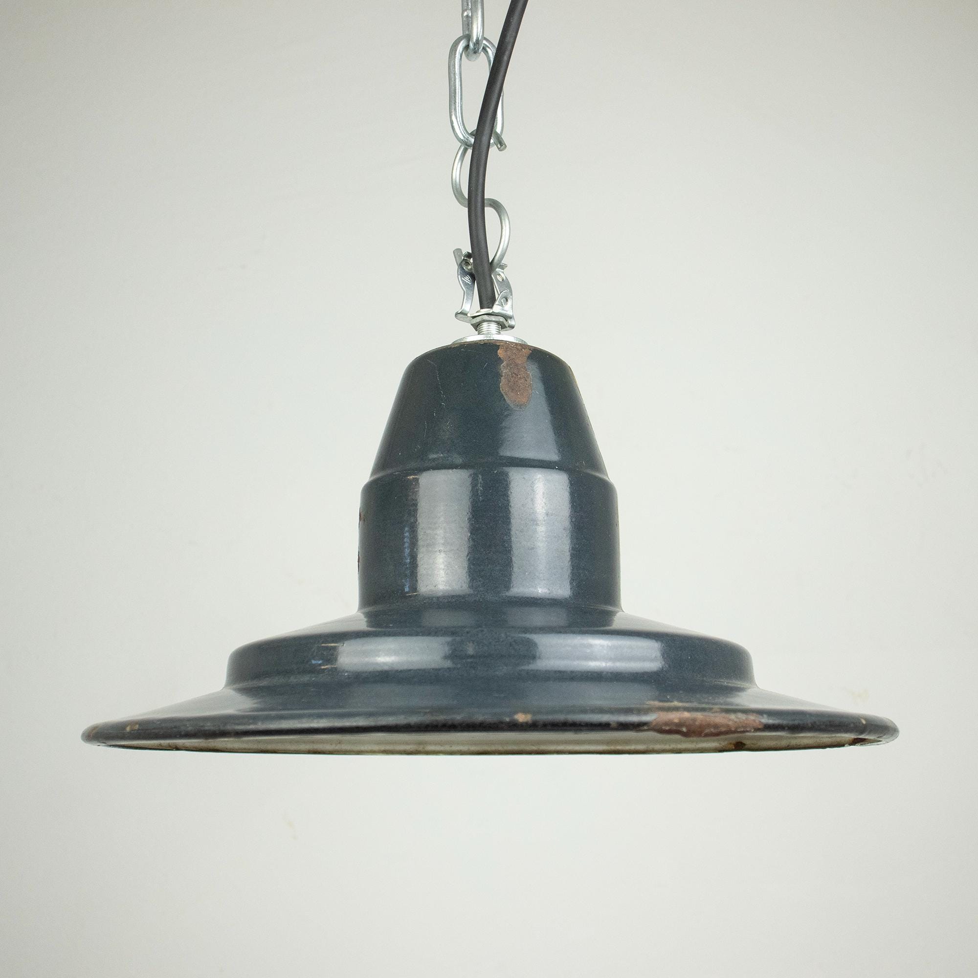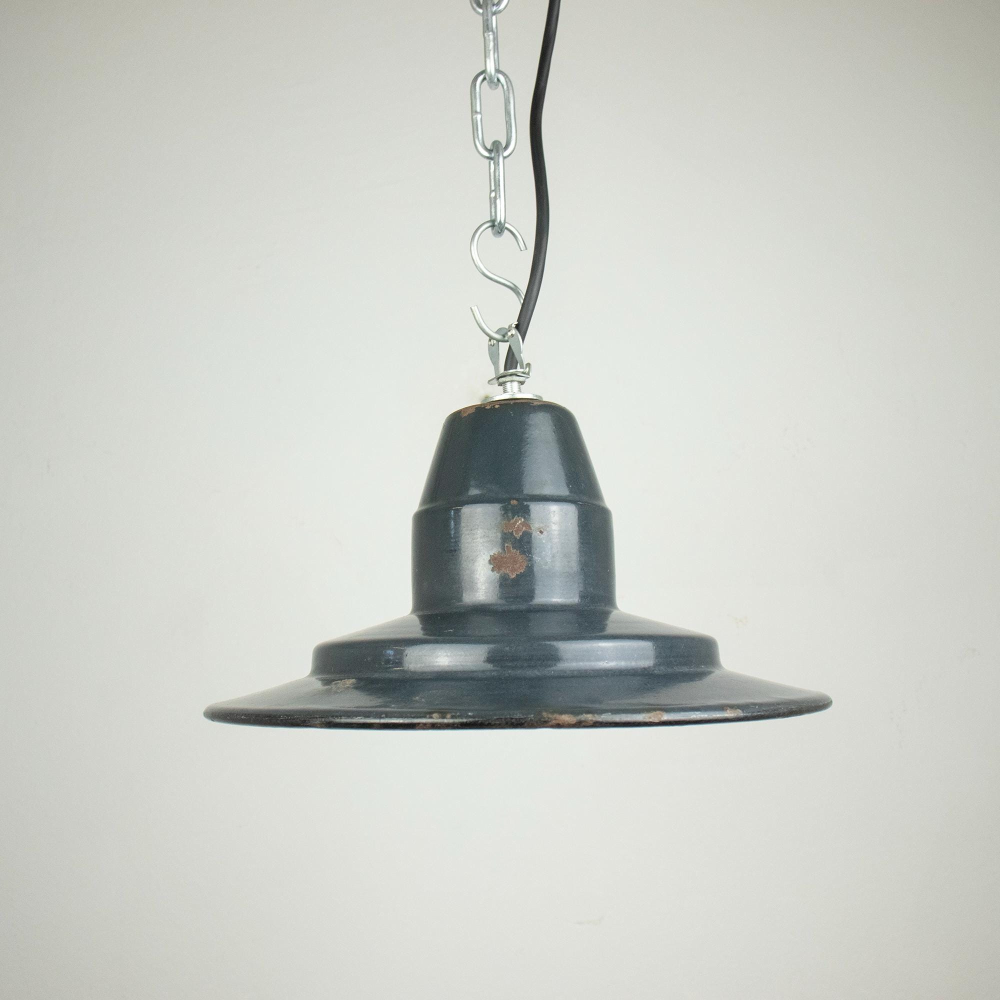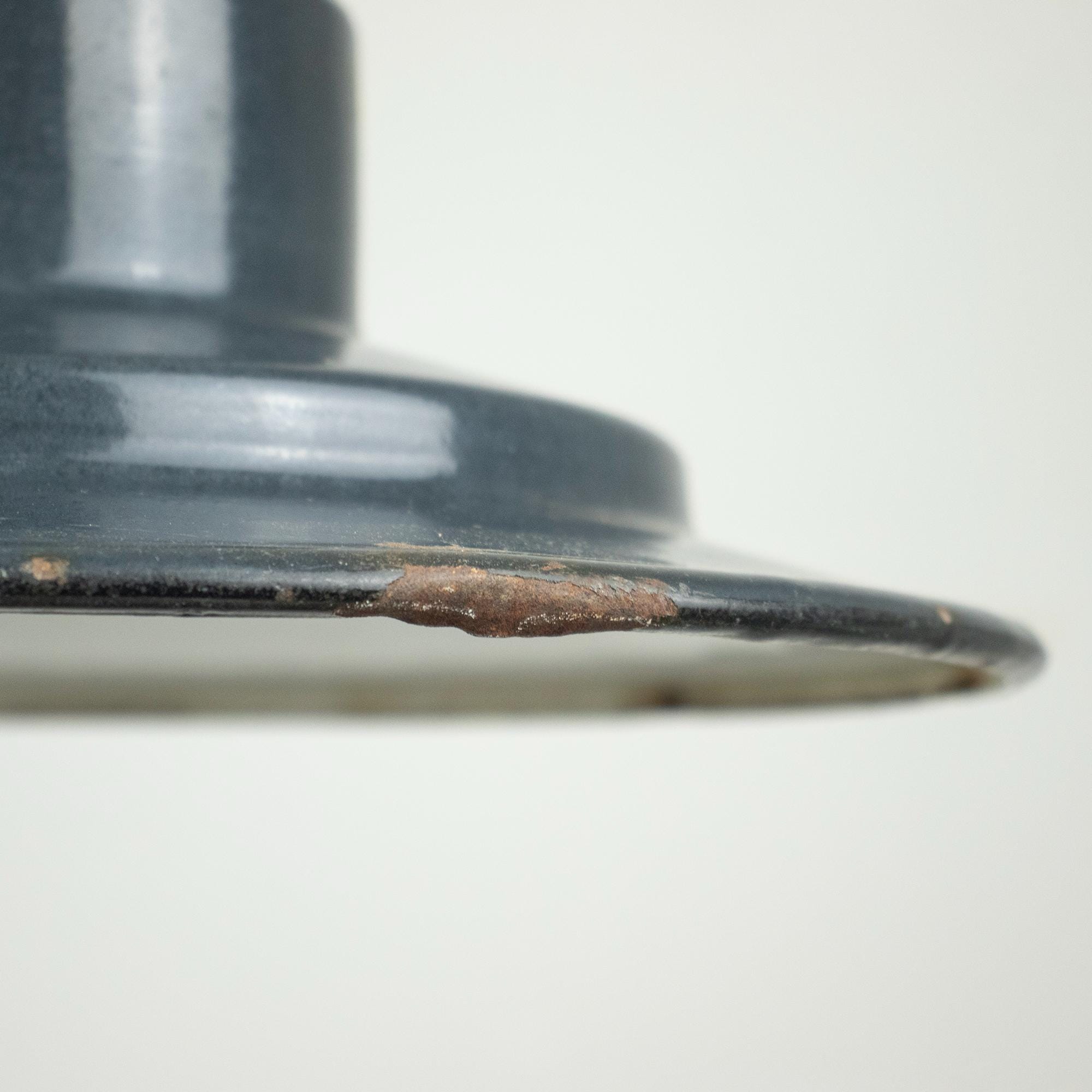 This classic factory shade has a dark grey enamel finish with beautiful wear, small chips, and patina from decades of use — all the honest signs that make these lights so charming.