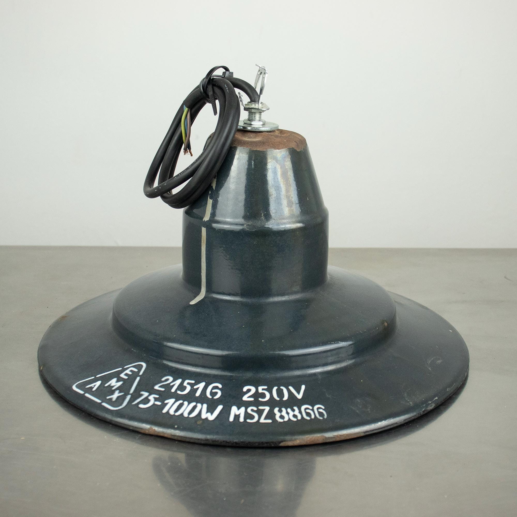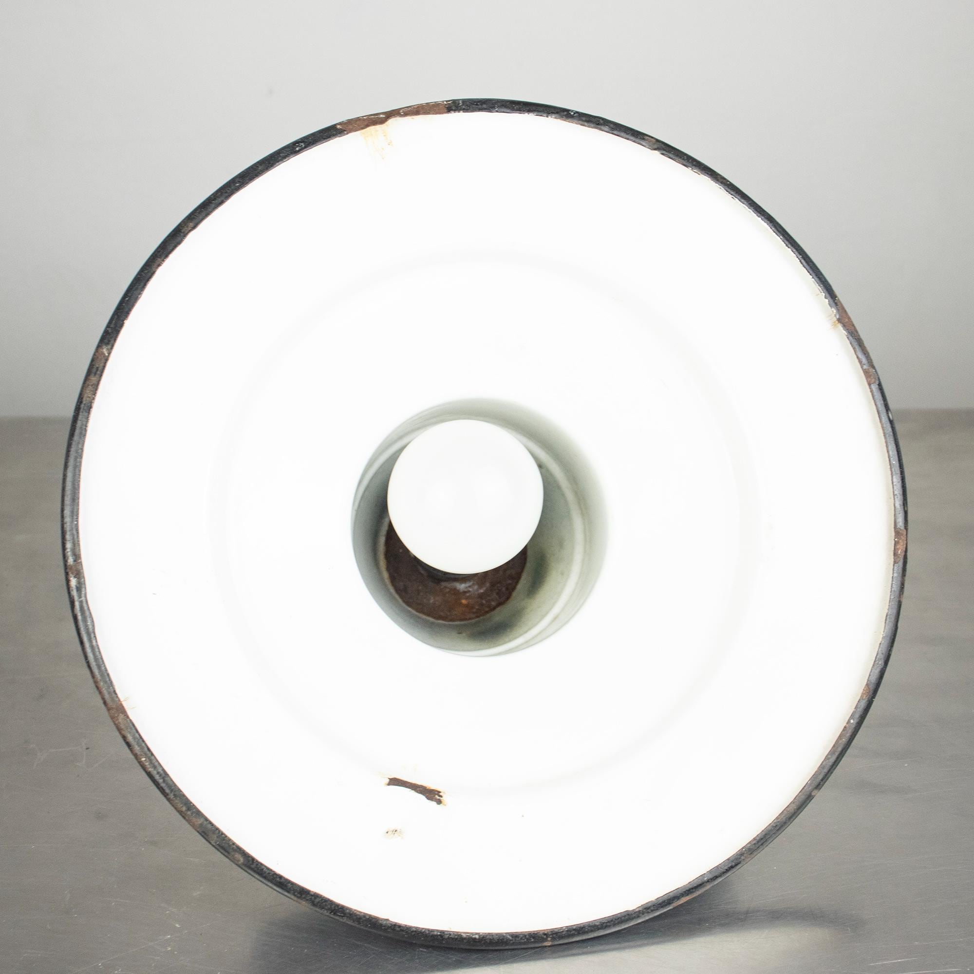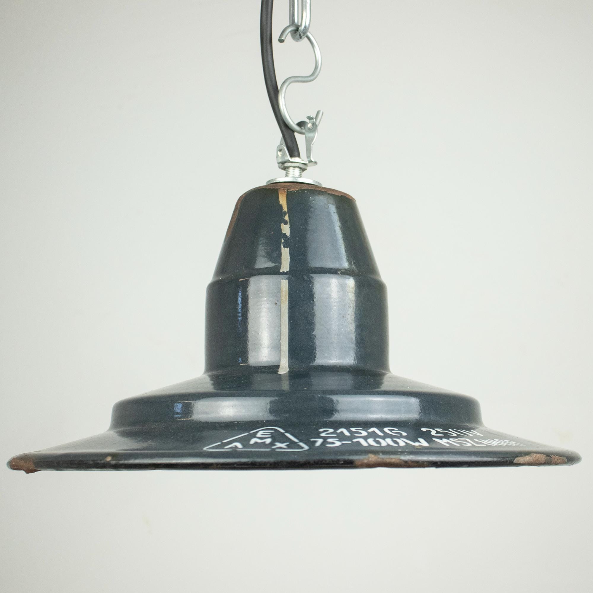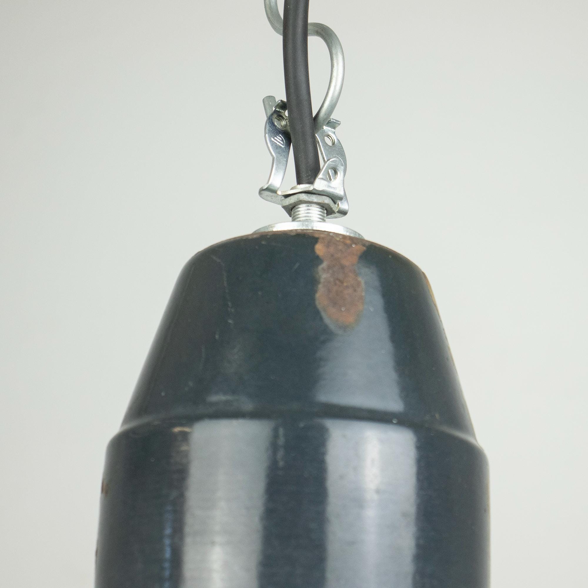 This classic factory shade has a dark grey enamel finish with beautiful wear, small chips, and patina from decades of use — all the honest signs that make these lights so charming.